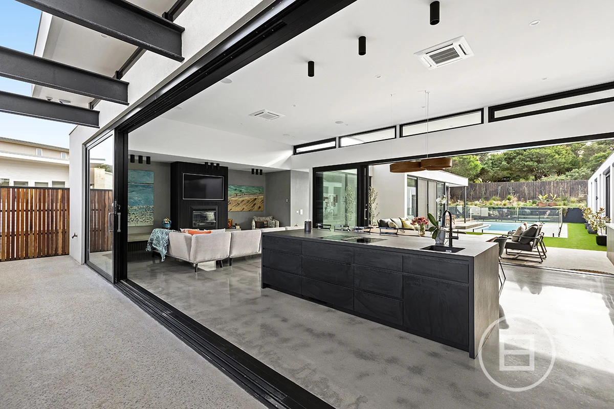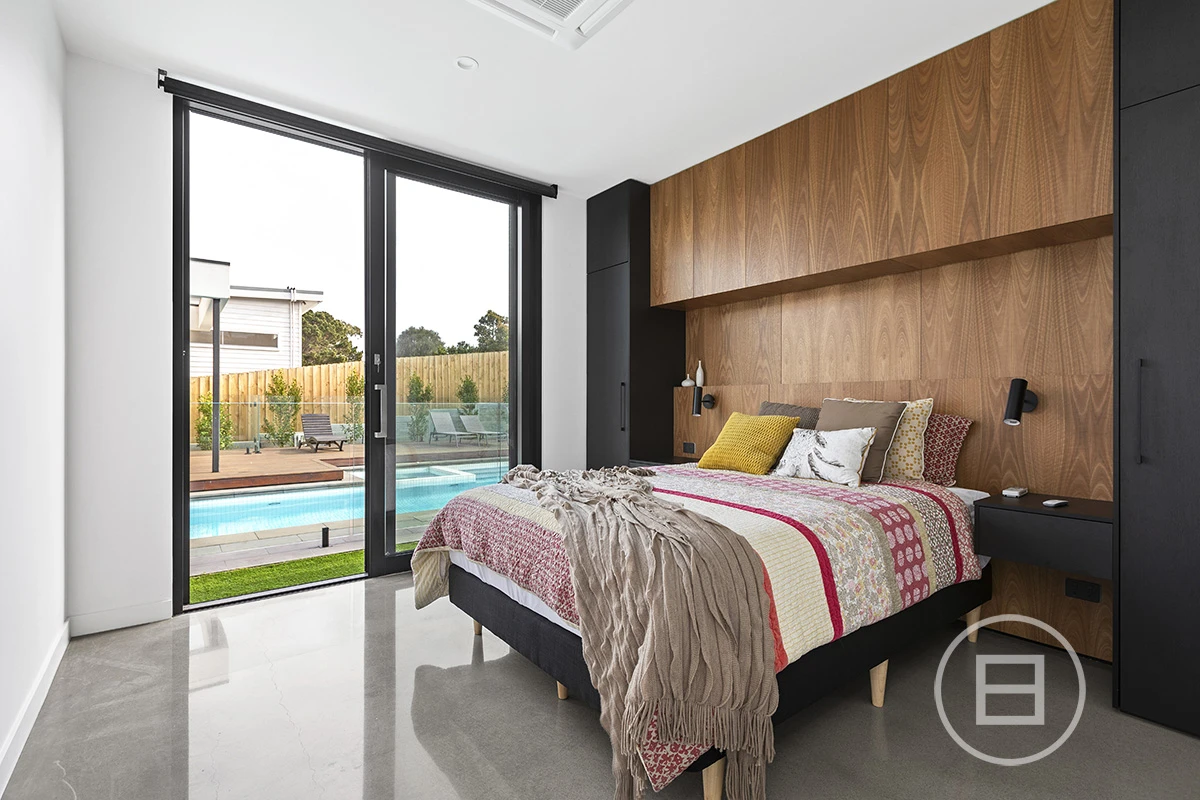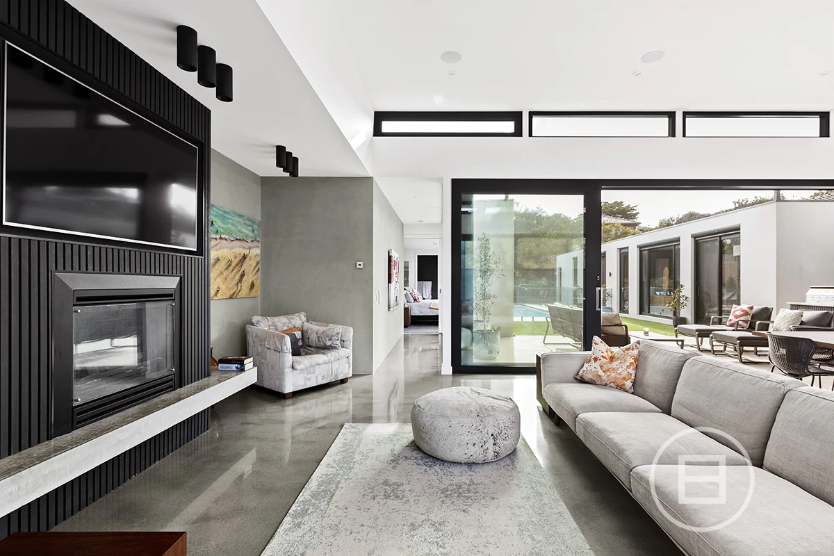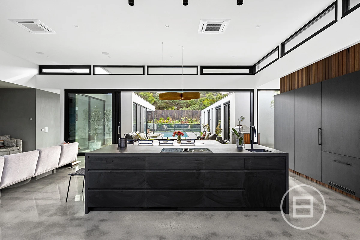 The home is positioned in a U-Shape around the central pool and spa, with a master wing being separated from the guest wing by the large open plan kitchen/dining/entertaining areas. Polished concrete flooring with hydronic slab heating throughout, and a great use of porcelain stone benchtops, spotted gum timbers, and contemporary architecture, the property is visually appealing to the eye. A butlers pantry, temperature controlled wine fridge, hidden bar, cinema room, and gas log fireplace set the standard in luxury and feel.