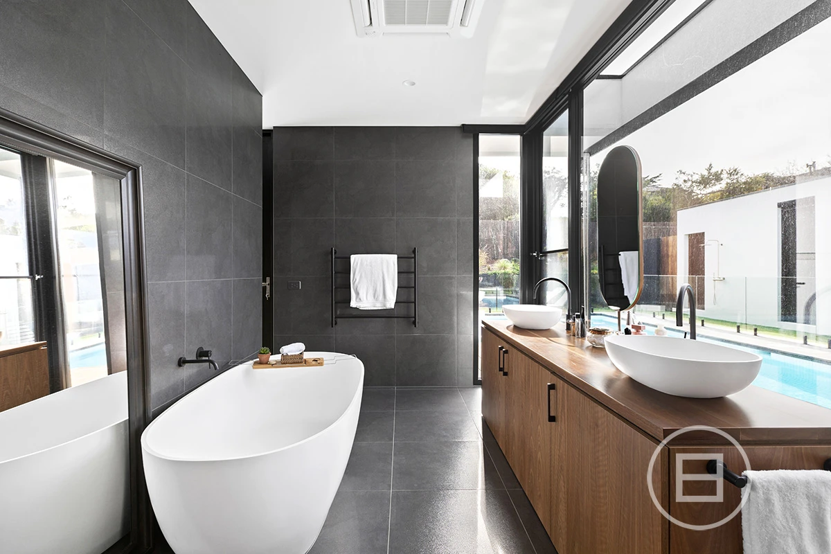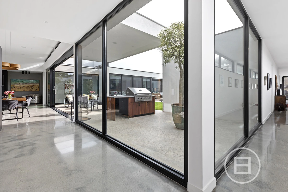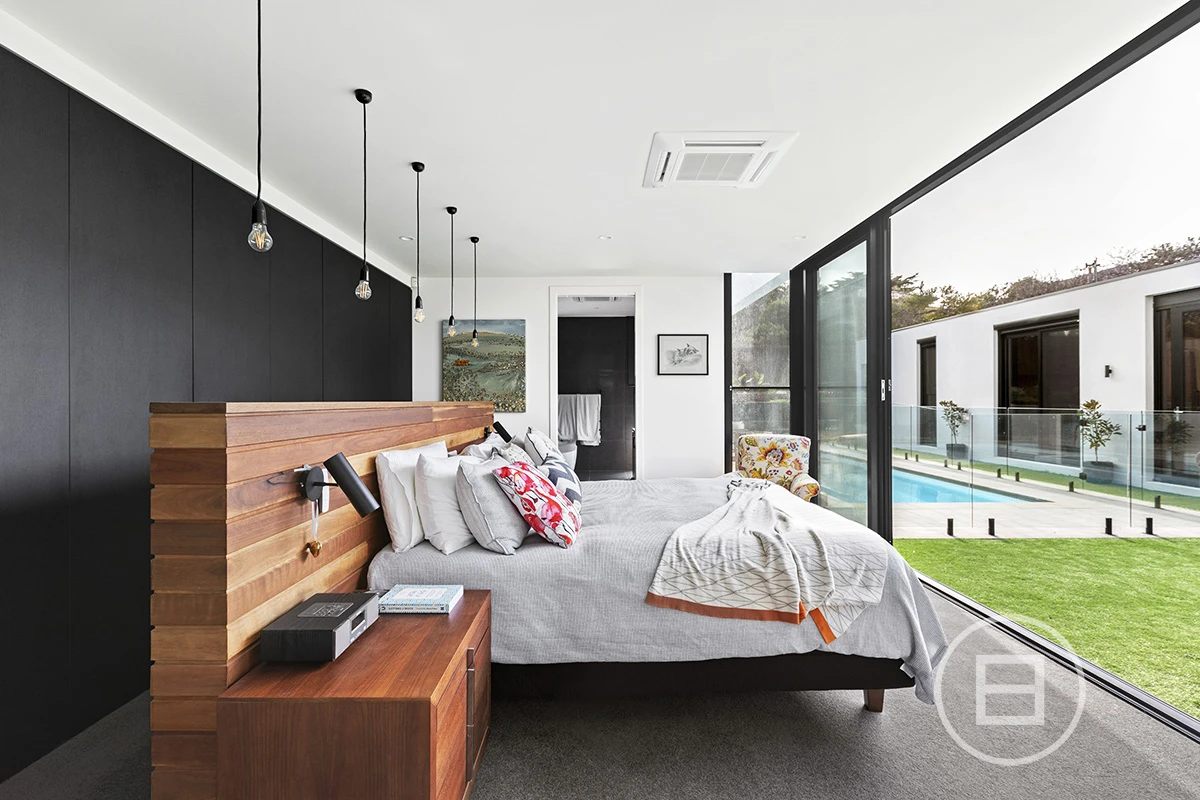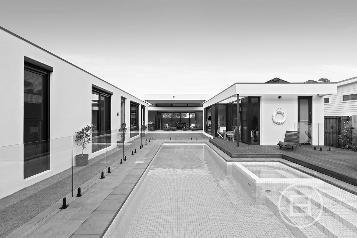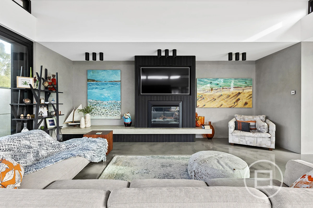 The home is positioned in a U-Shape around the central pool and spa, with a master wing being separated from the guest wing by the large open plan kitchen/dining/entertaining areas. Polished concrete flooring with hydronic slab heating throughout, and a great use of porcelain stone benchtops, spotted gum timbers, and contemporary architecture, the property is visually appealing to the eye. A butlers pantry, temperature controlled wine fridge, hidden bar, cinema room, and gas log fireplace set the standard in luxury and feel.