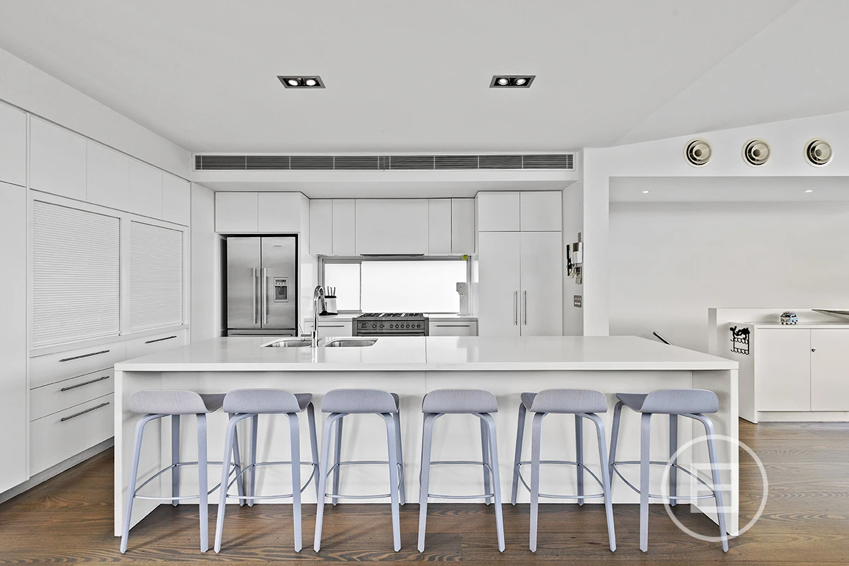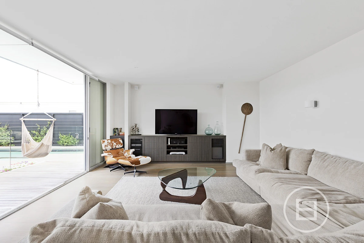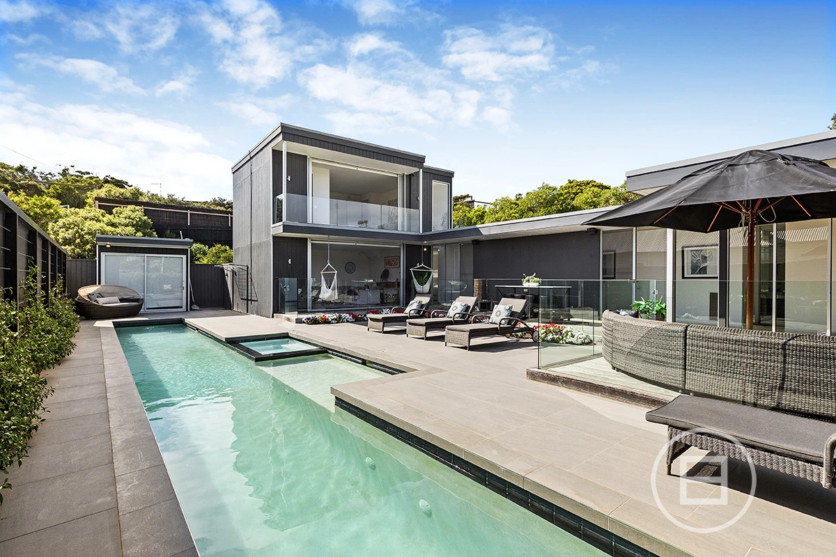 The living room is drenched in natural light as its northern orientation and raked ceiling allows the sun to filter through effortlessly. The large kitchen and dining sits adjacent to this area and the glass bi-folds step out onto a wrap around deck, outdoor dining and pool with beach area and spa.