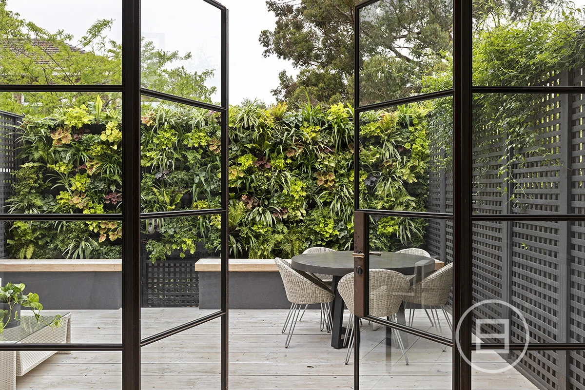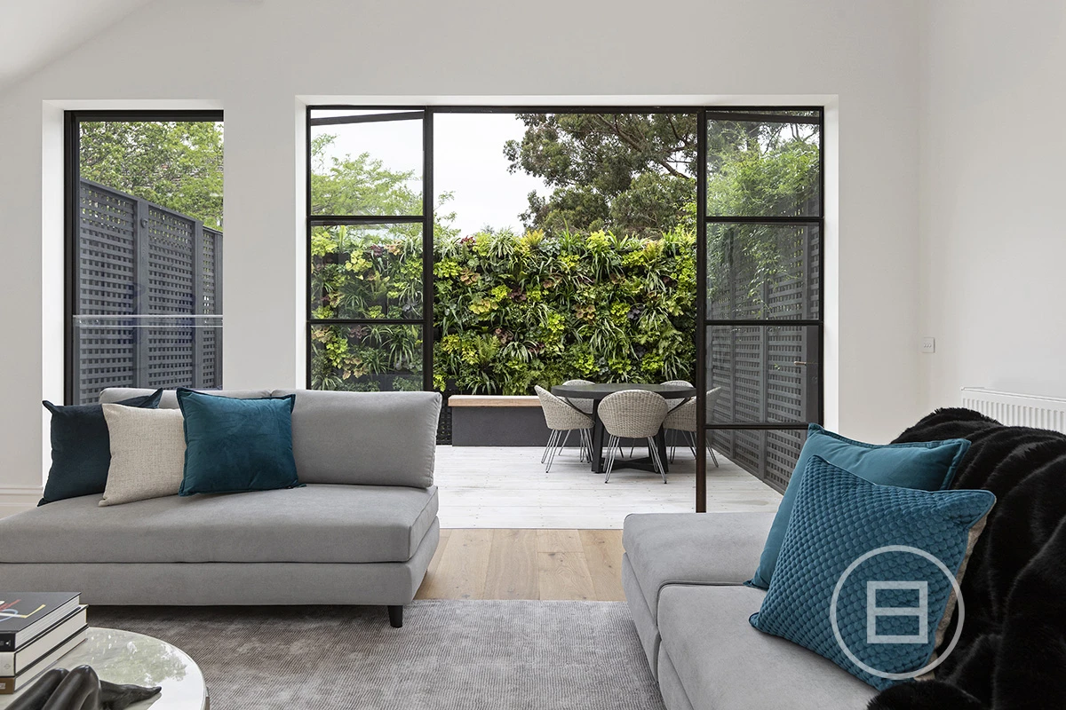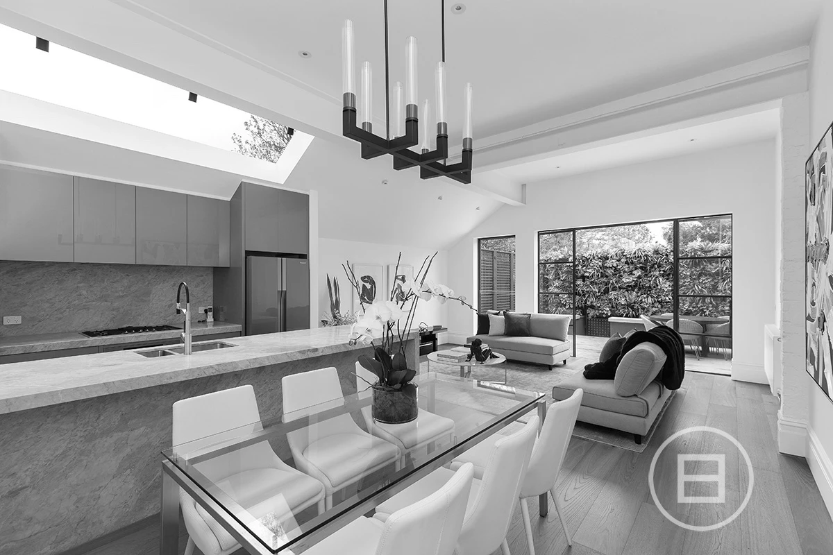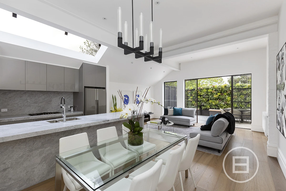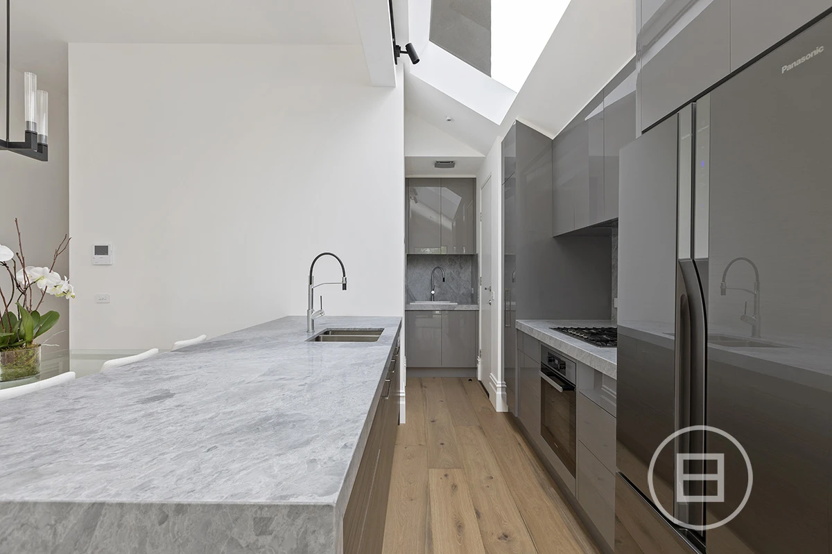 Down the hall your eye is drawn to the feature industrial steel windows which frame the low maintenance yet very lush rear garden. The kitchen clad in Brecciolino marble is massive and gathers tons of natural light due to a full-length skylight above this area, making it perfect for enjoying breakfast in the mornings and entertaining in the evening. The full width lounge flows effortlessly into both the kitchen and outdoor areas with the dining space suitable for up to an 8-seater table.