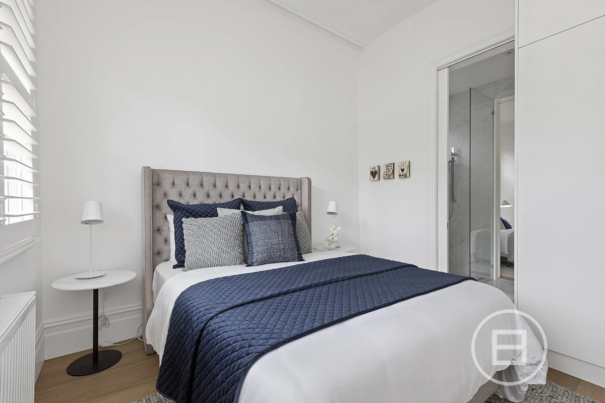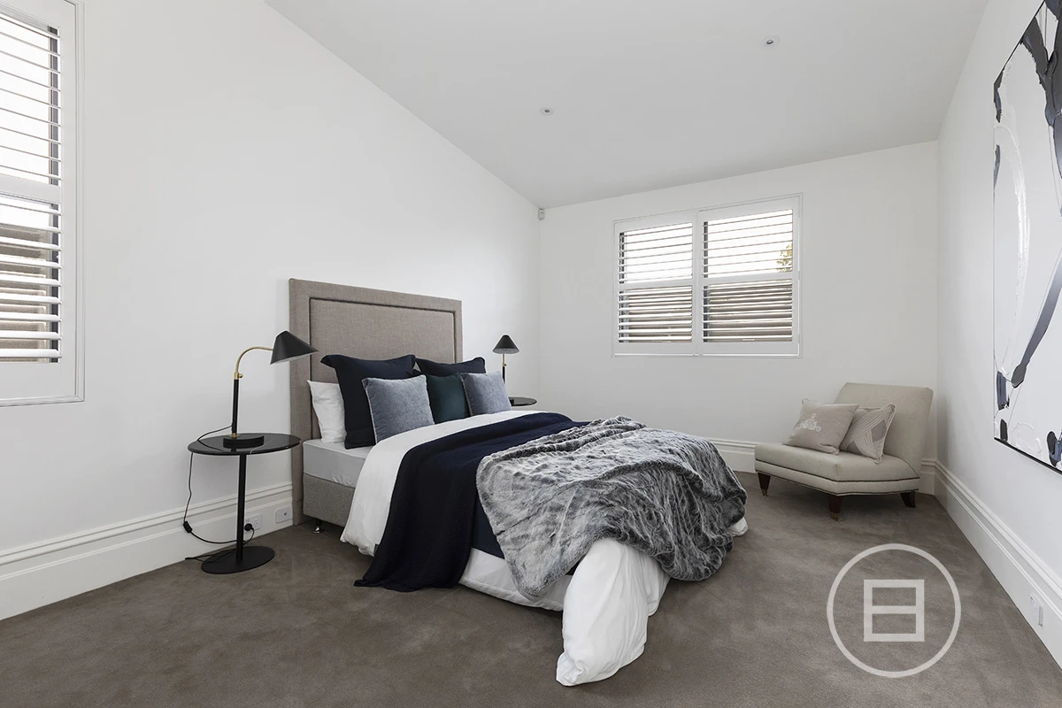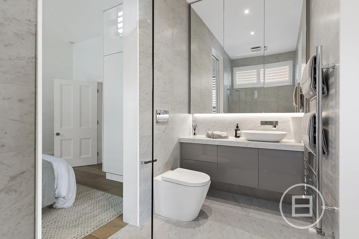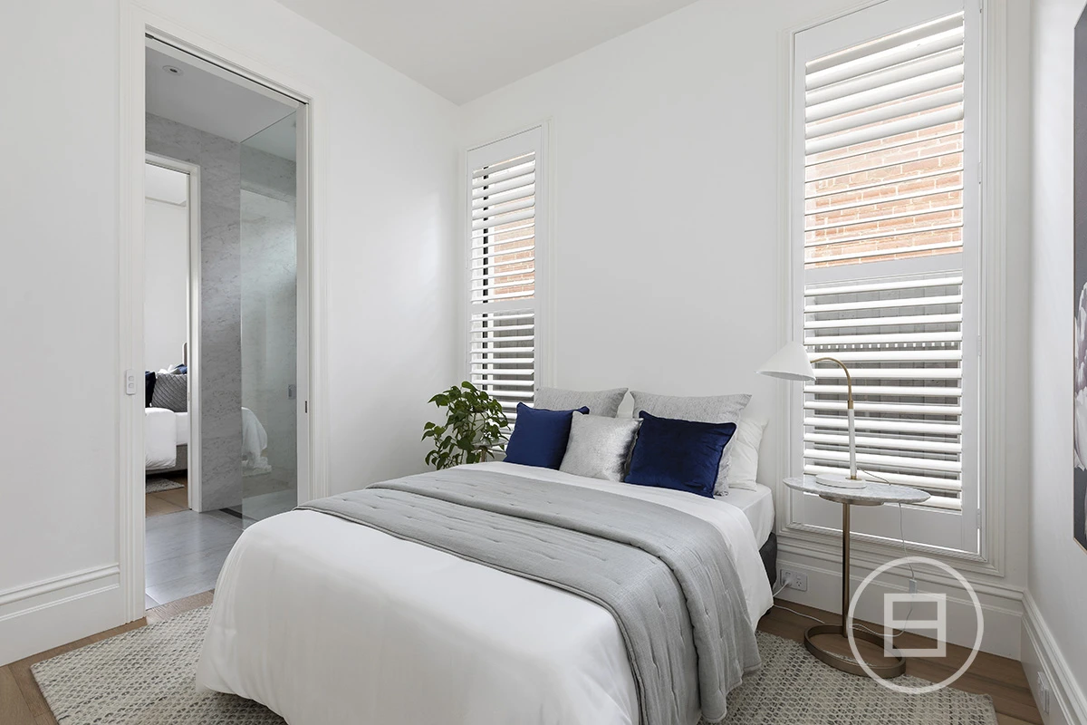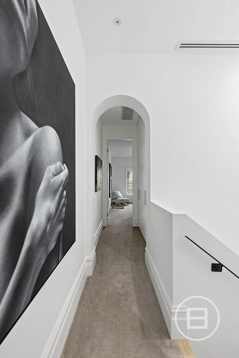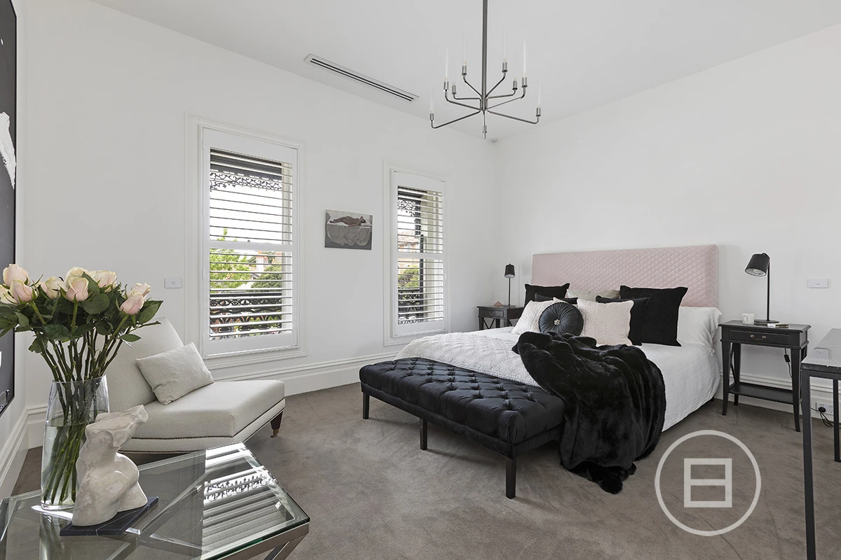 Enter via security intercom and be greeted with an oversized hall rich in period detail with ornate ceiling cornices and archway. The floor plan is balanced with the front two rooms occupying each side of a central bathroom, which are perfect as bedrooms, a formal lounge, or for those working as a consultant from home. The 2-way bathroom is timeless in design with Carrara marble bench top, heated towel rails, plenty of storage and soaring ceilings.