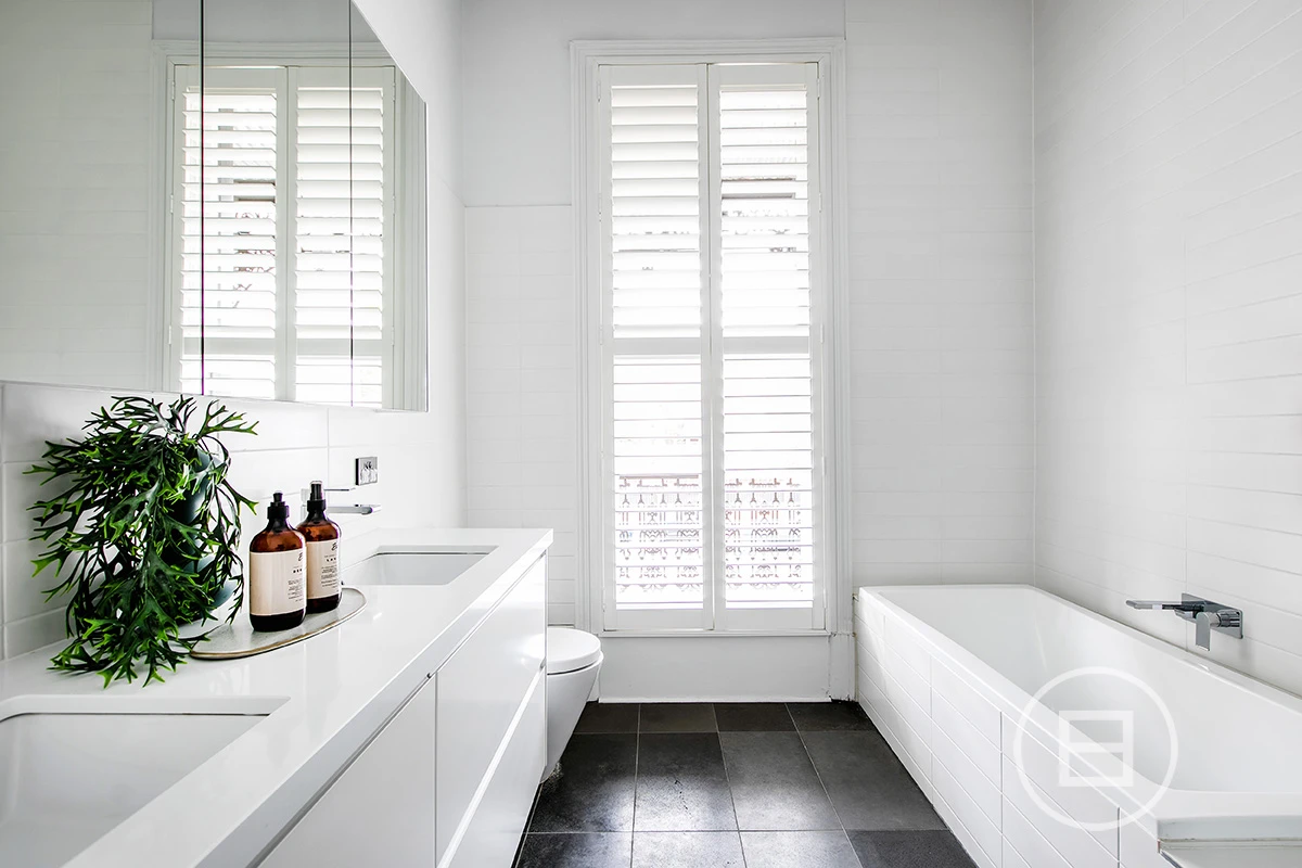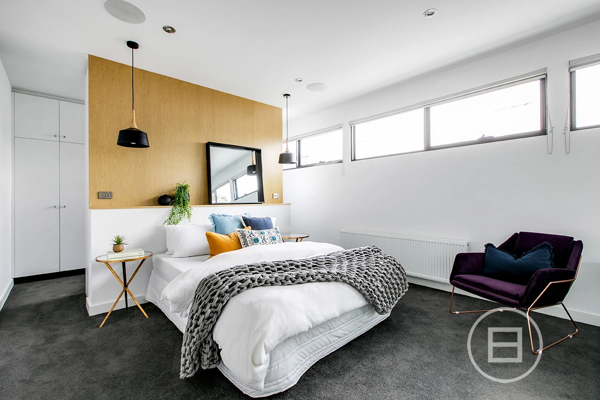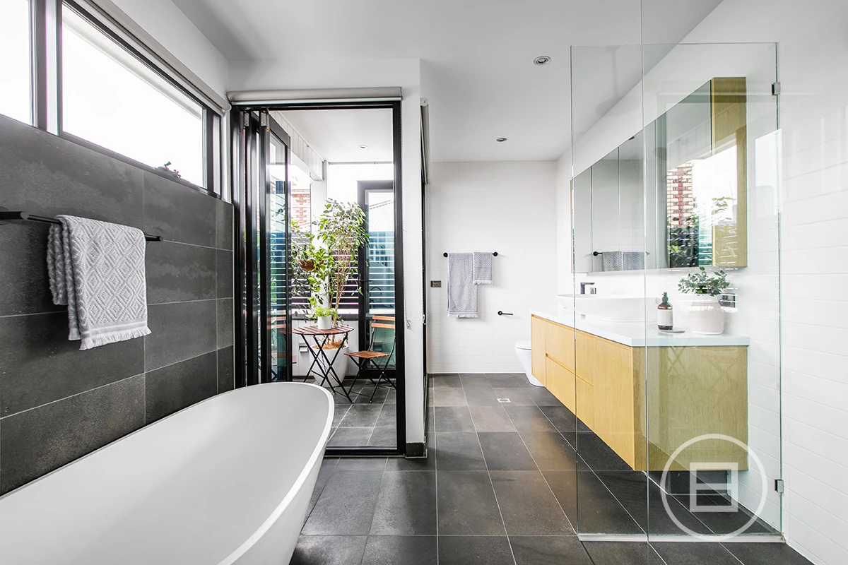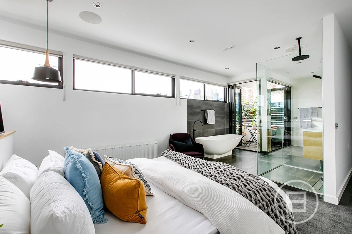 The third-floor, show-stopping master retreat with exposed bathroom, egg-shaped bathtub, walk-in robe, enclosed balcony and city views. Good morning, indeed.