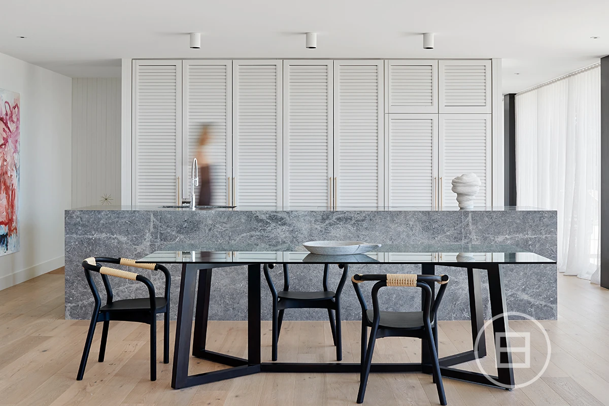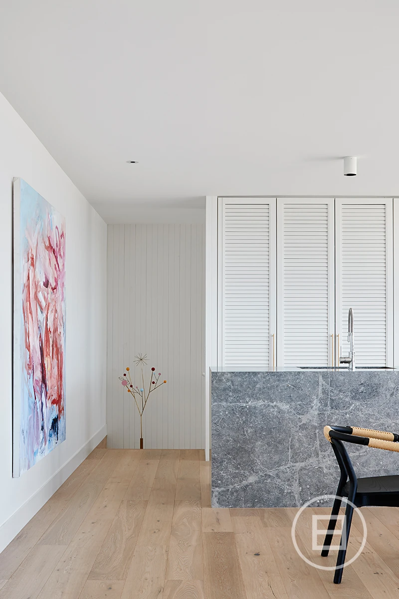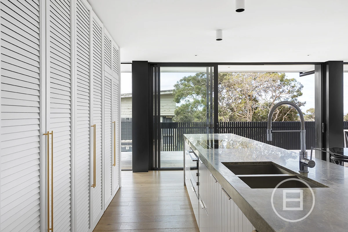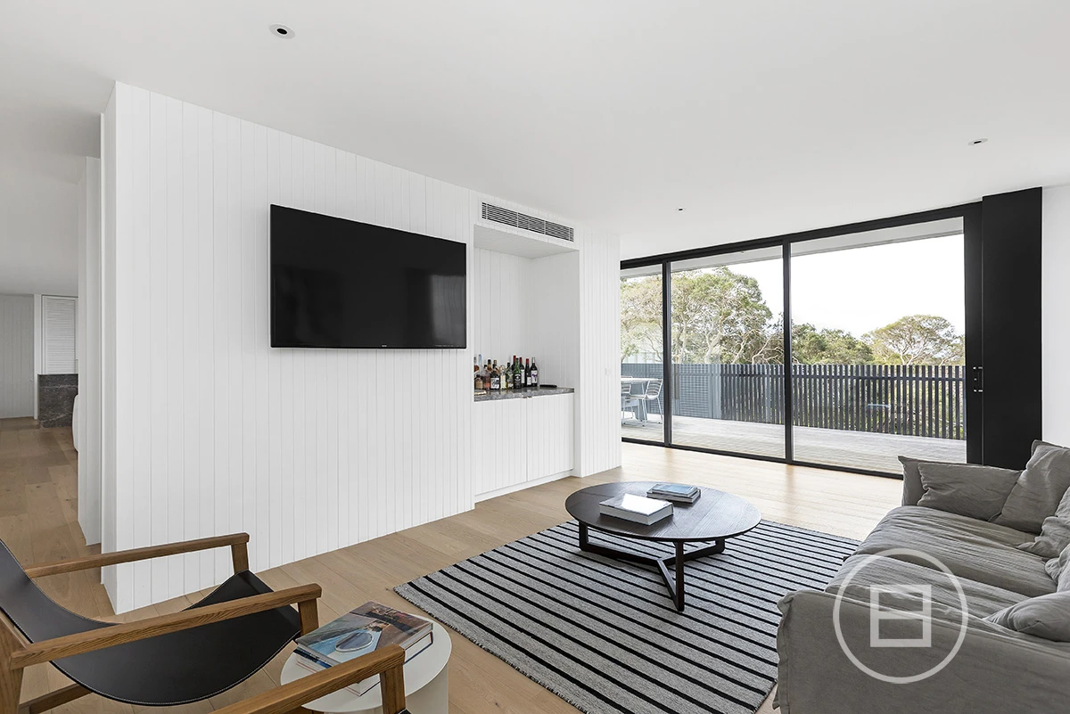Perched high and gaining expansive views out across the bay this stunning home known as Bernie’s beach house as featured in Belle magazine is all about natural tones and quality finishes. Downstairs upon entry past a large double garage you’ll find a beautifully manicured entry with stone feature wall, guest bedroom and separate study. Upstairs is where the home comes to life with an open plan kitchen, living and dining with feature central travertine wall and natural wood log fire place. The combination of grey tundra marble, Italian silver vein cut travertine, white cedar louvres and woodcut pale oak floors combine to give you a luxurious palate throughout. With 4 bedrooms, 3 bathrooms plus powder, 2 living zones and a northern orientation it’s hard to find anything this family entertainer is missing. Concrete slab hydronic heating, ducted split cooling and heating, double glazed windows throughout and views out across the bay are all features you will enjoy living in this home.