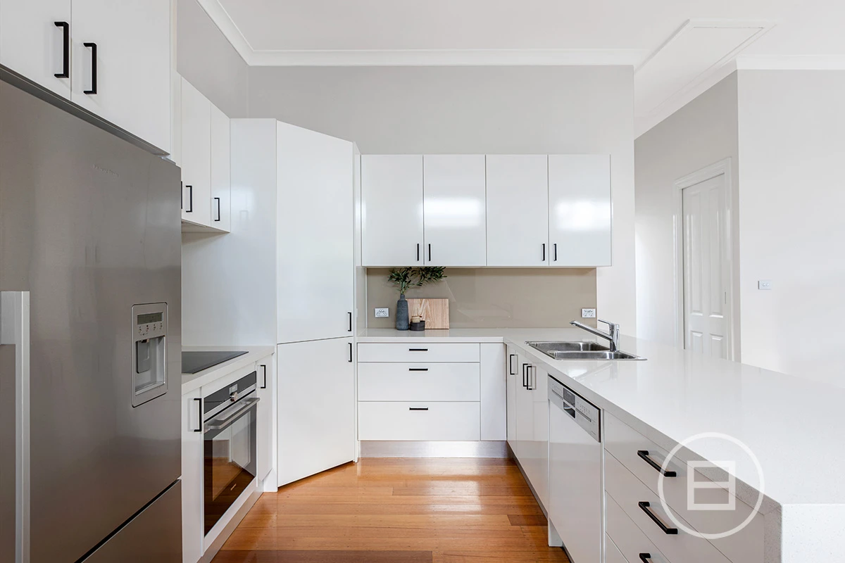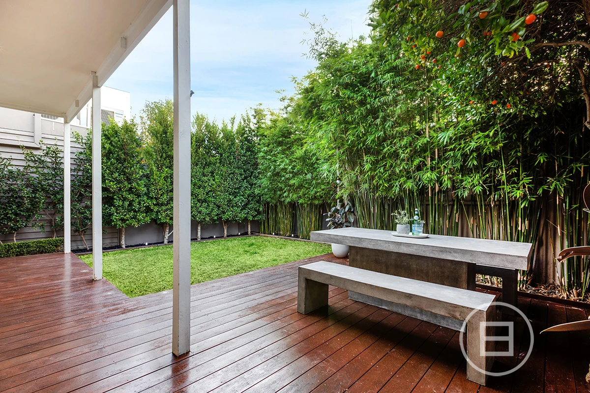 A large kitchen with brekky bench looks over your entertaining space and sits adjacent to a dining area large enough to cater a 10 plus seater table. Double French doors open out onto a large deck area and north facing grass back garden which is surrounded by mature ficus and bamboo trees.