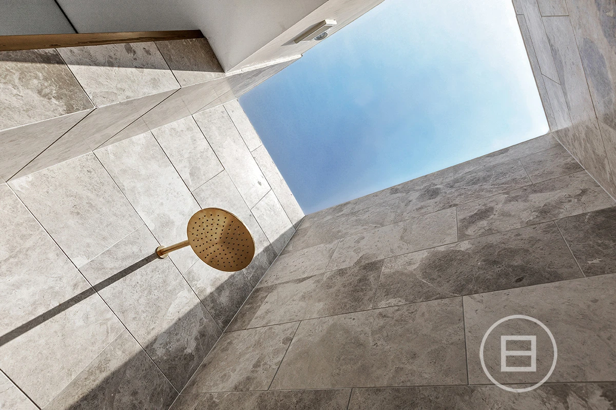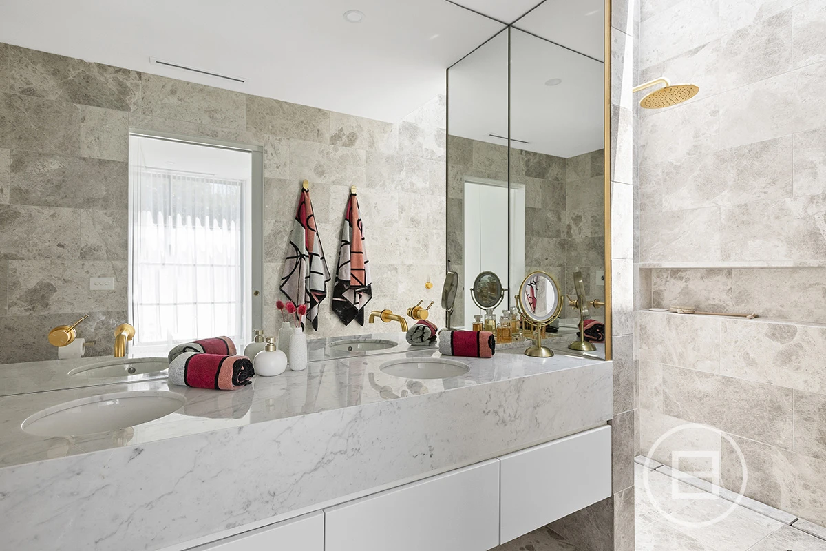 Upstairs a second living space with built in desks gives family's the ability to have separation and the master bedroom feels like it’s own sanctuary. A stunning natural stone bathroom with gold accents and glass roof above the shower is architectural detail in all its glory.