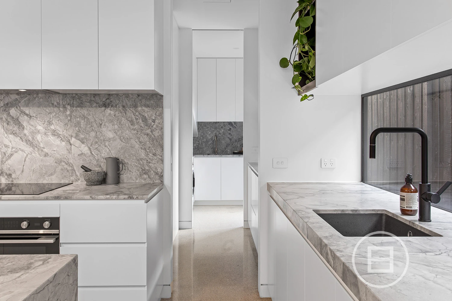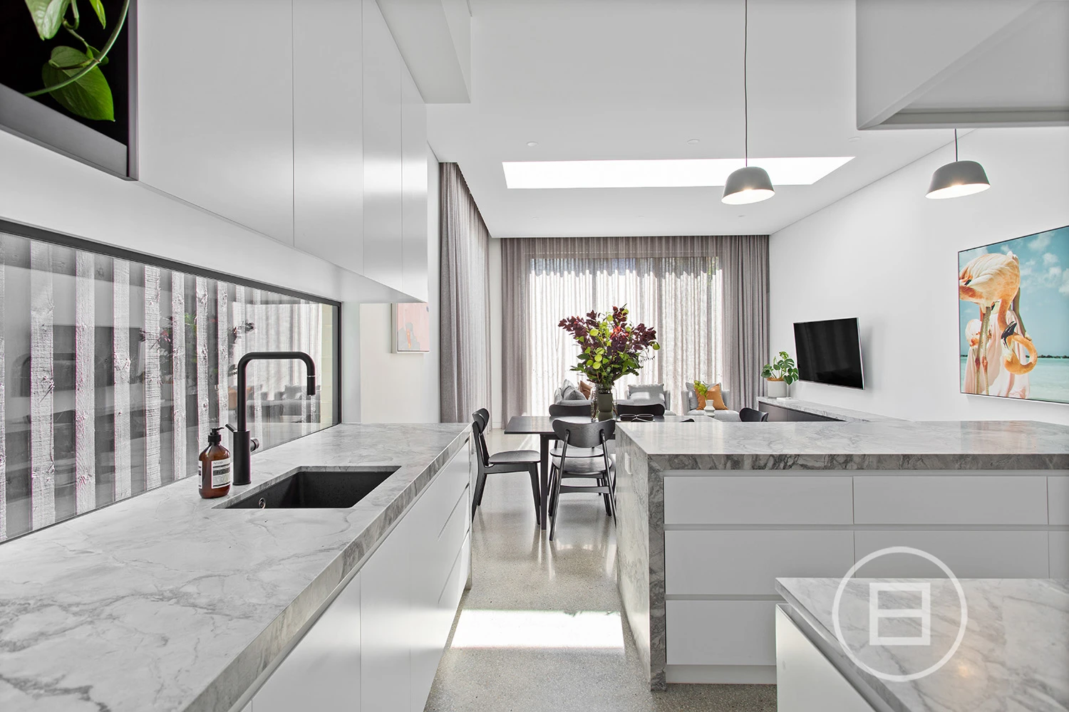 The simplicity of the white cabinetry and marble bench tops throughout is a work of art. The butlers pantry and walk in laundry cap off a family focused wet area which not only is practical and well designed but bathed in natural northern light.