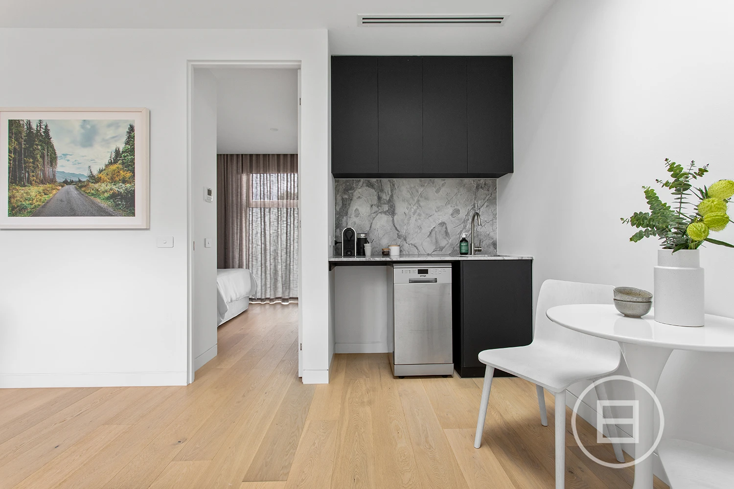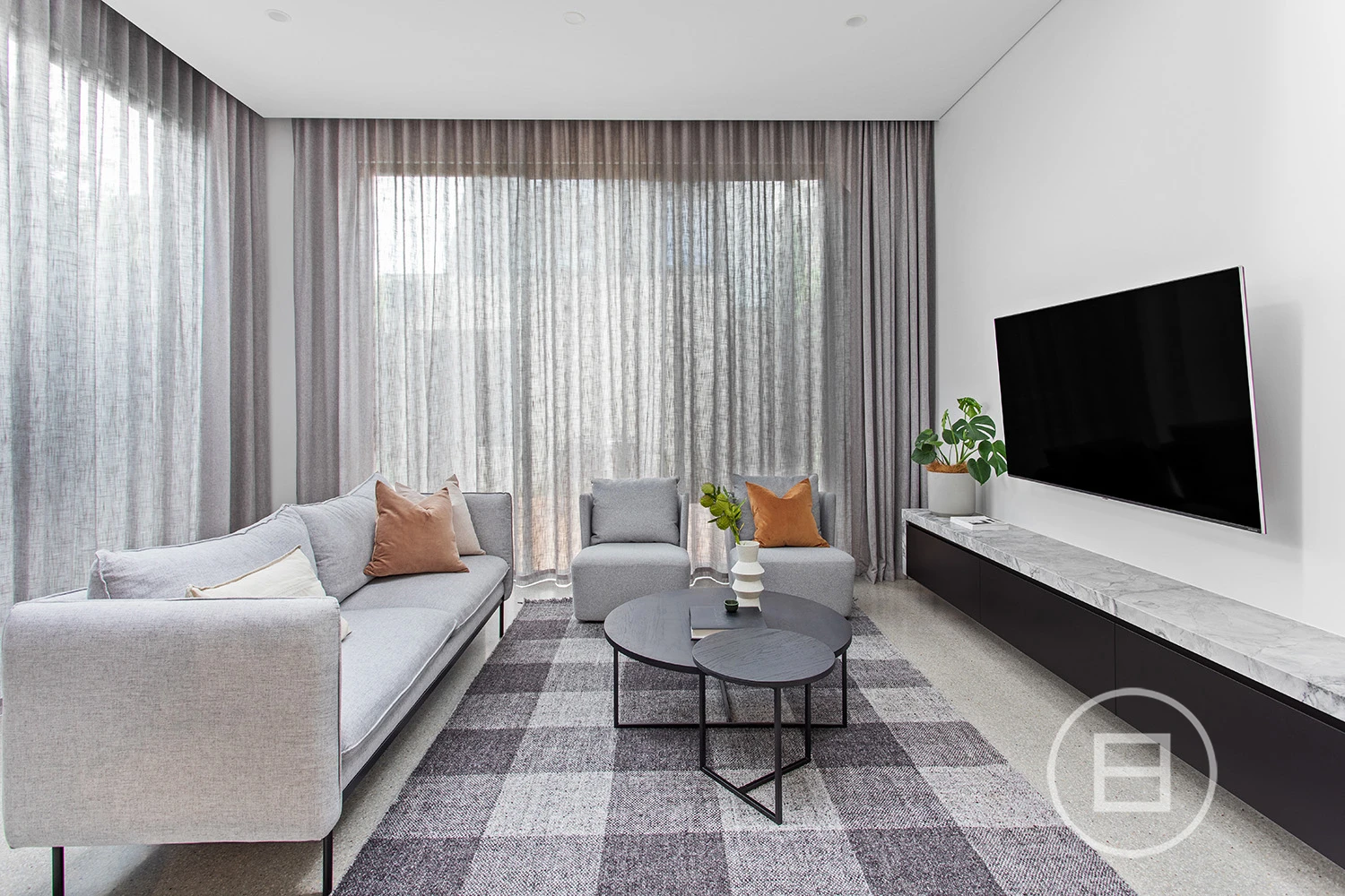 The large open plan kitchen, living and dining continues the soaring roofline with stunning linen curtains, concrete slab heated floors and a kitchen designed with practicality in mind.