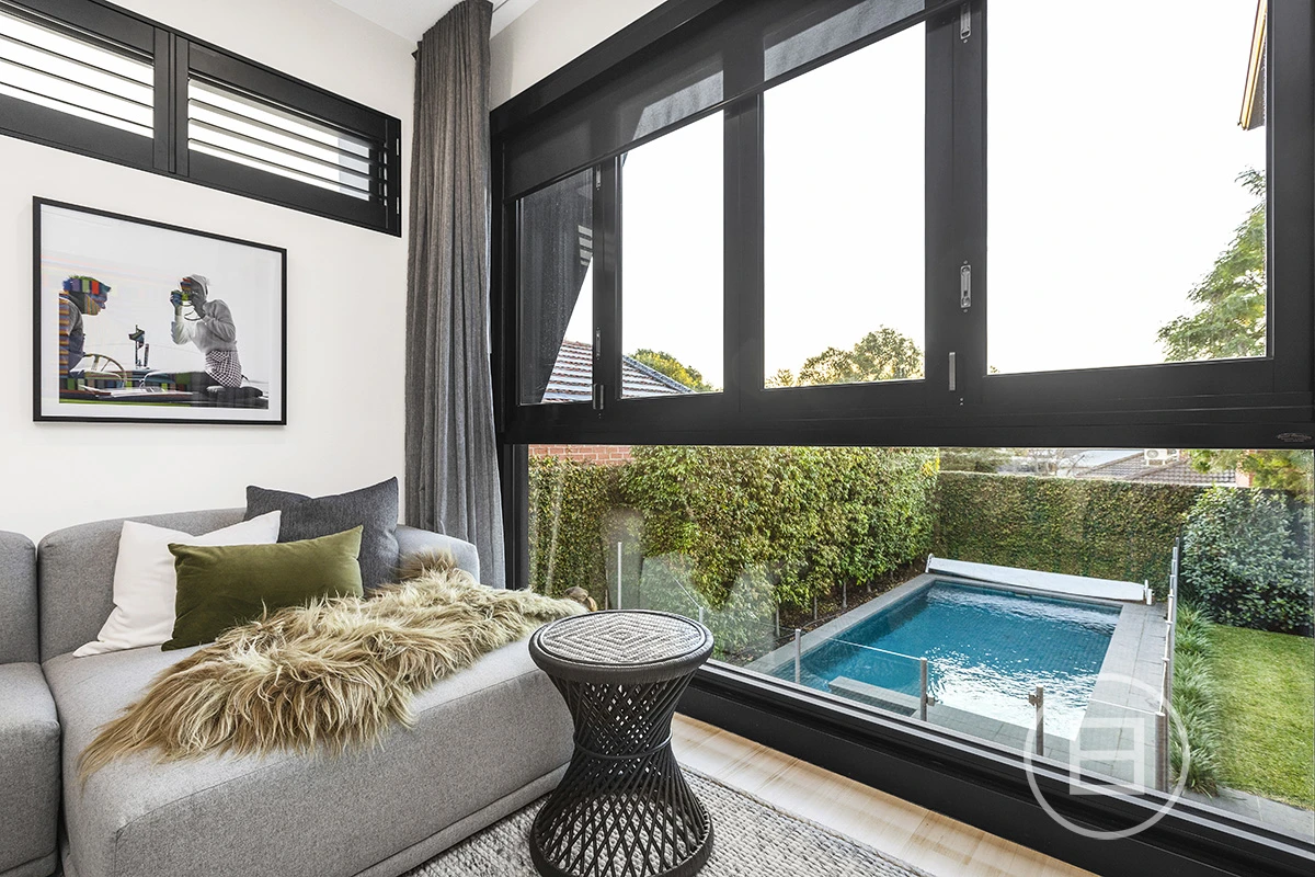 The north-west facing outdoor area, features a large fully tiled salt chlorinated pool, two separate entertaining zones (one with infrared heaters) and an in-ground basketball hoop, allowing you to entertain all year round. Additional features include hydronic heating, video intercom, excellent transport links.