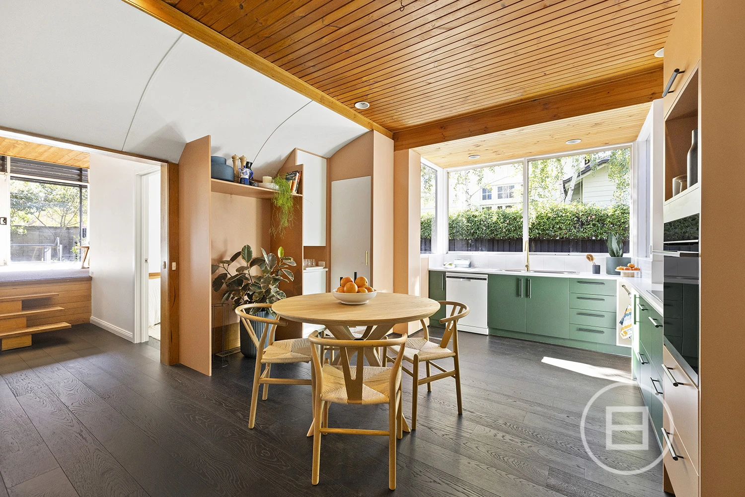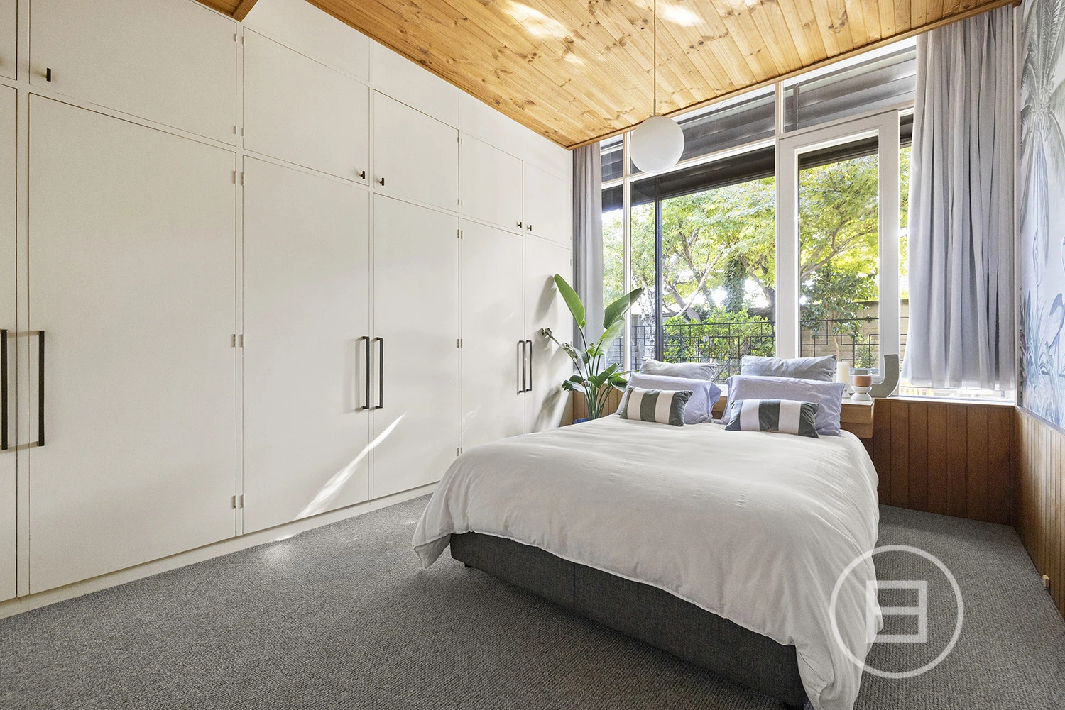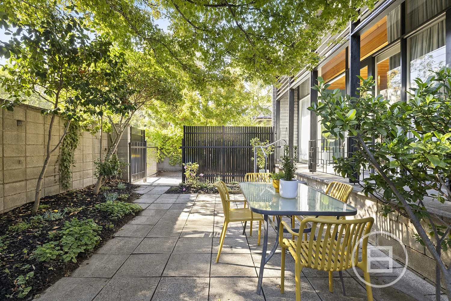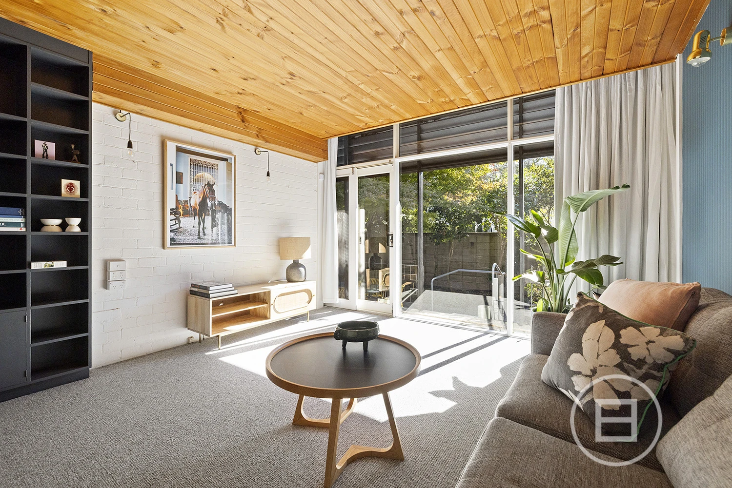‘Judy’, set behind a high front fence and overlooking a serene private garden, offers three bedrooms plus a study nook and features an interior defined by original teak timber panelling, bespoke wallpapers, and floor-to-ceiling windows. The layout includes a large kitchen and meals area, a spacious living room, a main bedroom with built-in robes and ample storage, a second bedroom with a study nook, a third bedroom, and a main bathroom with laundry and additional storage. Brand new carpet and timber floors, high-end kitchen appliances, gas ducted heating, a new heating system, air conditioning, a dishwasher, two private entrances, and a private courtyard with an established garden complete the offering. Two undercover car spaces are also included.