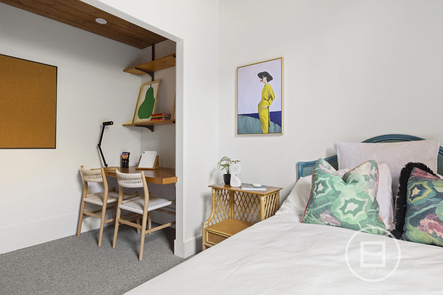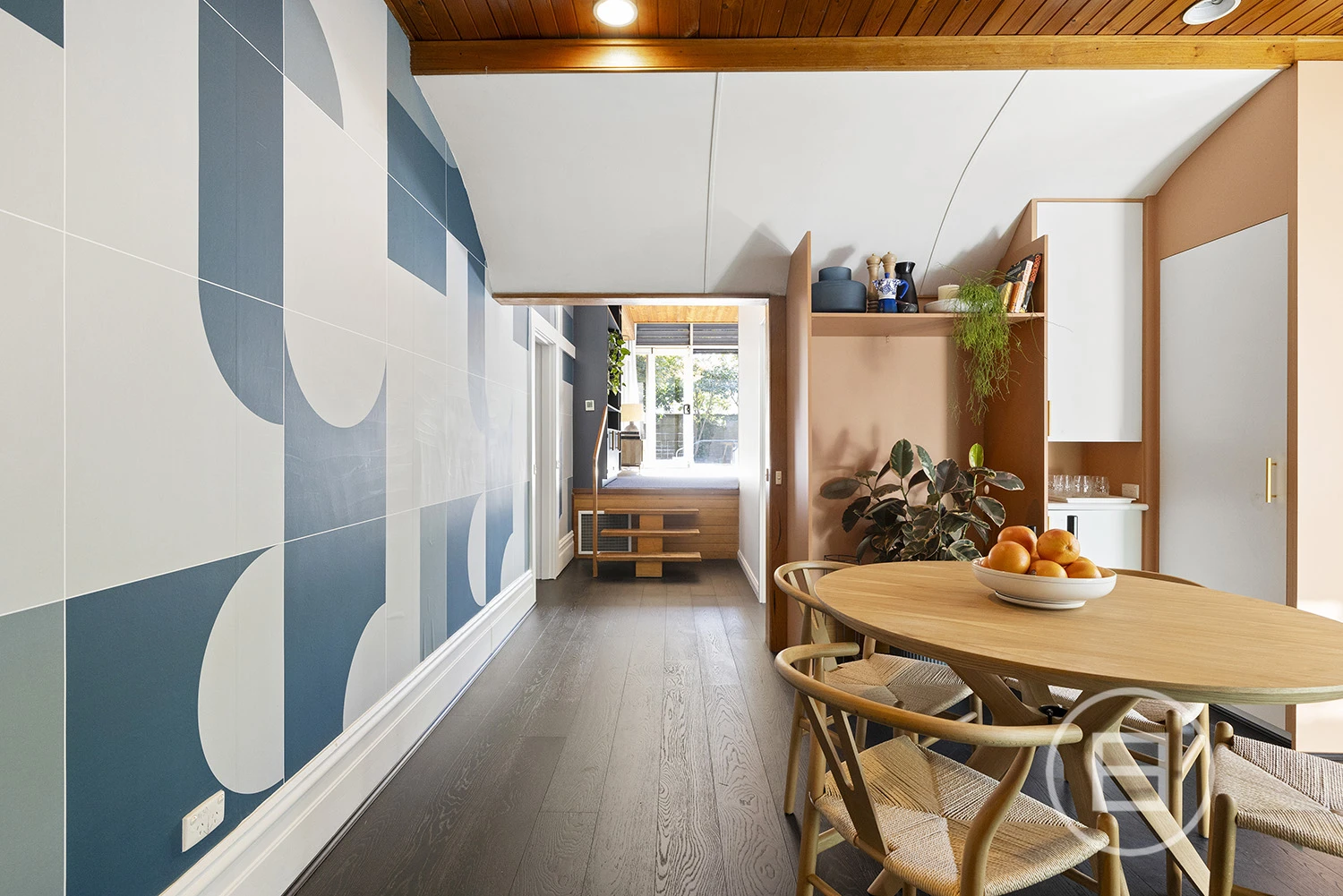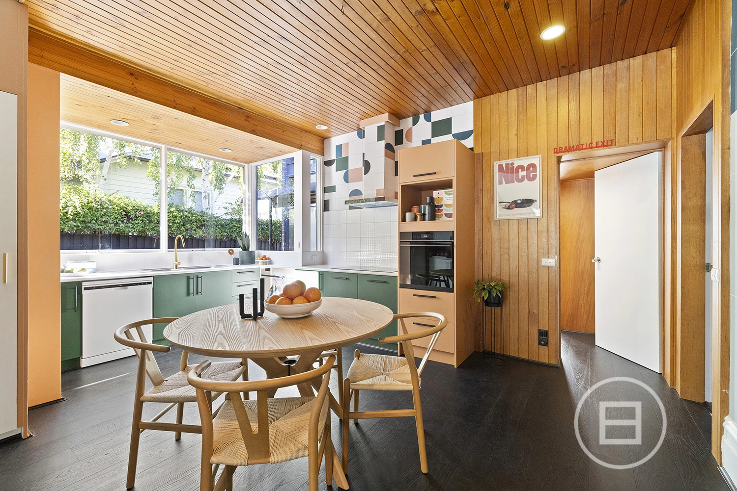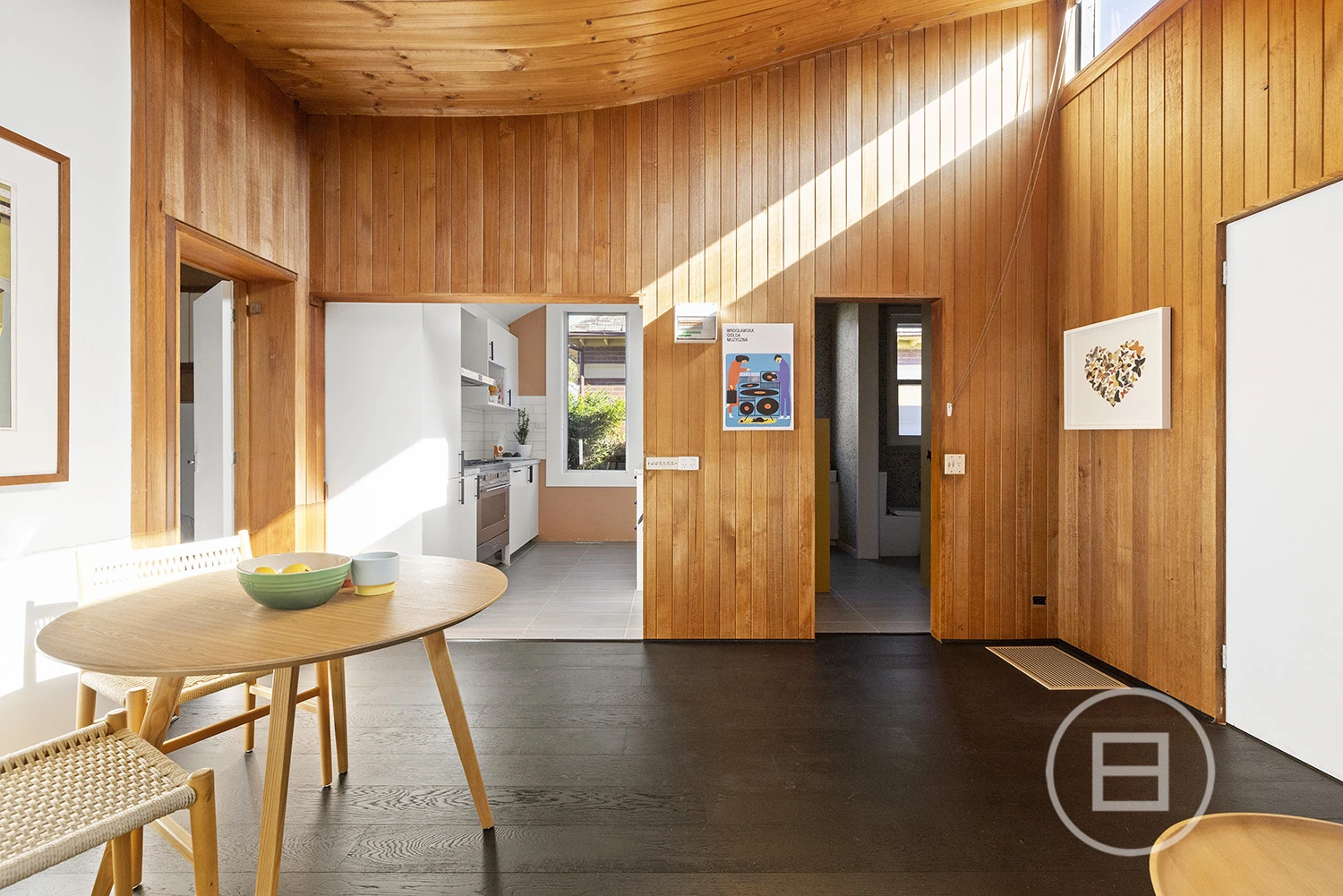 ‘Judy’, set behind a high front fence and overlooking a serene private garden, offers three bedrooms plus a study nook and features an interior defined by original teak timber panelling, bespoke wallpapers, and floor-to-ceiling windows. The layout includes a large kitchen and meals area, a spacious living room, a main bedroom with built-in robes and ample storage, a second bedroom with a study nook, a third bedroom, and a main bathroom with laundry and additional storage. Brand new carpet and timber floors, high-end kitchen appliances, gas ducted heating, a new heating system, air conditioning, a dishwasher, two private entrances, and a private courtyard with an established garden complete the offering. Two undercover car spaces are also included.