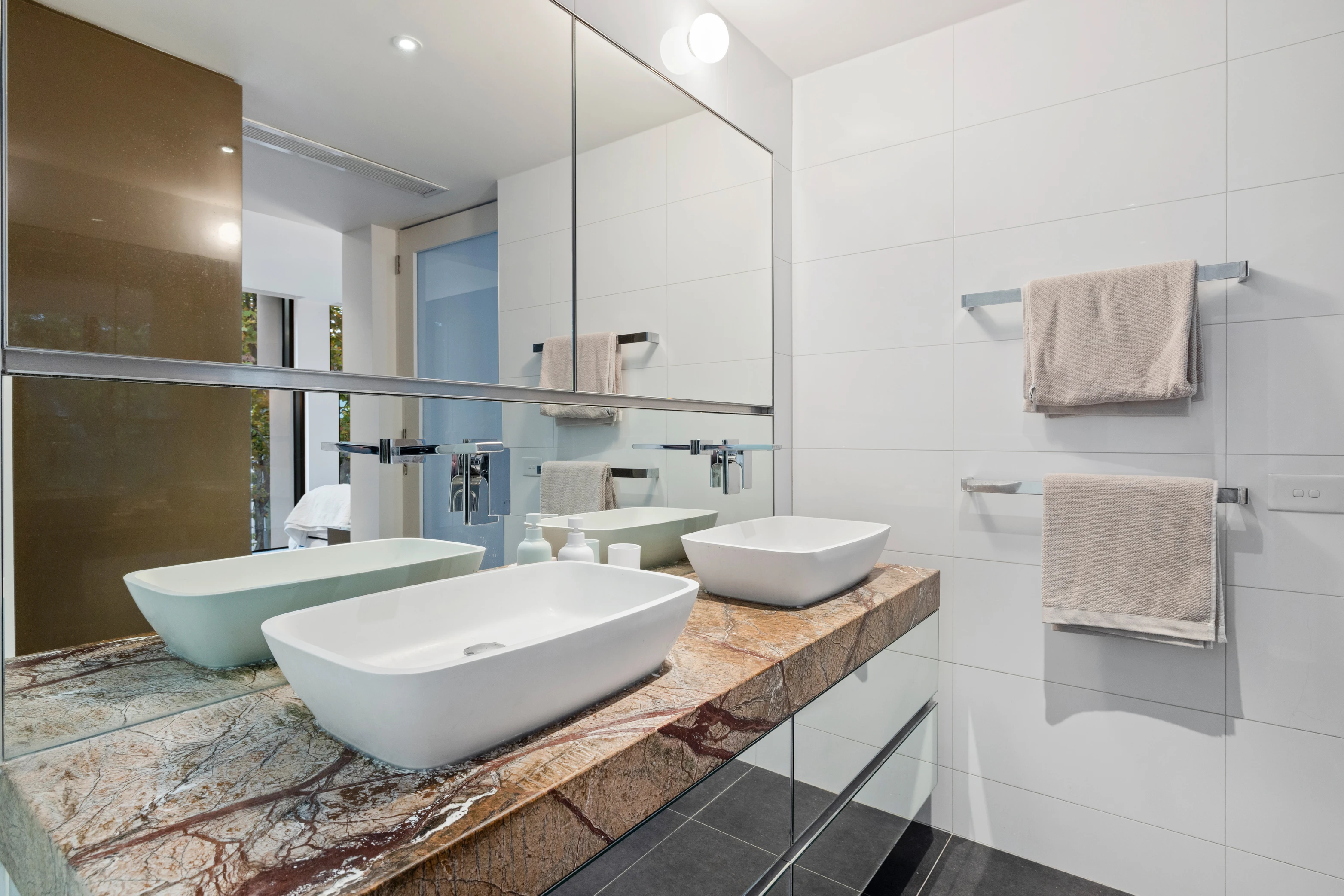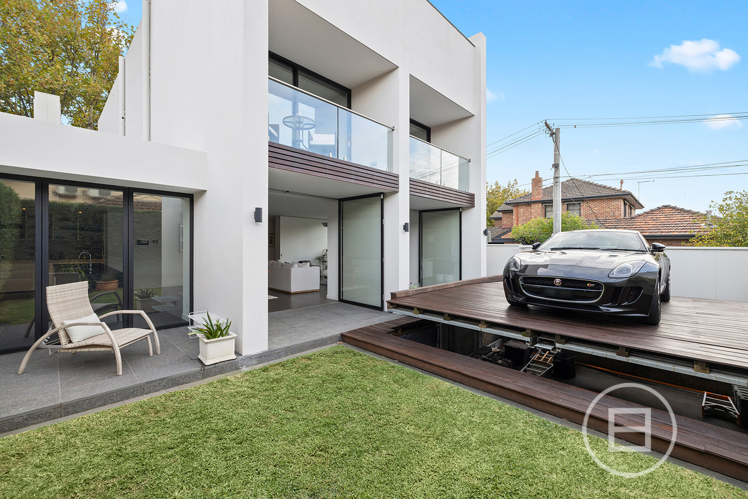 Further up, the luxurious main suite encompasses its own floor, showcasing a lavish WIR and ensuite with an un-honed marble twin vanity, whilst high-end finishes and amenities include quality Rogerseller bathroom tapware, hydronic heating, air conditioning, automatic blinds and an extraordinary car stacker that doubles as an entertaining deck.