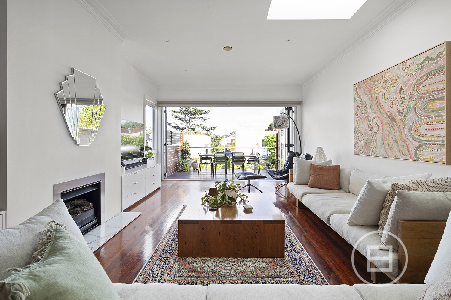 Contemporary style takes over to the rear, where an open-plan living and dining zone with a gas fireplace extends through bi-fold glass doors to an alfresco deck with city vistas for that flawless indoor-outdoor feel. A retractable awning keeps things cool for those summer BBQs, while a central kitchen makes a statement with natural marble benchtops and 900mm European appliances. Downstairs, discover two additional bedrooms with direct garden access and walk-in robes, a second living area, and a family bathroom.