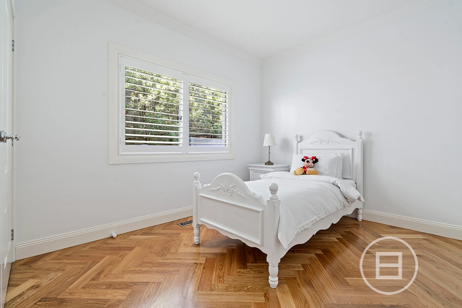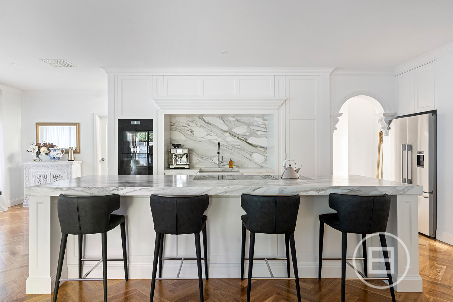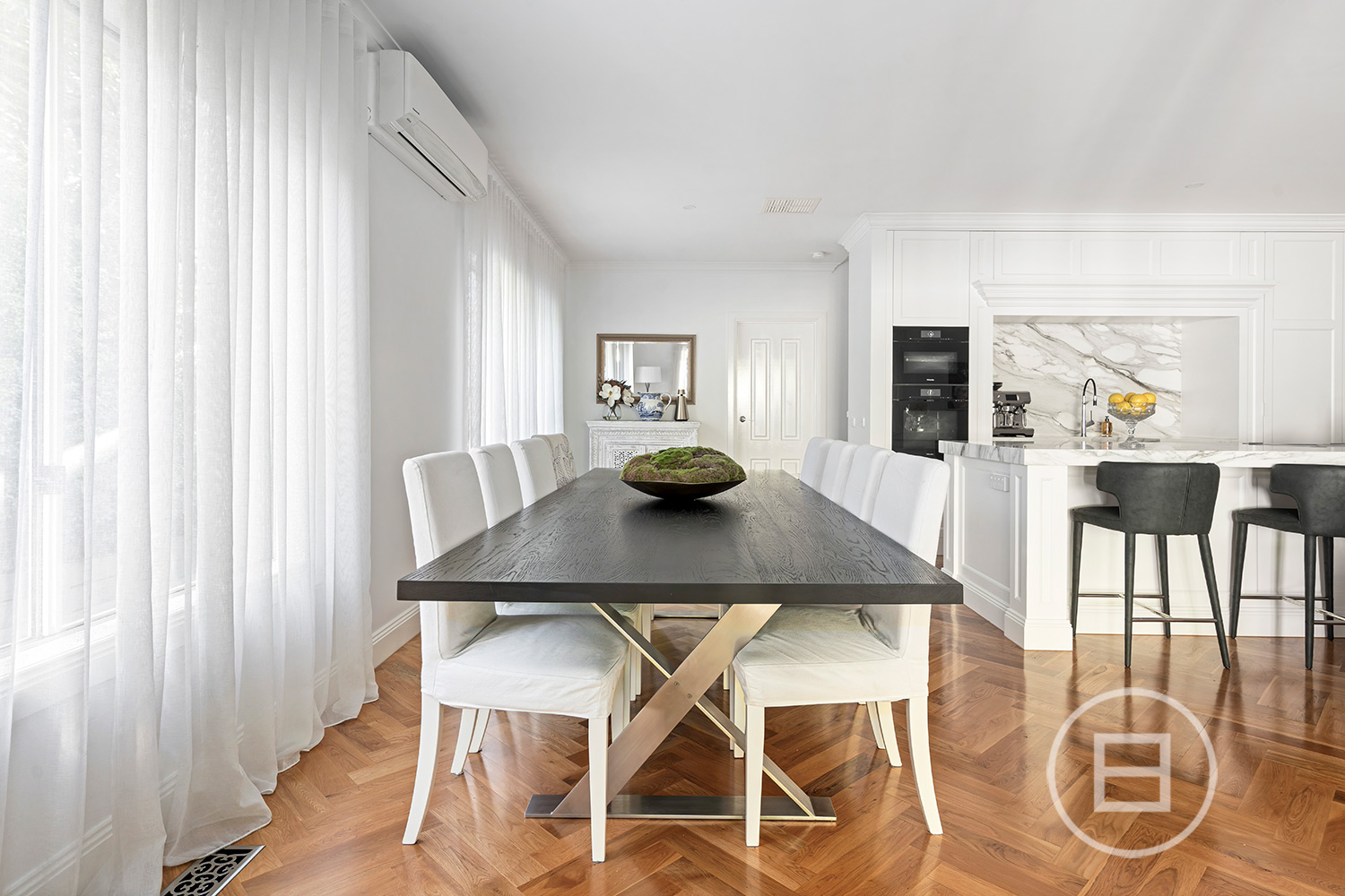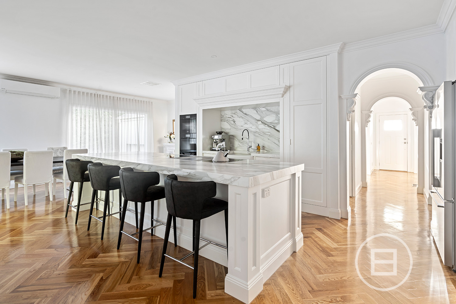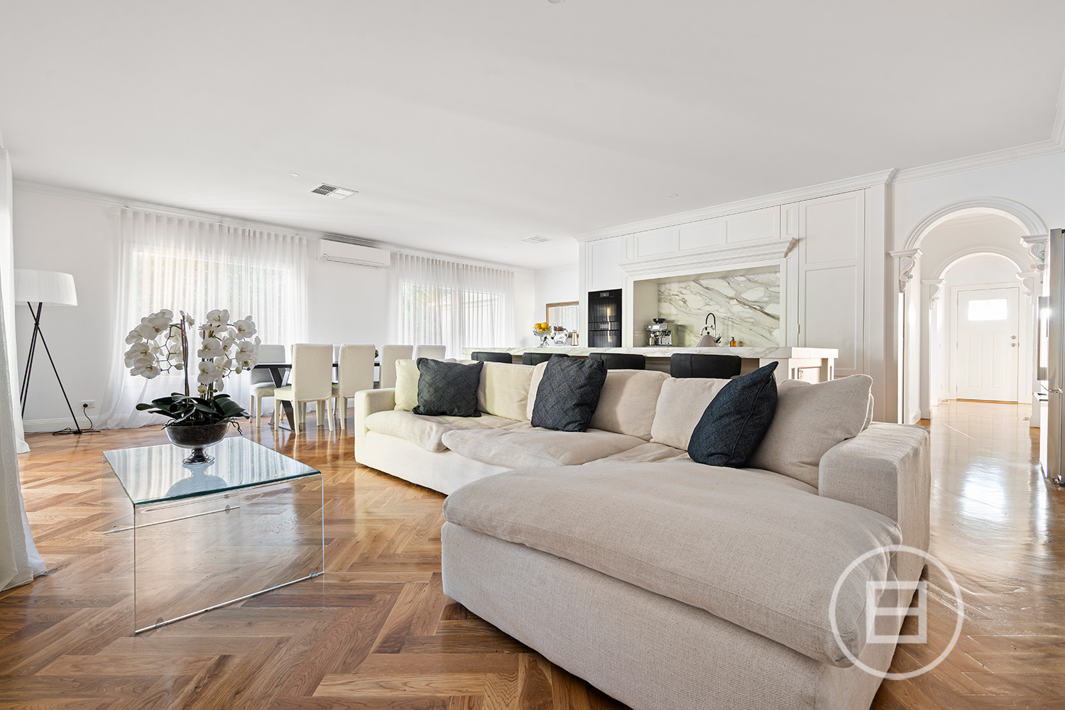 With its lush gardens and classically inspired façade quick to leave an impression, a grand entrance hall’s two arches, elaborate cornices, and herringbone European oak parquetry flooring set a tone of class and prestige continued throughout. Featuring its own walk-in robe and lavish ensuite, a sumptuous front master is complemented by three broad, additional bedrooms, excellent built-in robe space, and a chic main bathroom with a bathtub and separate WC. Equipped with a fireplace for cosy winter nights, a quiet front living room complements a scintillating hospitality suite at rear where family and dining areas wrap around a statement kitchen boasting swathes of stone, masses of storage, and top-of-the-range Miele appliances. Sliding glass reveals a covered alfresco with an outdoor kitchen for family barbecues and drinks after dark, while total privacy from manicured hedges joins all-day sun in bathing an open-air lounge.