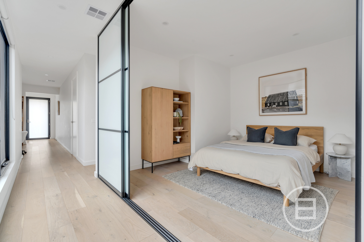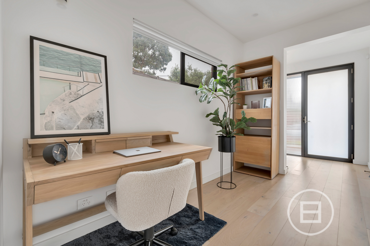 High ceilings and oak floors frame a wide and inviting hallway, with a broad study area and lower bedroom/sitting space introduced on the way to a brilliant entertainer’s domain. Abundant soft-close cabinetry, a waterfall island, and Bosch appliance suite elevate the appeal of a first-class kitchen, while living and dining zones spill into a quiet yard perfect for barbecues on a cloudless Sunday.