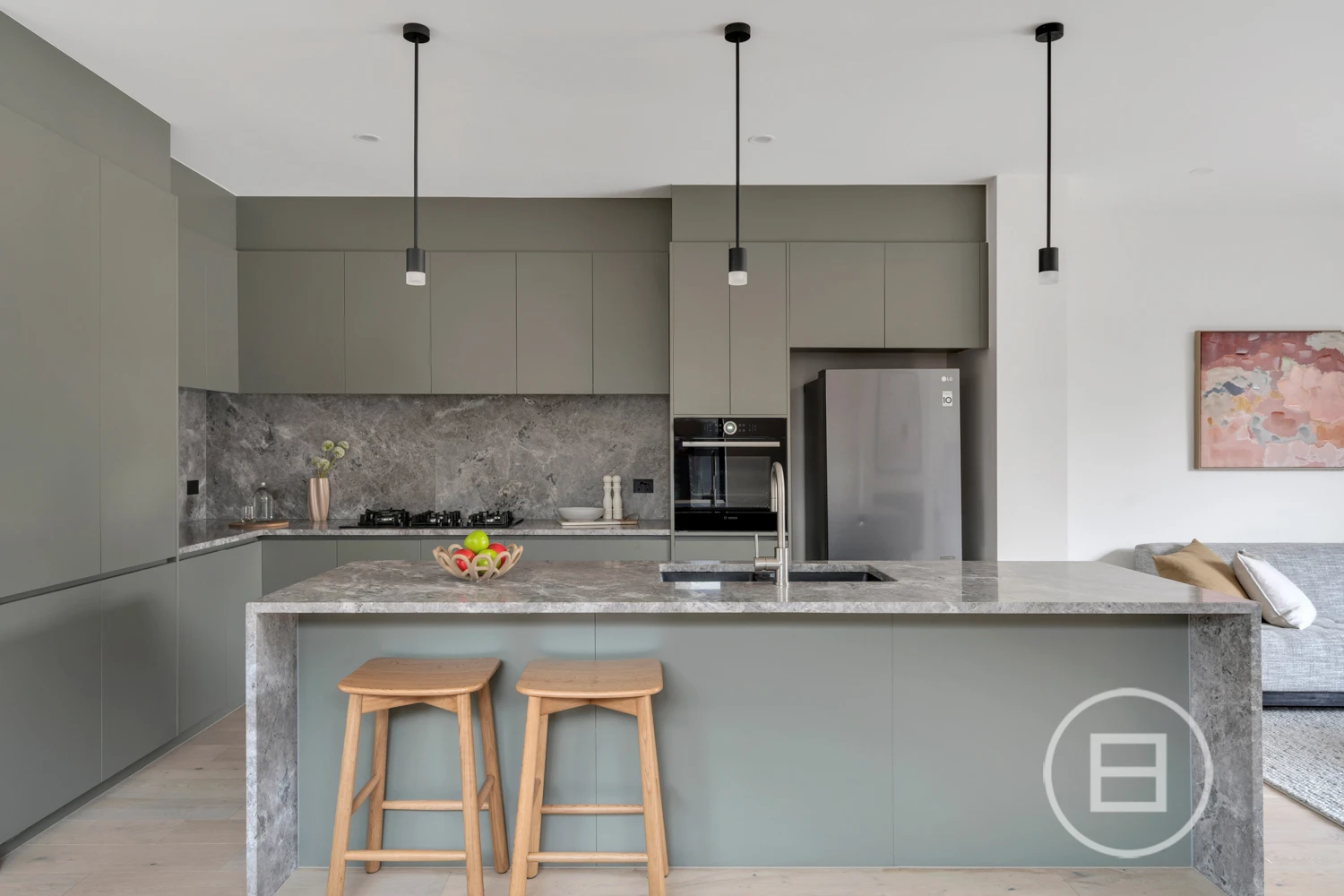 An alluring palette of tones and textures headlined by splashes of soft colour and Tundra Grey marble.