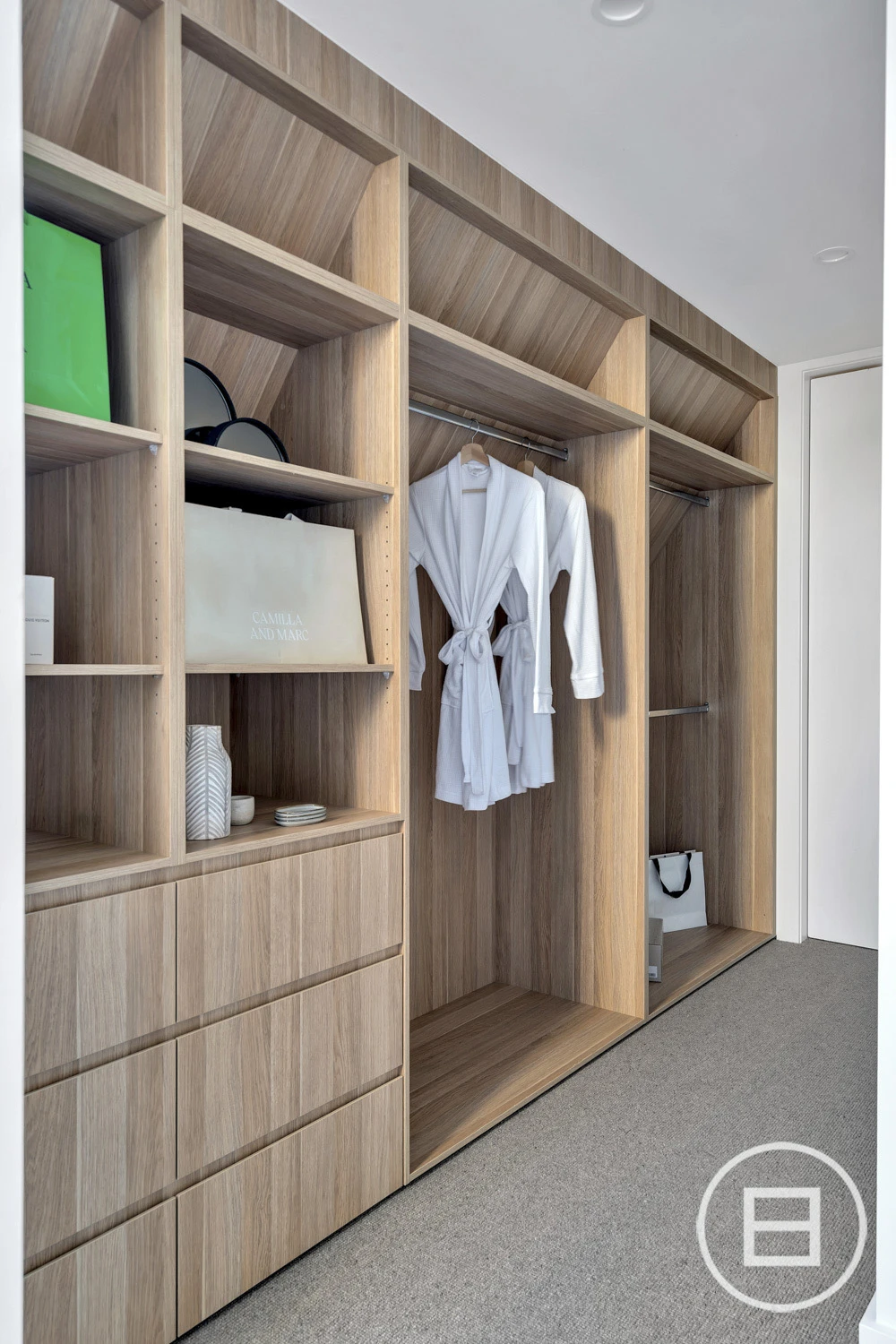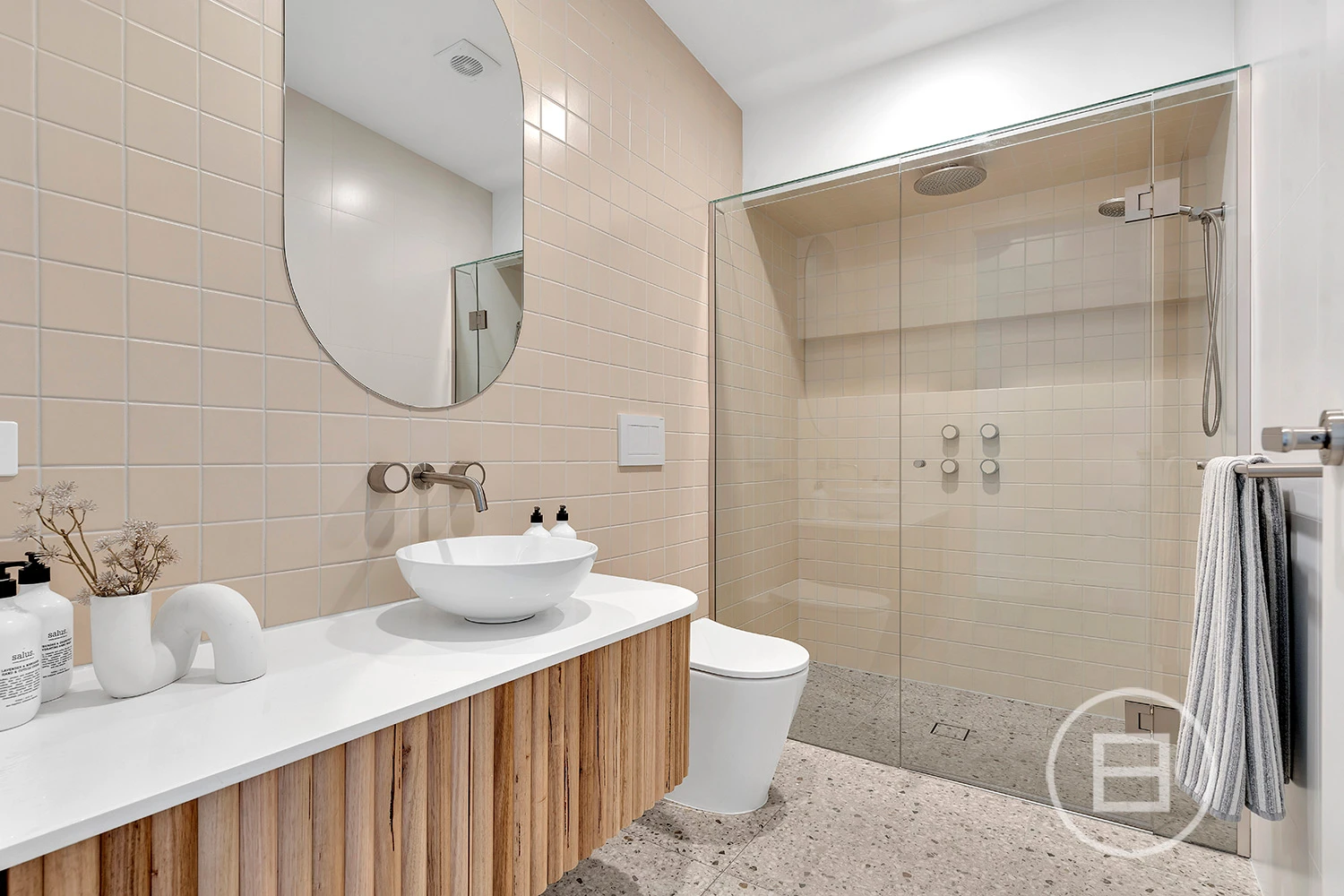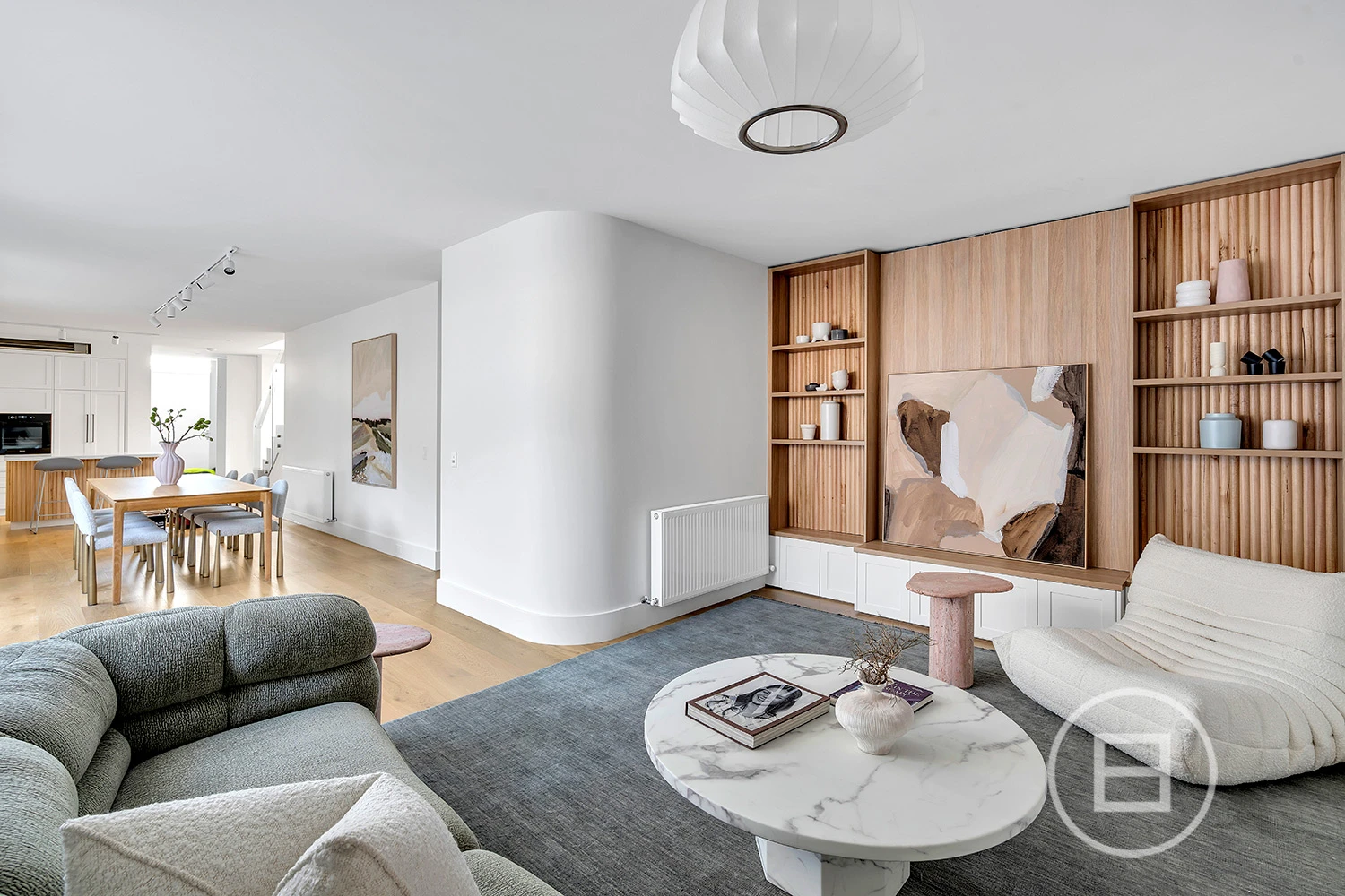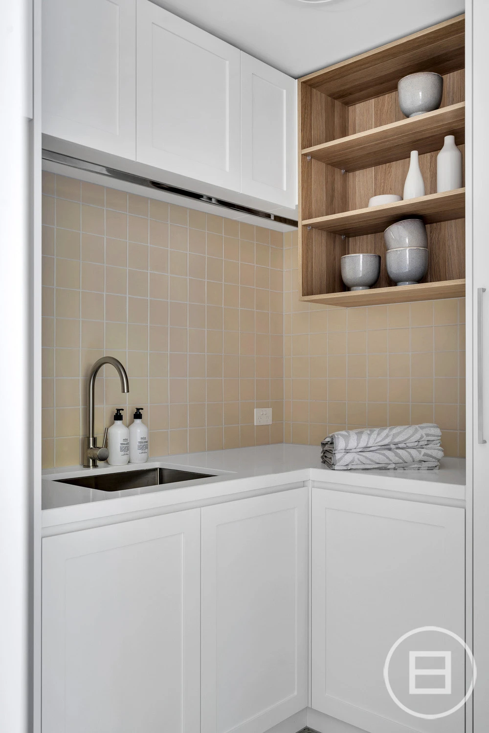 The ground floor offers a sophisticated living zone anchored by a custom timber entertainment unit, while the master retreat is a private sanctuary with custom walk-in robes and a sleek ensuite finished with brushed nickel tapware and dual sinks. A concealed laundry and curved-wall powder room maintain the home’s seamless aesthetic.