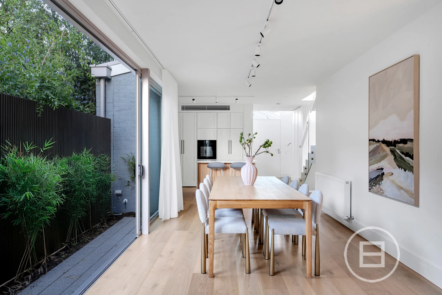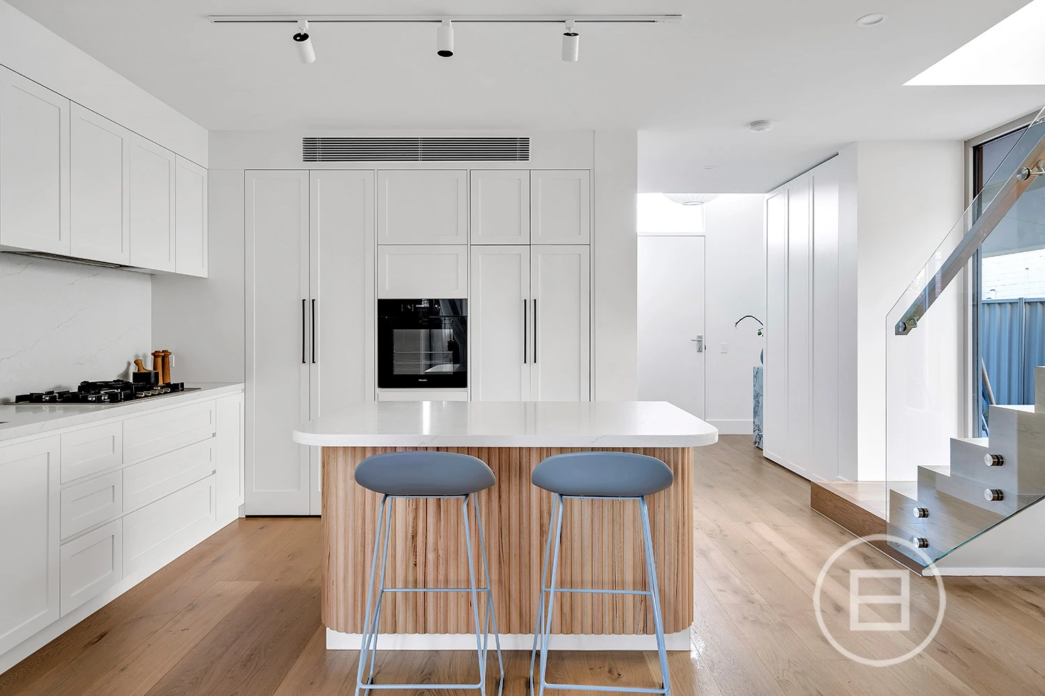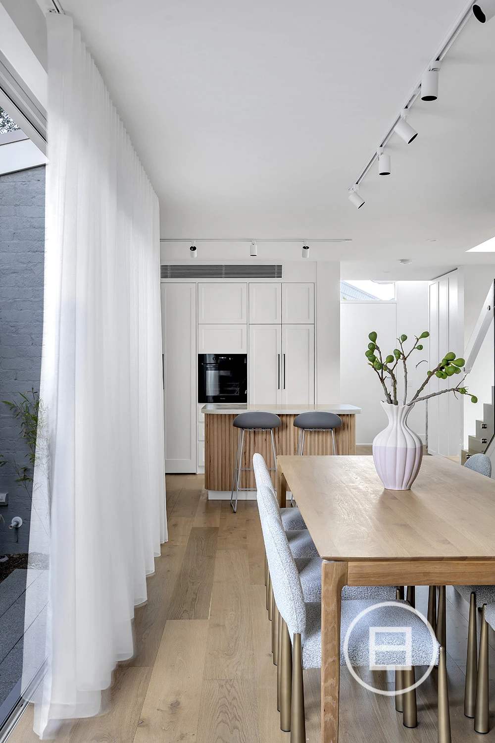 Inside, considered design meets functionality. French oak floorboards guide you through a sequence of carefully curated spaces, with natural light and spatial flow at the forefront. The kitchen is a balance of form and performance, featuring natural stone surfaces, dual sinks, integrated Miele appliances, a 5-burner stove, and streamlined 2-pack cabinetry. A sculptural staircase adds a striking architectural element, leading to a second level designed for adaptable living.