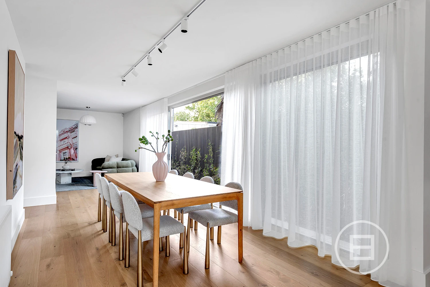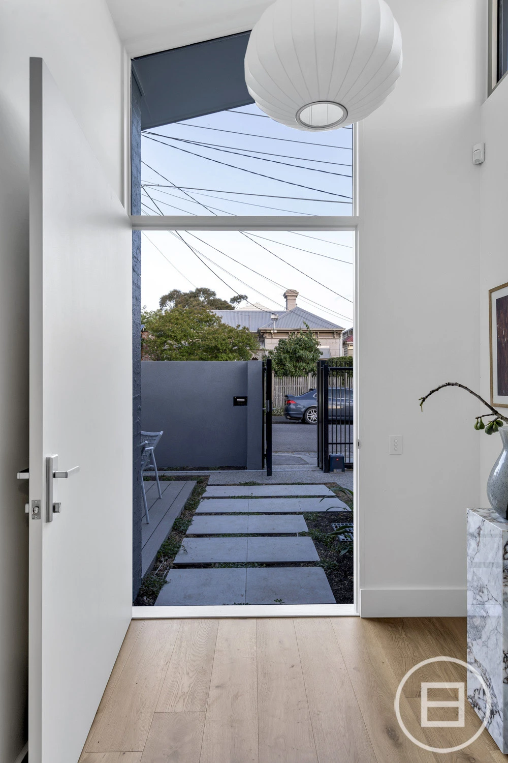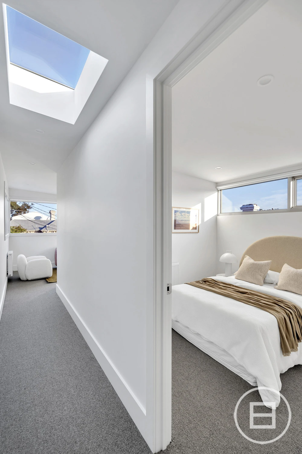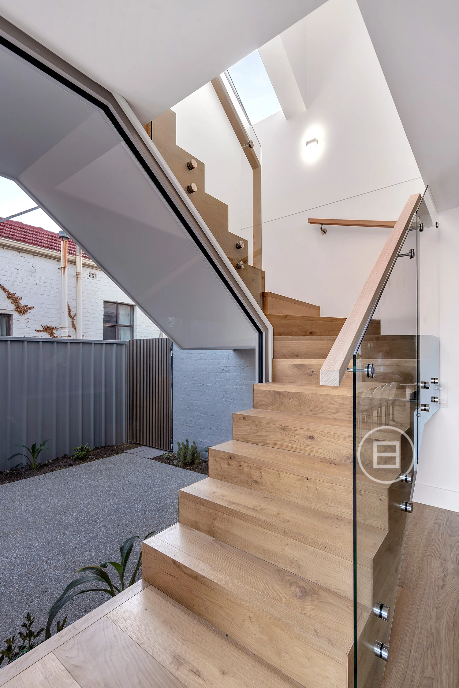 Inside, considered design meets functionality. French oak floorboards guide you through a sequence of carefully curated spaces, with natural light and spatial flow at the forefront. The kitchen is a balance of form and performance, featuring natural stone surfaces, dual sinks, integrated Miele appliances, a 5-burner stove, and streamlined 2-pack cabinetry. A sculptural staircase adds a striking architectural element, leading to a second level designed for adaptable living.