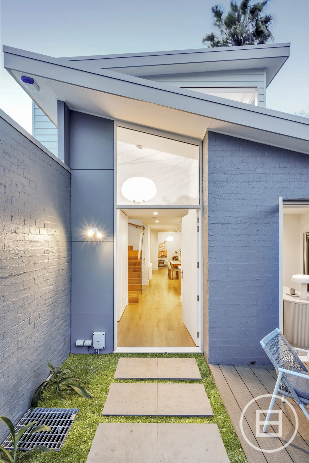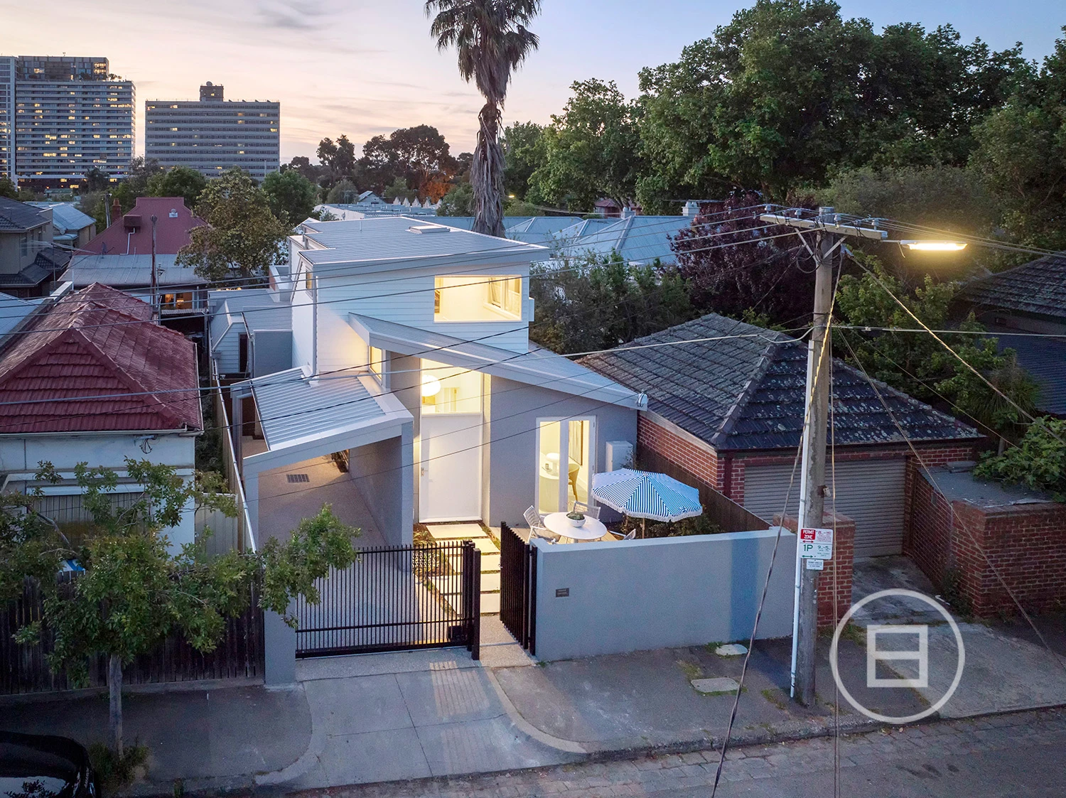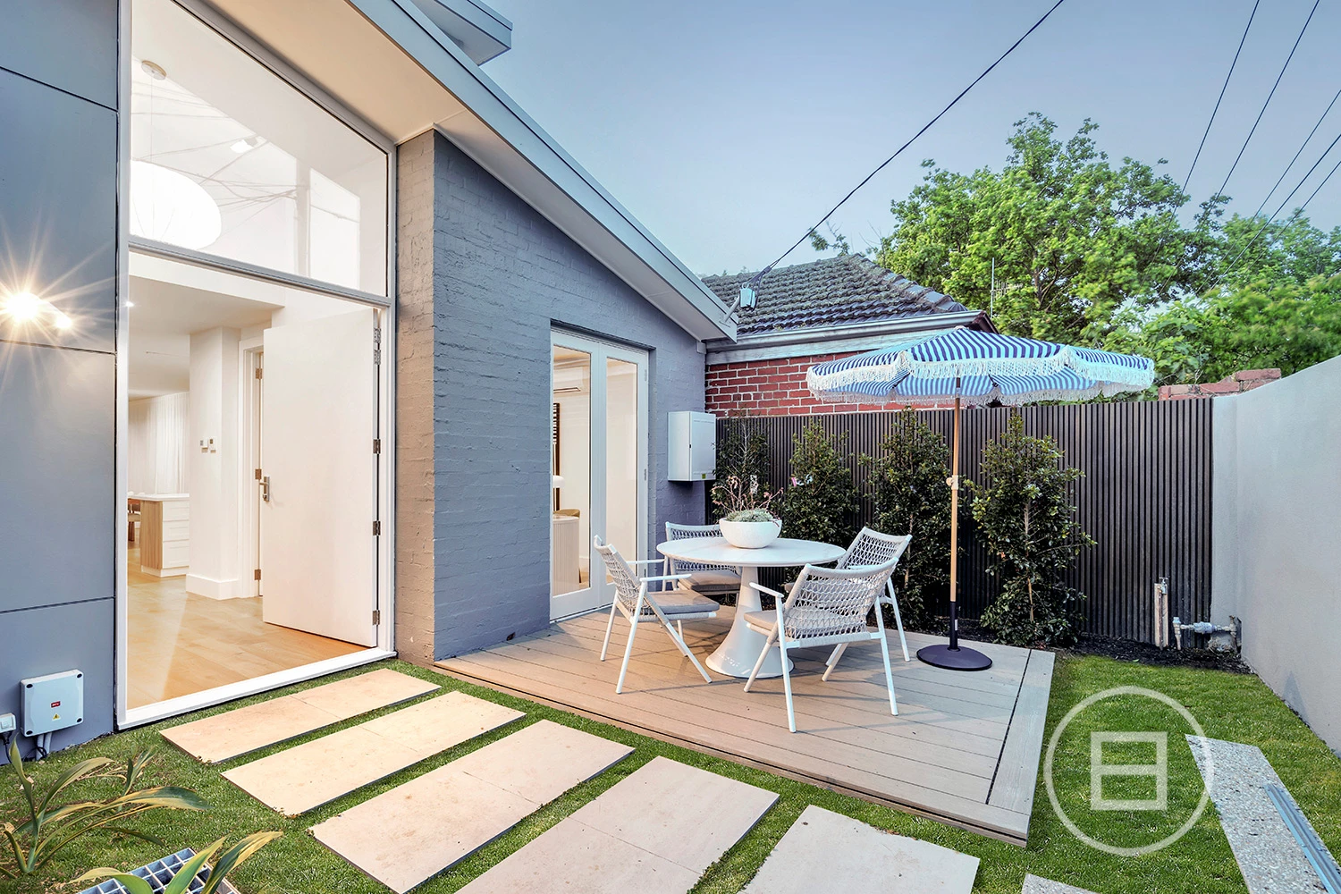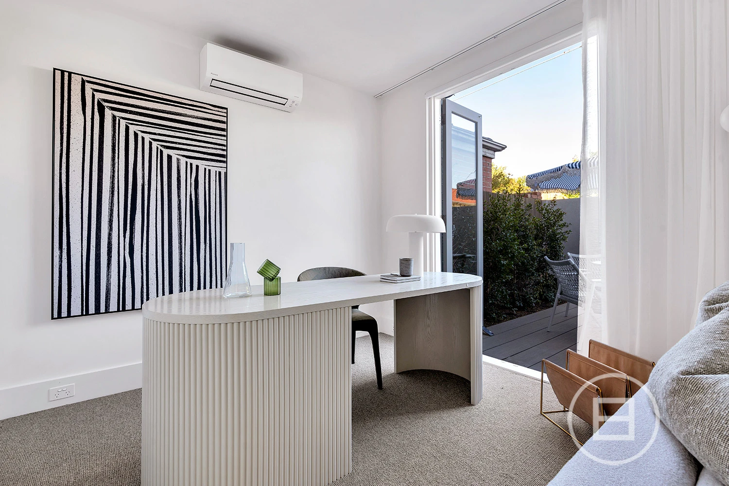 Upstairs, two spacious bedrooms—one with walk-in robes—adjoin a second living area with city skyline views. A high-end bathroom with underfloor heating and premium finishes completes the space. Outside, a landscaped courtyard with modwood decking creates an effortless indoor-outdoor connection, with a flexible room perfect for a home office or bar area.
