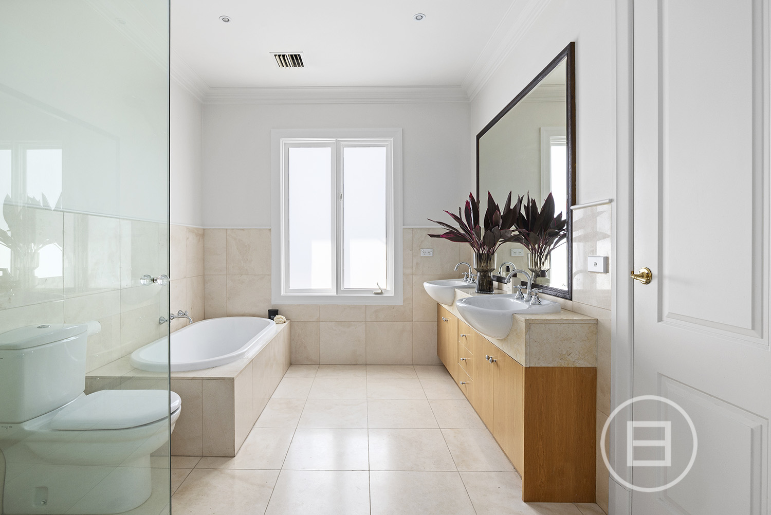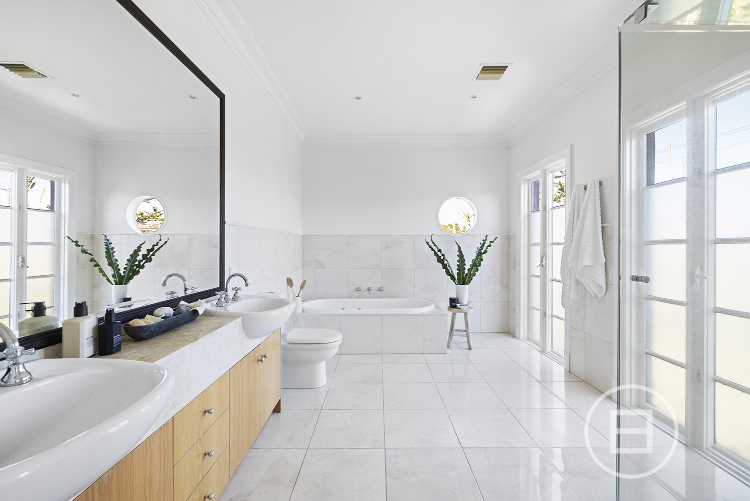 Four generous bedrooms upstairs include a substantial main suite with a bay-facing balcony, en-suite with bath and a walk-in robe, and three additional bedrooms with walk-in robes, including one with semi-ensuite access to the main bathroom. A fifth bedroom/guest suite with a walk-in robe and semi-ensuite access to the third bathroom sits on the ground floor, a perfect addition for guests or as a home office, with a private garden courtyard.