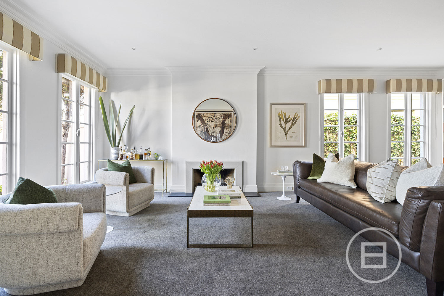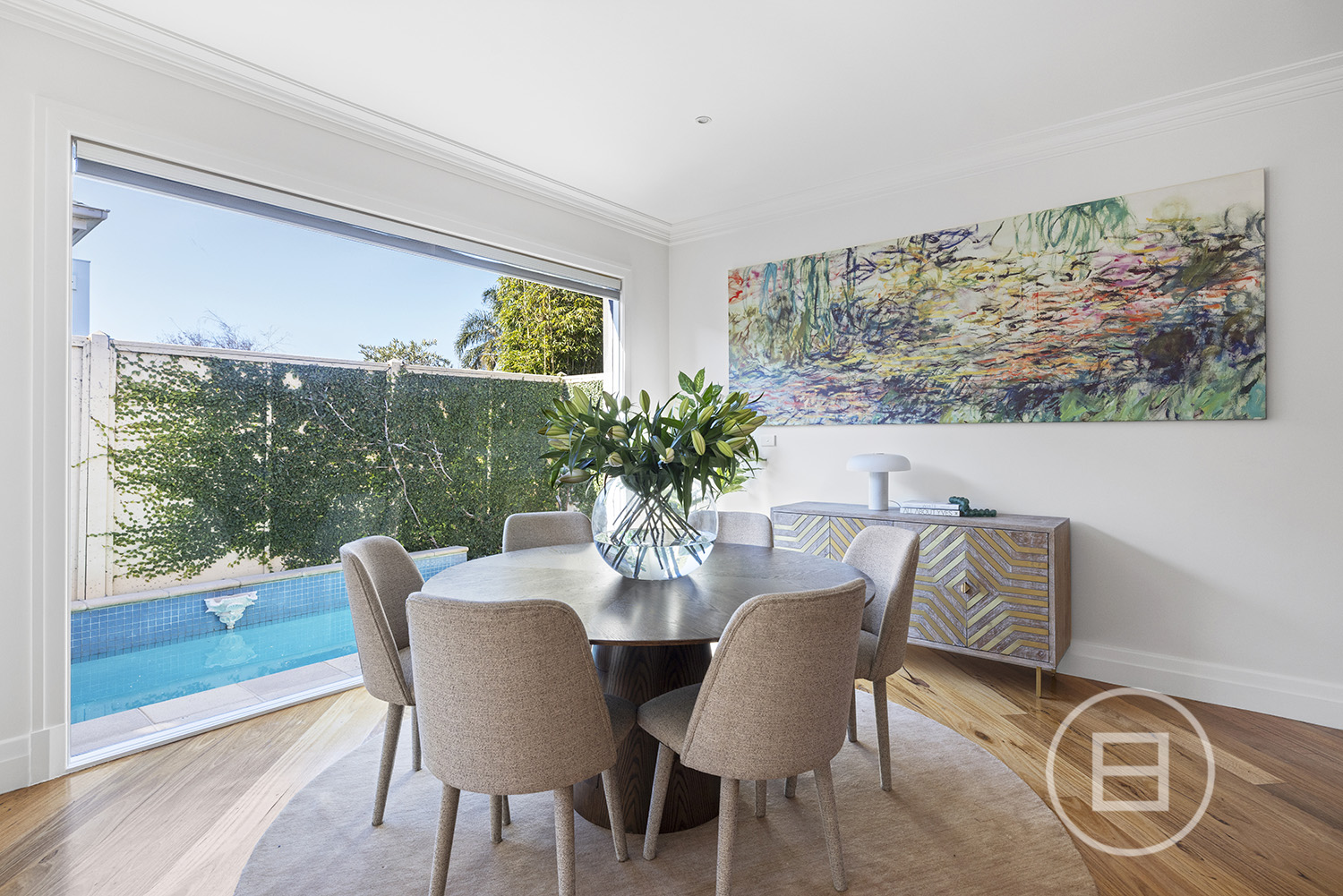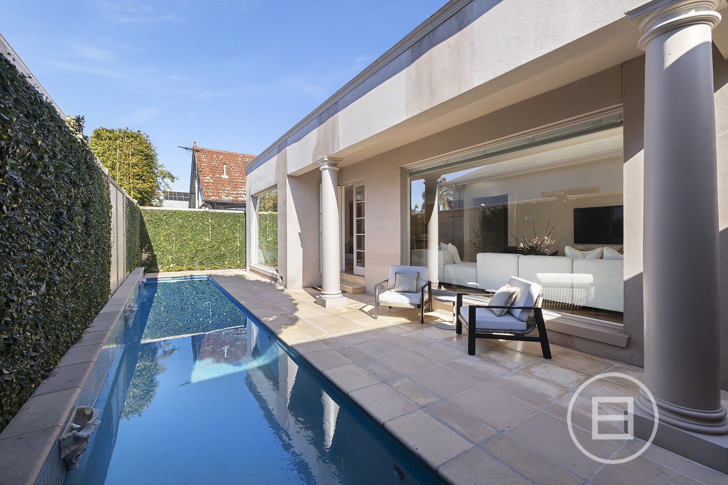 Reclaimed hardwood timber doors mark the entry to interiors lined with polished hardwood floors, high ceilings and multiple living domains. An open fireplace defines the formal lounge and dining, leading to an open-plan entertainer’s domain, with oversized picture windows that bring the pool and gardens into view. Granite finishes enrich the well-appointed kitchen, complete with stainless steel appliances and a walk-in pantry, while outdoors, a solar-heated lap pool with fountains and LED feature lighting offers total privacy for al-fresco dining day or night.