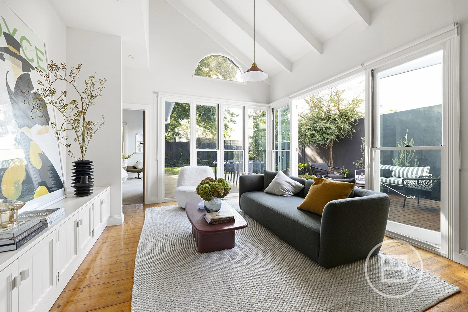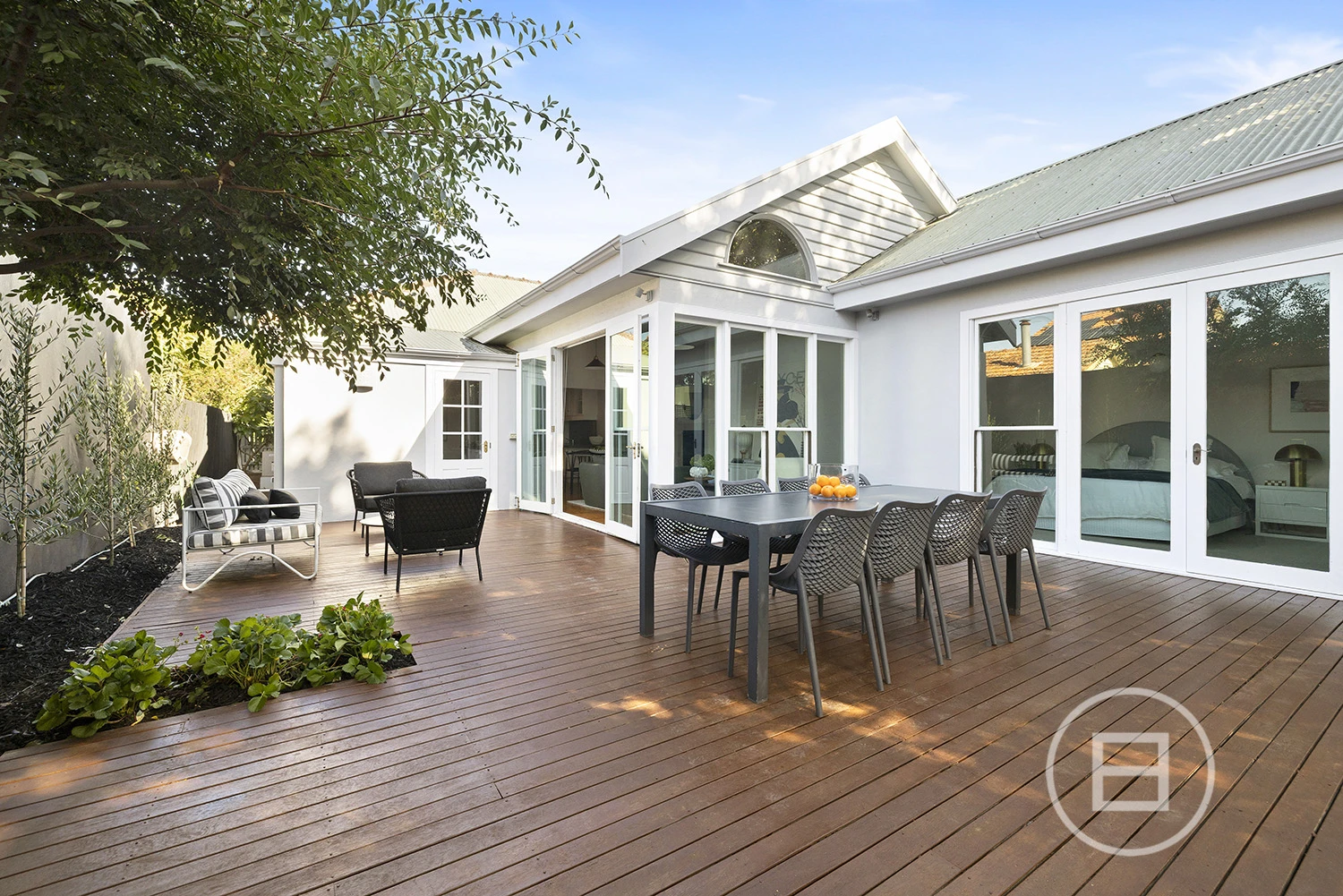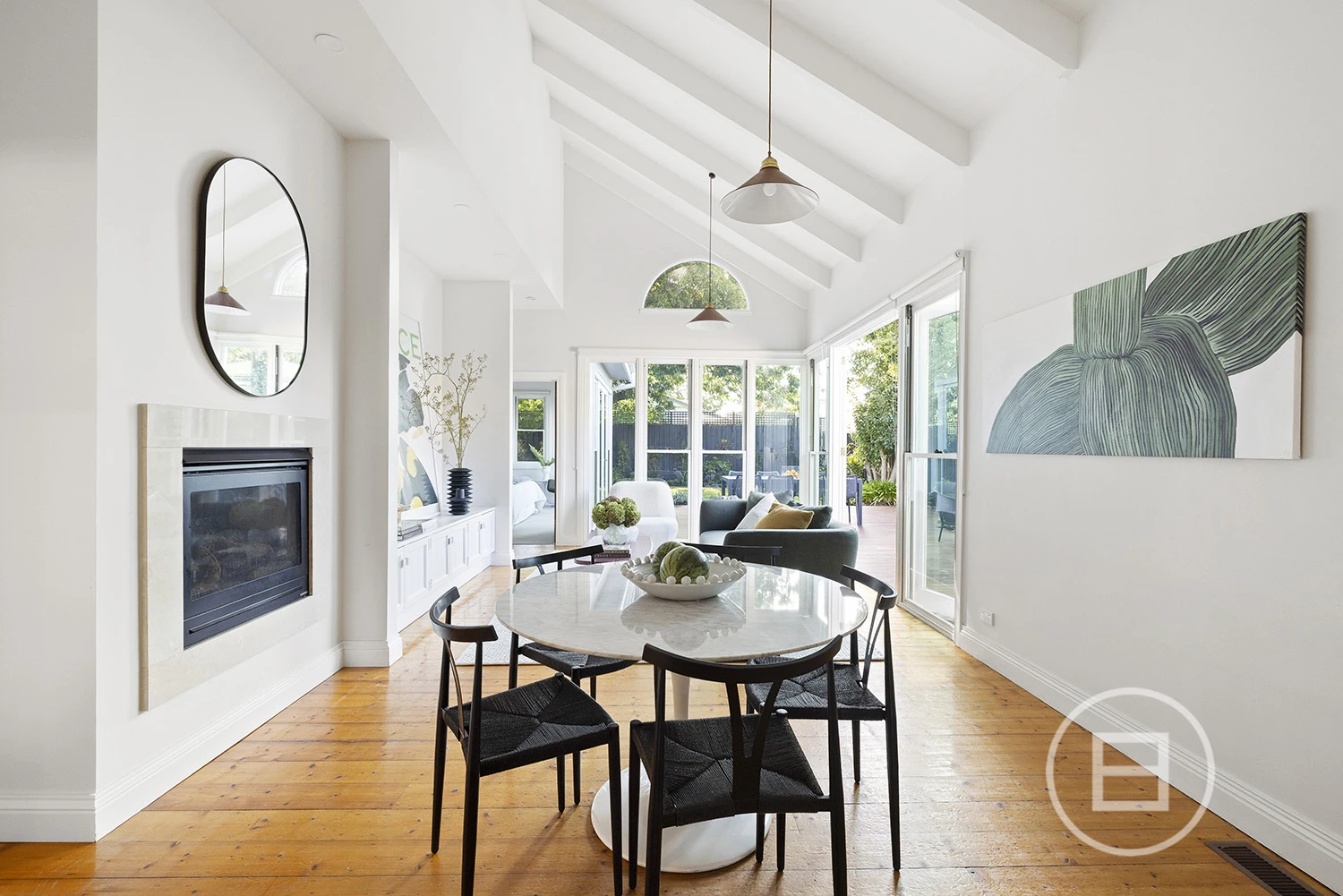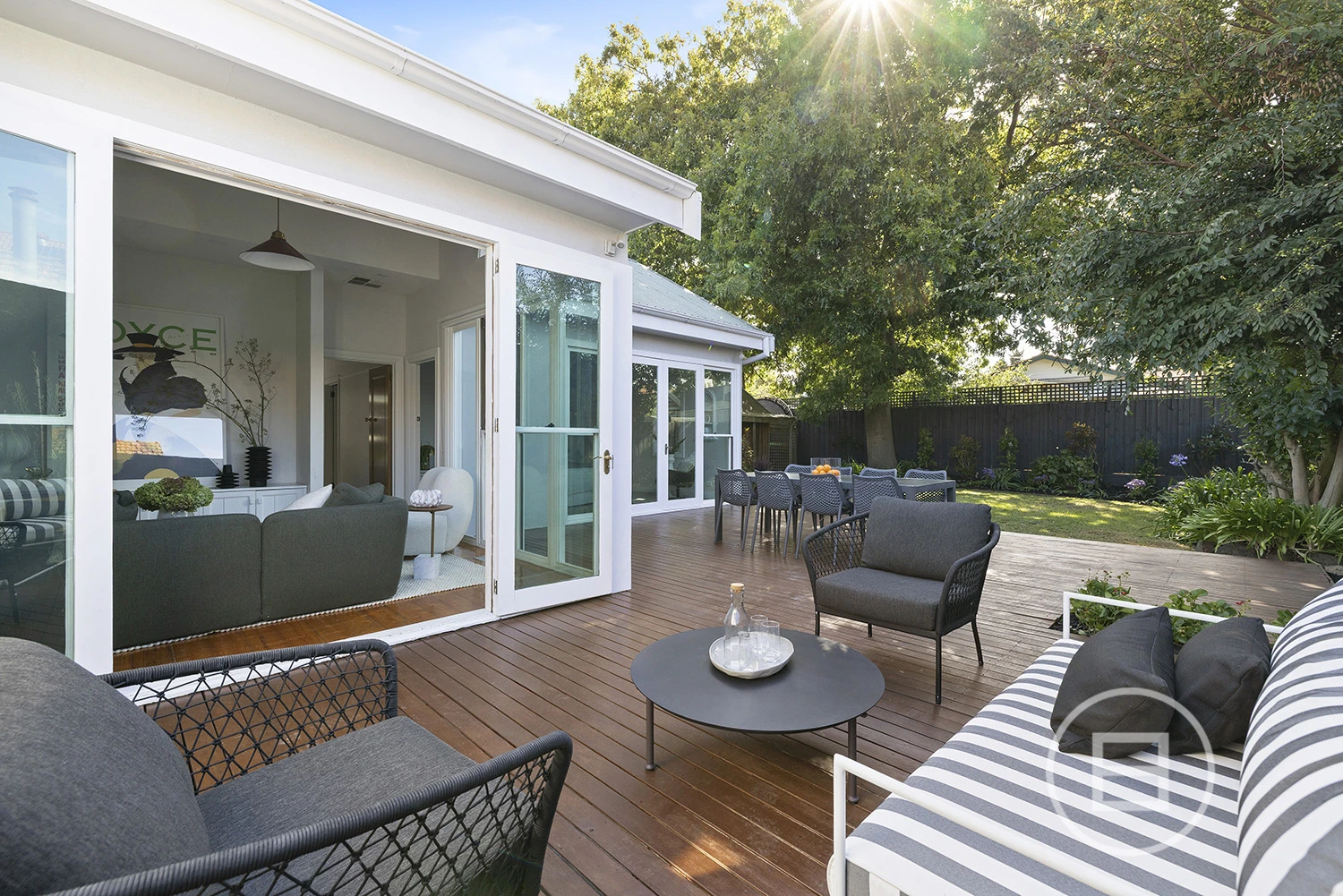 Endearing details in leadlight sash windows, high ceilings, and garden outlooks bring warmth and openness to the front of the home, with large formal living and dining rooms holding onto their original charm with open fireplaces. At the rear, the scale shifts up a gear - literally. The soaring cathedral ceiling lifts the open-plan living zone, where light floods in and a wall of glass connects to the deck and deep, established garden. It's an outdoor space that feels like an extension of the home: roomy, inviting, and ready for whatever the day holds, with a broad deck for al-fresco dining, red-brick paths and lush greenery at every turn.