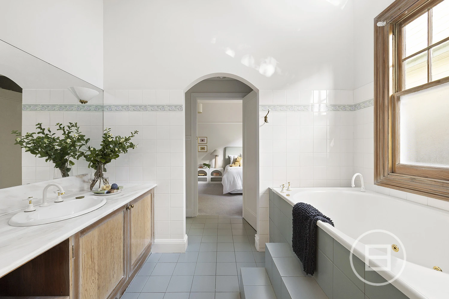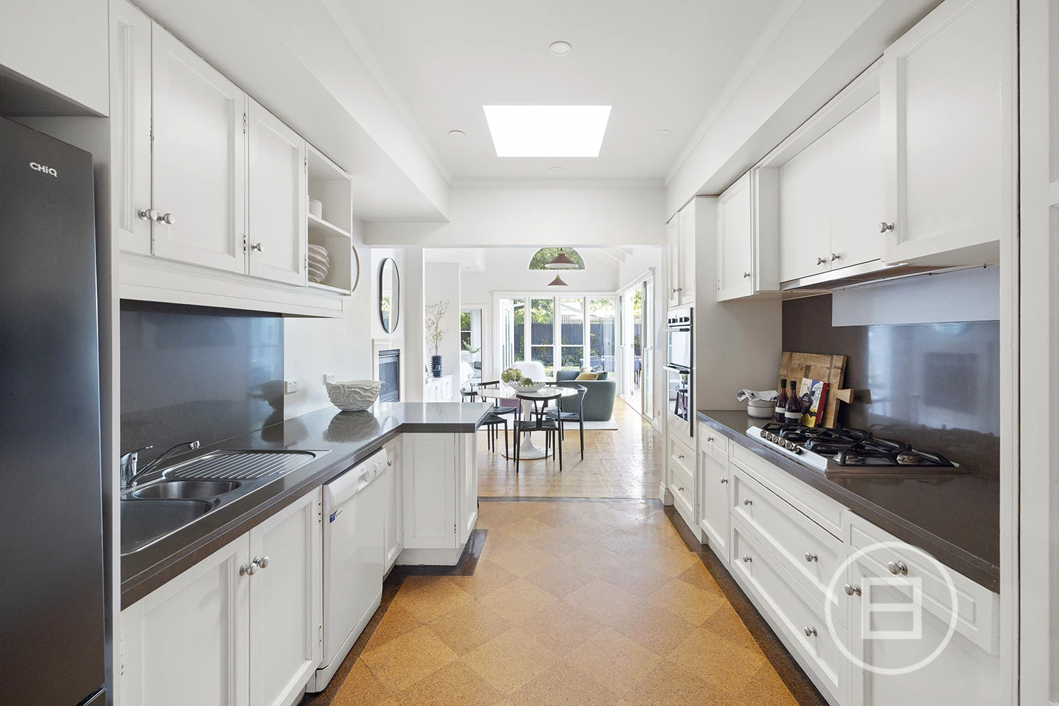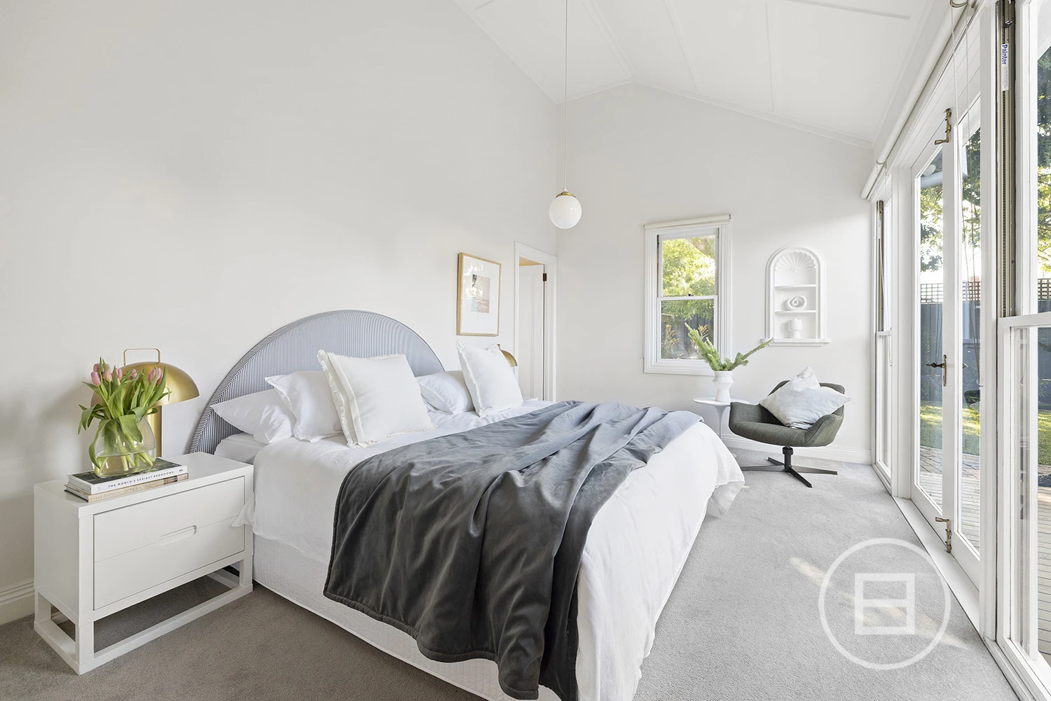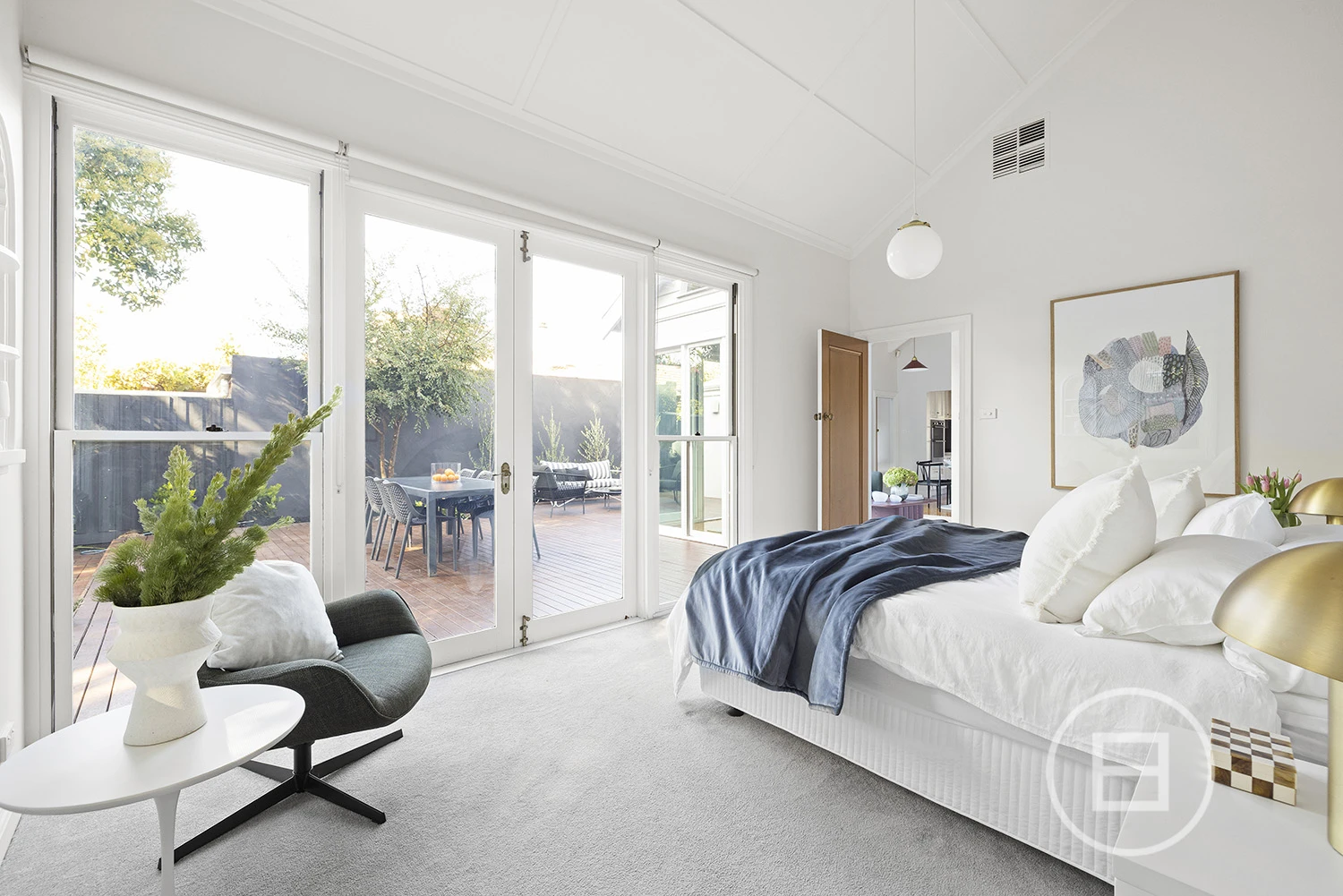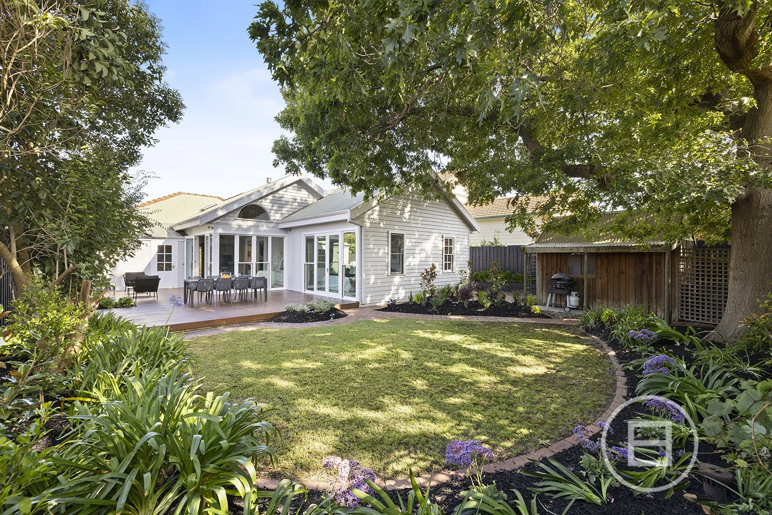 Endearing details in leadlight sash windows, high ceilings, and garden outlooks bring warmth and openness to the front of the home, with large formal living and dining rooms holding onto their original charm with open fireplaces. At the rear, the scale shifts up a gear - literally. The soaring cathedral ceiling lifts the open-plan living zone, where light floods in and a wall of glass connects to the deck and deep, established garden. It's an outdoor space that feels like an extension of the home: roomy, inviting, and ready for whatever the day holds, with a broad deck for al-fresco dining, red-brick paths and lush greenery at every turn.