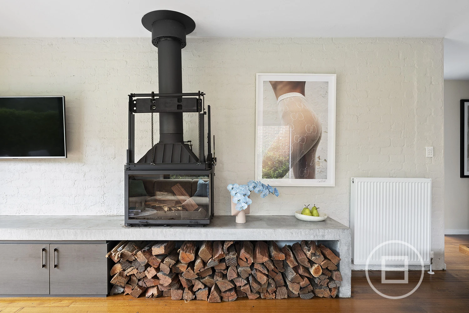 Every room invites natural light and garden views, with a stunning wrap-around deck framing the home’s lush, landscaped spaces. The stylish open-plan living domain with a spectacular Cheminee Philippe fireplace accompanies a gourmet kitchen featuring sleek stone benchtops, dark cabinetry, and premium appliances, including twin ovens, Bosch cooktop, and dishwasher. A seamless indoor-outdoor aspect flows through stacked sliding double-glazed doors to a wrap-around deck and landscaped gardens, shaded by an established oak tree for those breezy summer days.