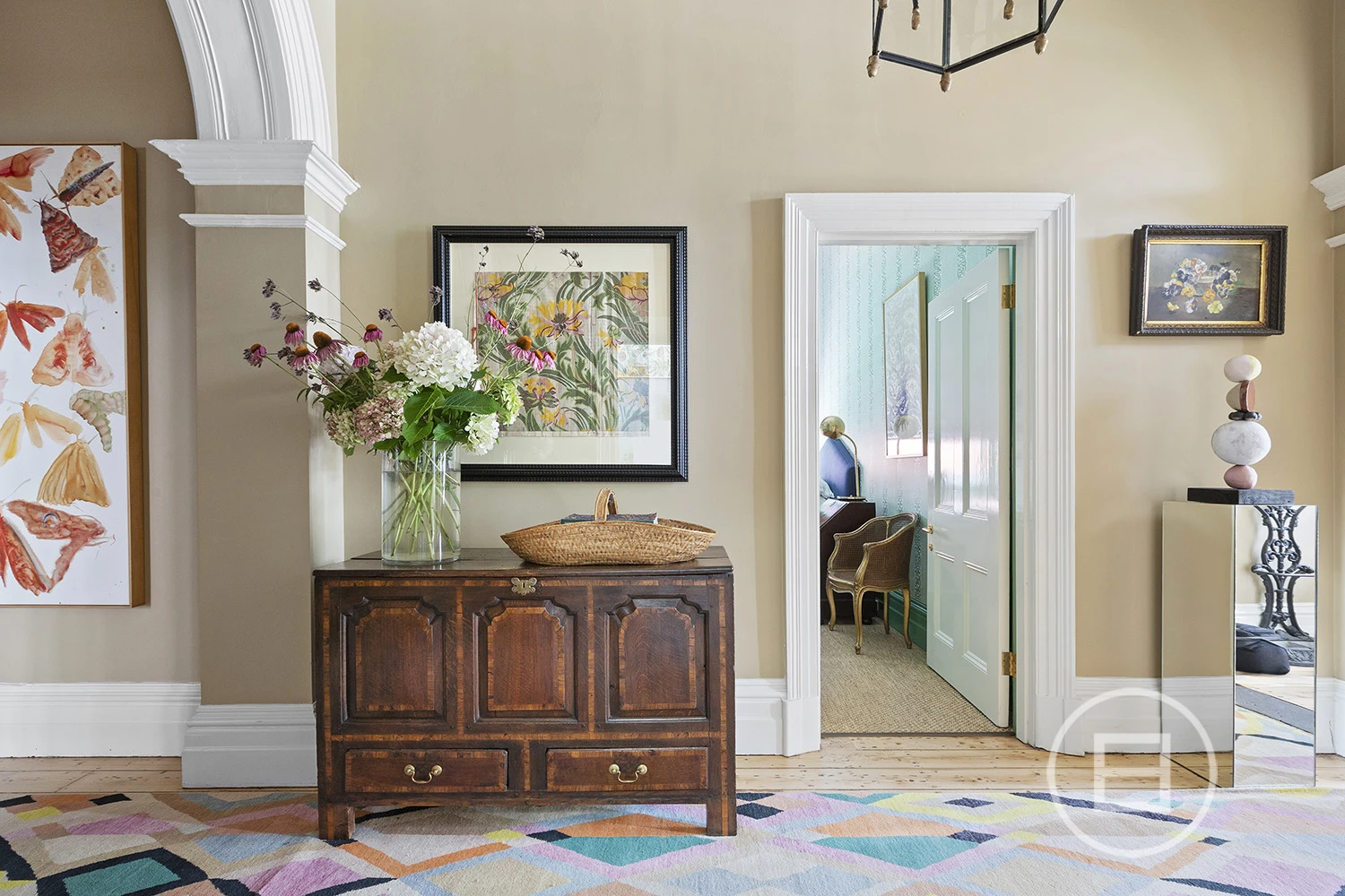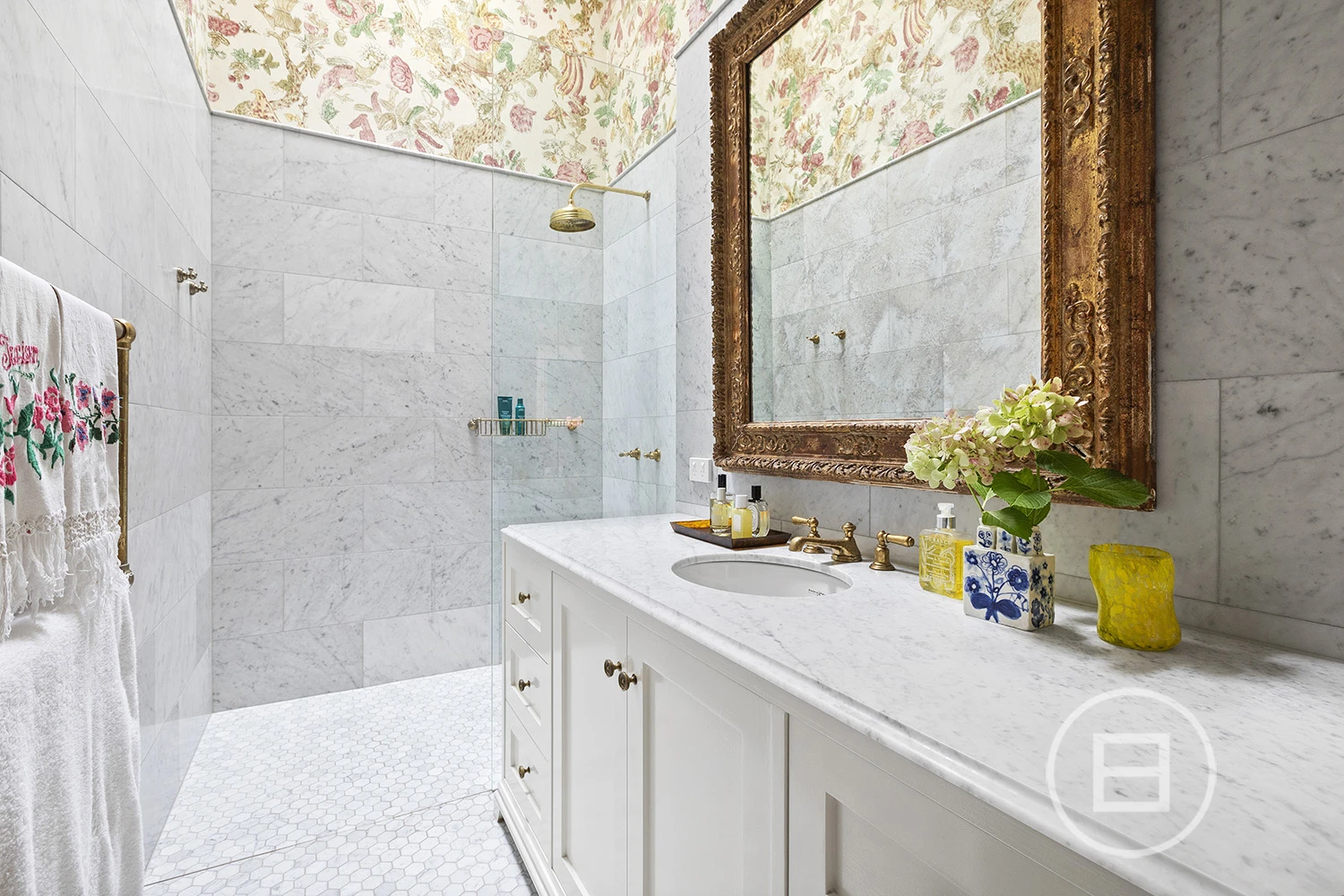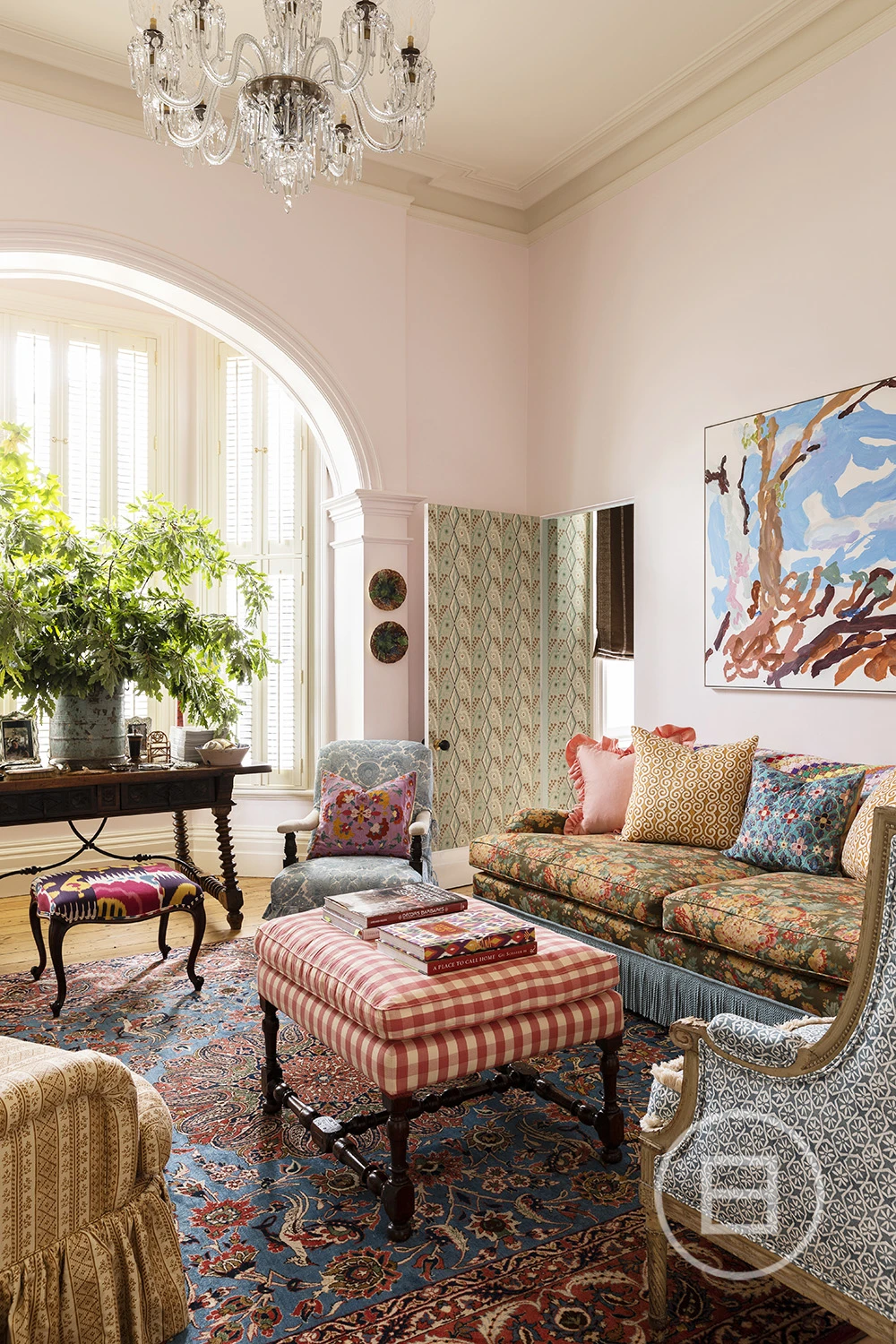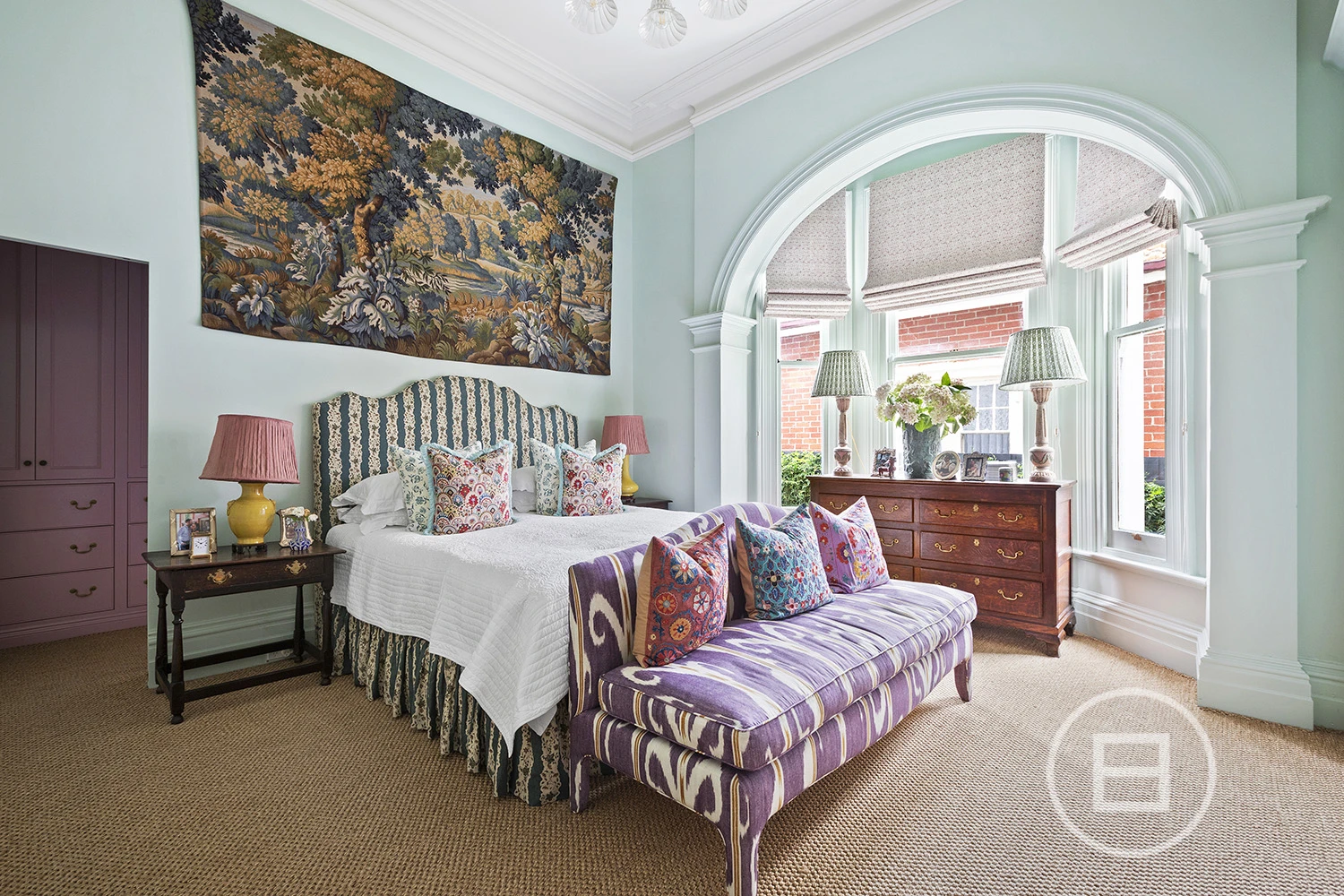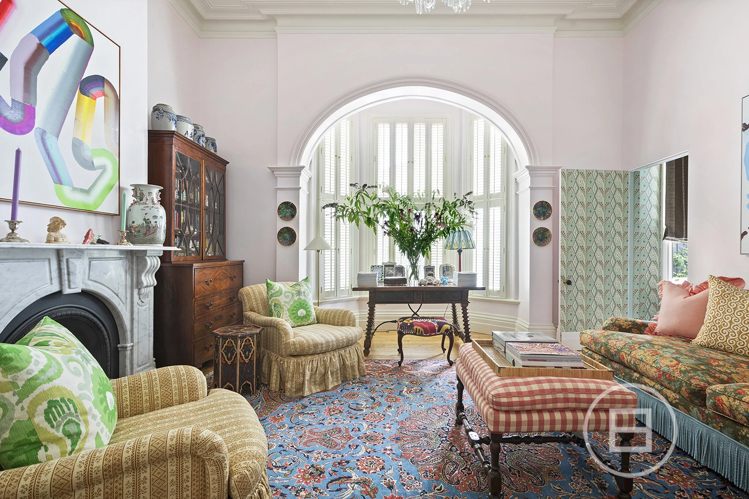 Featured in Belle Magazine (2023), the home exudes indulgence, with a lavish palette connecting the old with the new through intelligent light play, extravagant patterns, lashings of marble, and decadent imported fixtures. Through the triple arched hallway, an ambient open fireplace warms the gorgeous living room, highlighted by a 17th-century Irish crystal chandelier and a majestic arched bay window, whilst a hidden jib door adds whimsy, leading to the adjoining study/library.