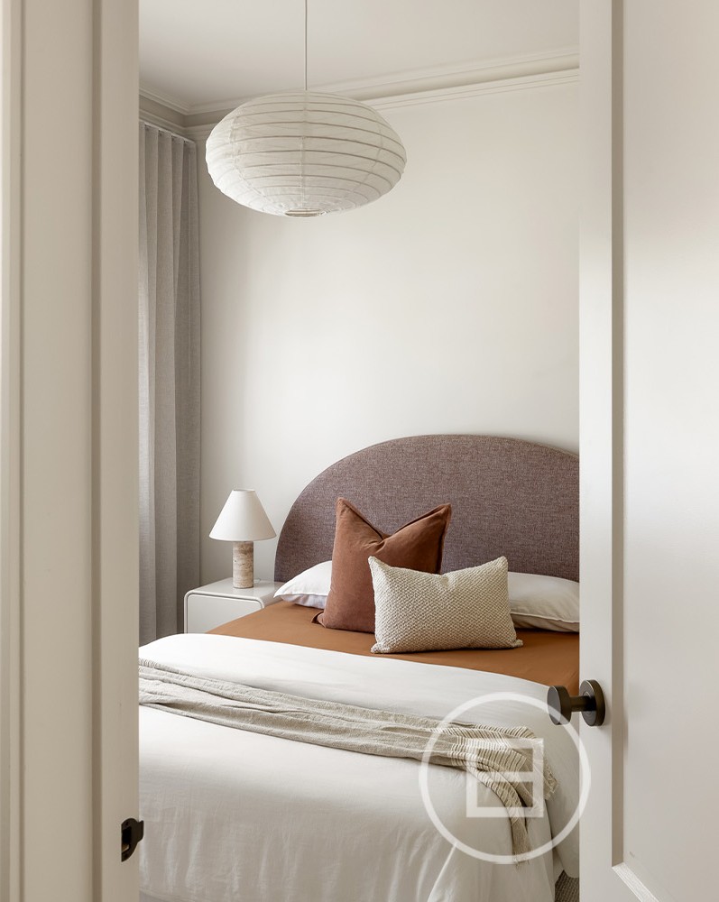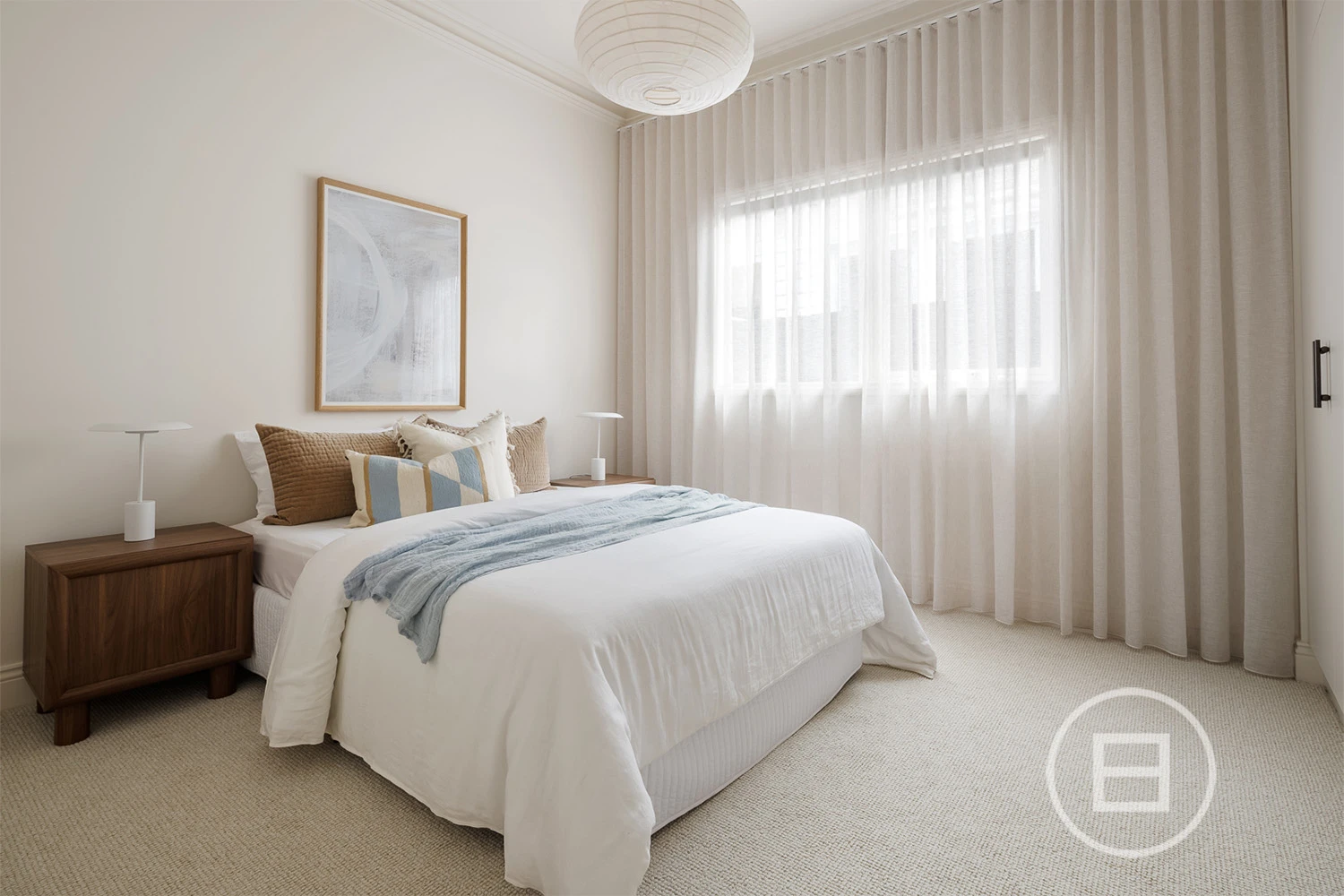 Anchoring first-class accommodation, a generous master features a sculpted bedhead, walk-in robe, and lavish ensuite with a skylit shower. High-end sheer curtains and entire walls of joinery add function and flair to guest, second and third bedrooms – well-served by a luxe bathroom with a freestanding soaker bath.