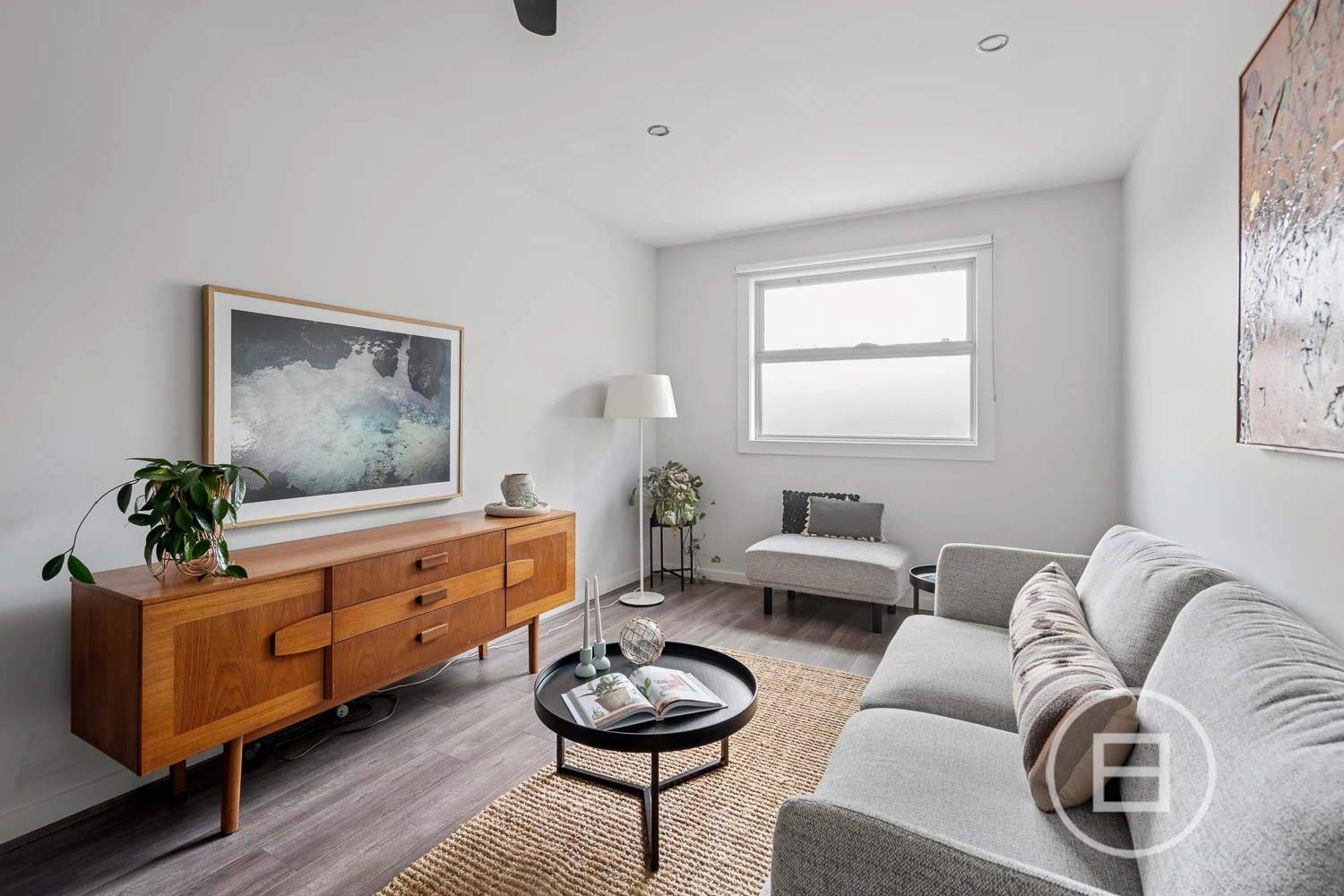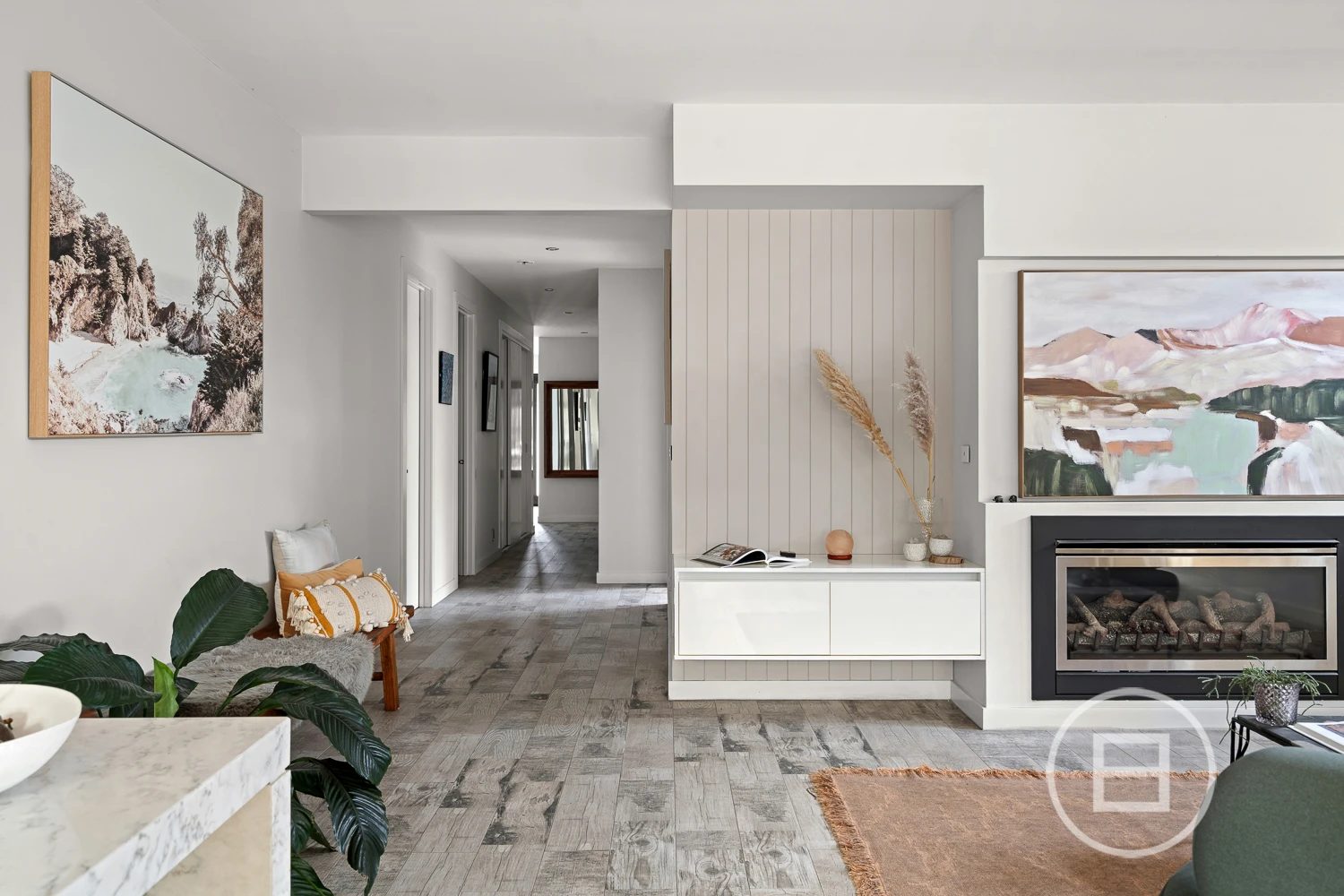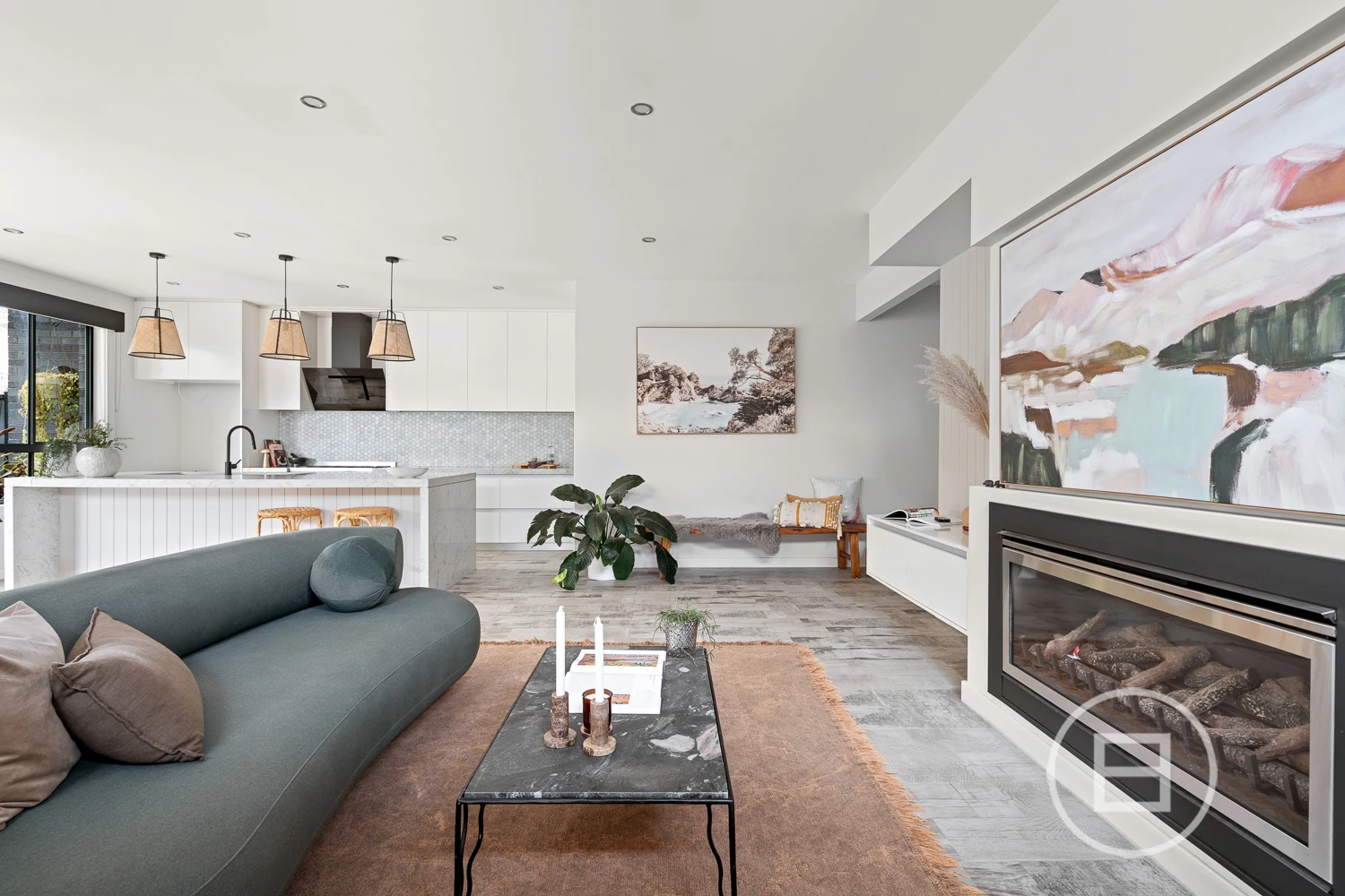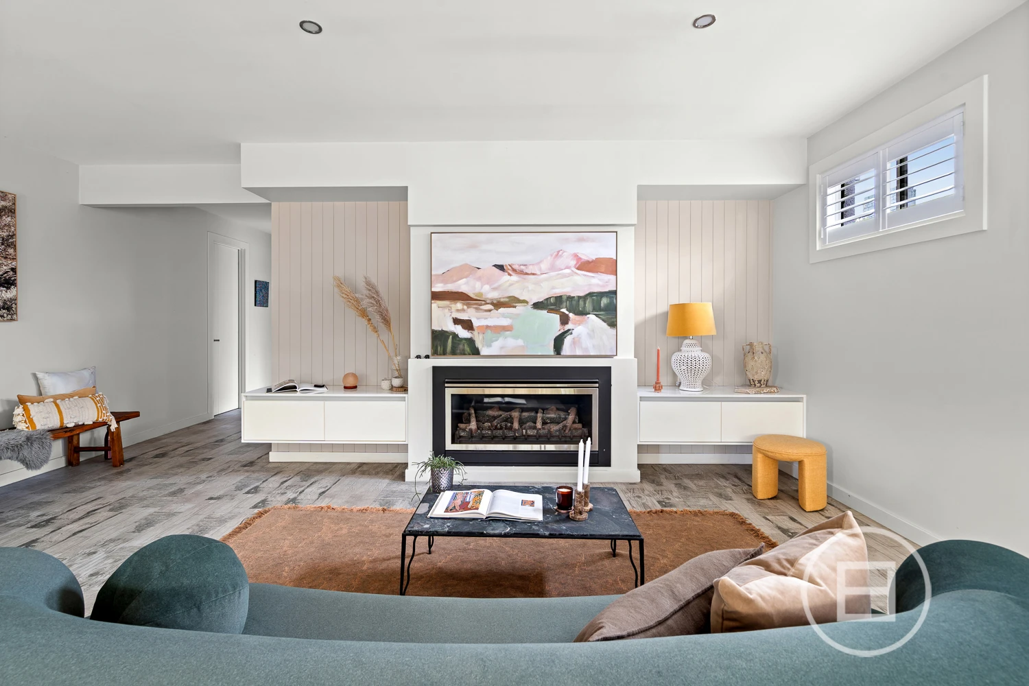 The main living area is designed to impress. A sleek entertainment wall and gas log fire ground the space, while full-width stacker doors open to an alfresco that is private, spacious, and idyllic, framed by a sun-warmed garden perfect for wandering barefoot.