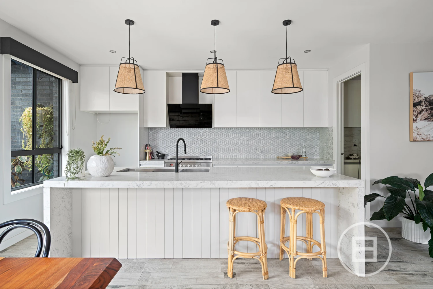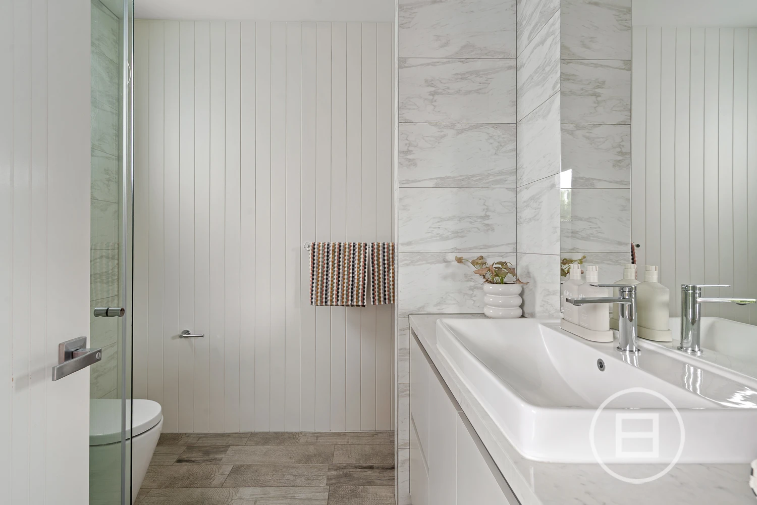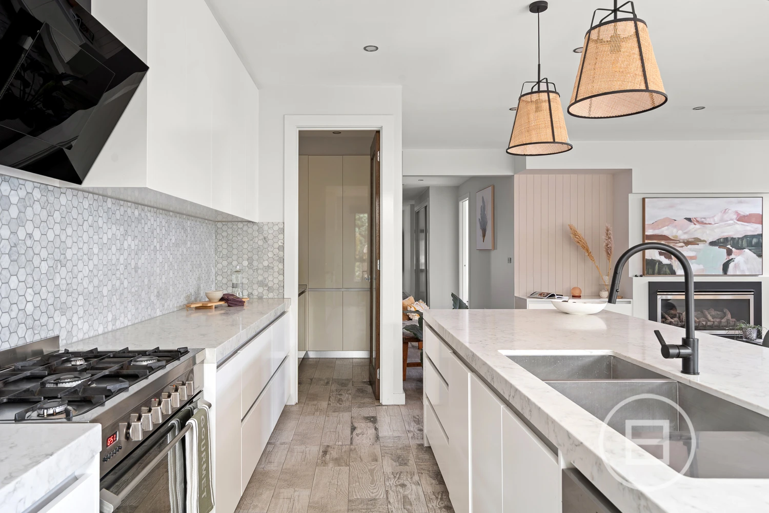 The premium kitchen echoes the home’s quiet luxury, anchored by a two-metre 40mm Caesarstone waterfall island. With 900mm appliances, soft-close joinery, a Bosch dishwasher and a fully equipped butler’s pantry, this heart-of-the-home kitchen blends everyday practicality and elevates hosting.