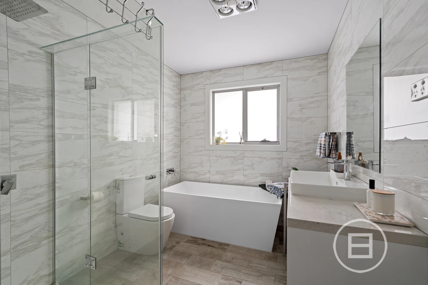 Accommodation is tailored for families who value flexibility. The ground-floor master suite offers genuine luxury with a fitted walk-in robe and stone-dressed ensuite, complemented by a versatile second bedroom or study with its own WIR. Upstairs, a generous retreat opens to three further bedrooms with built-in robes and a beautifully finished bathroom featuring a rainfall shower and deep soaker tub.