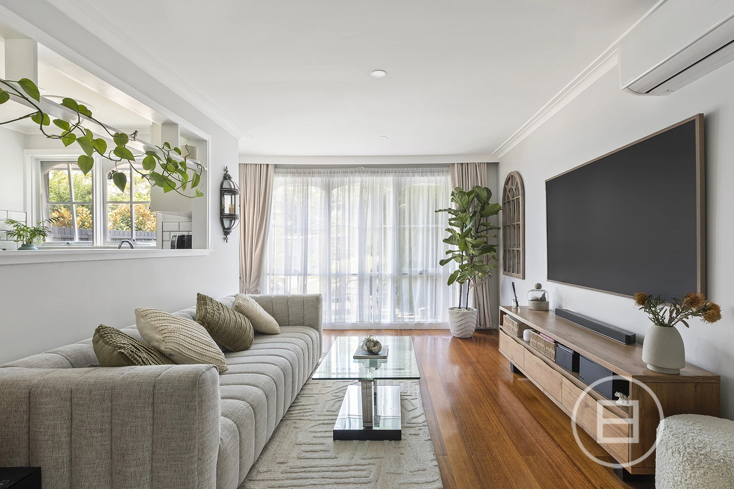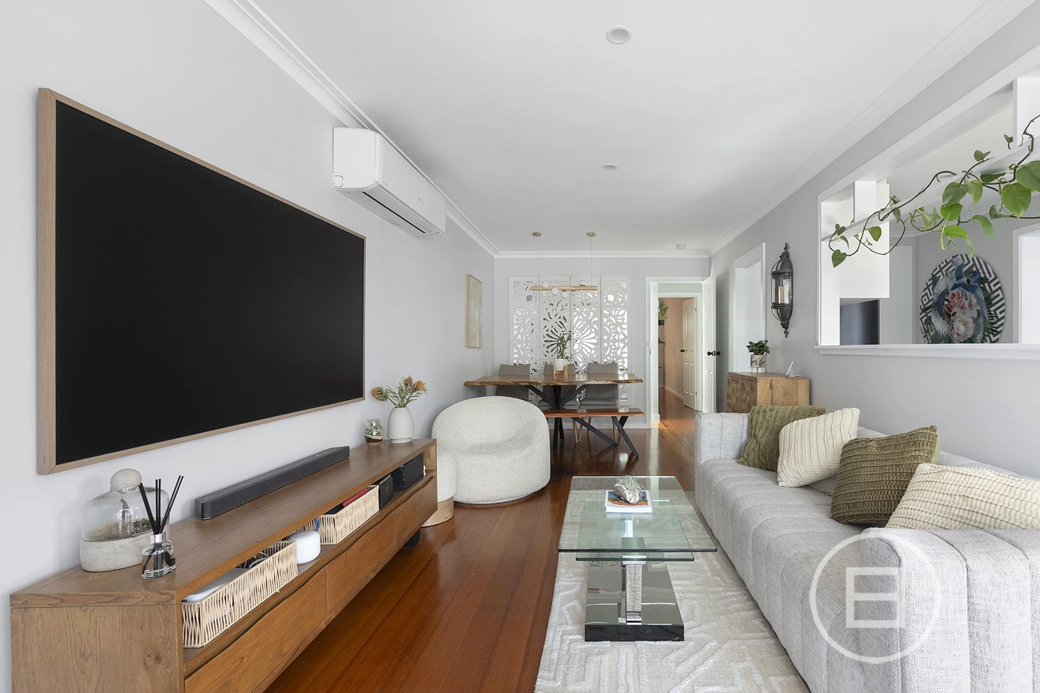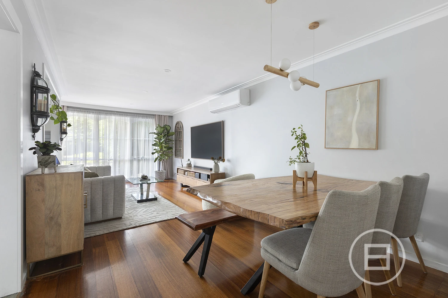 Light-filled and open-planned, it affords easy living with a large living/dining domain, wrapping around to the stylishly appointed kitchen and out into the afternoon sun in a private and secure rear courtyard. The kitchen, the heart of this inviting home, boasts raw-edge solid timber benchtops, quality appliances, and bespoke storage solutions that effortlessly combine style with functionality, creating a space perfect for the home chef and for entertaining with a servery to the living zone.