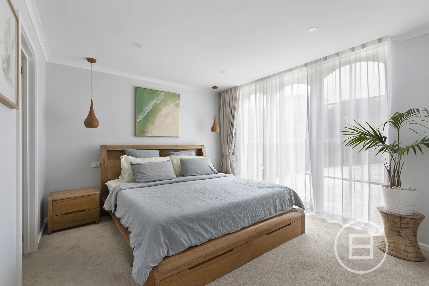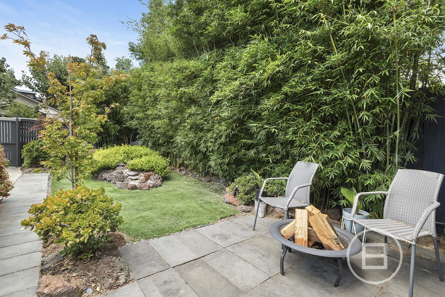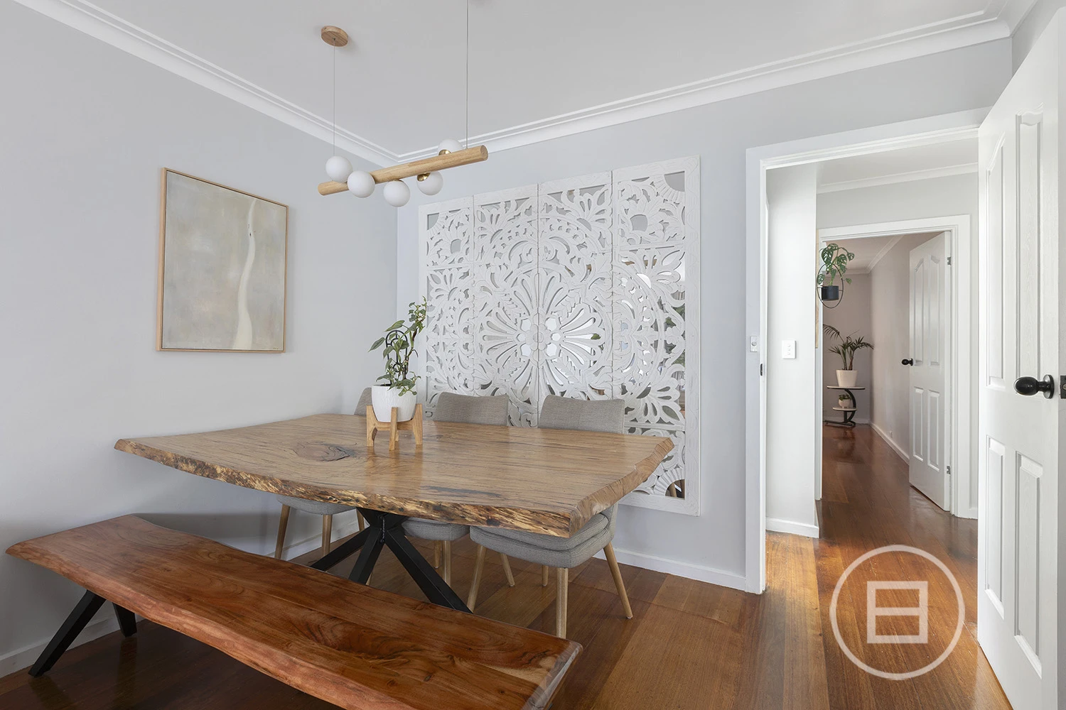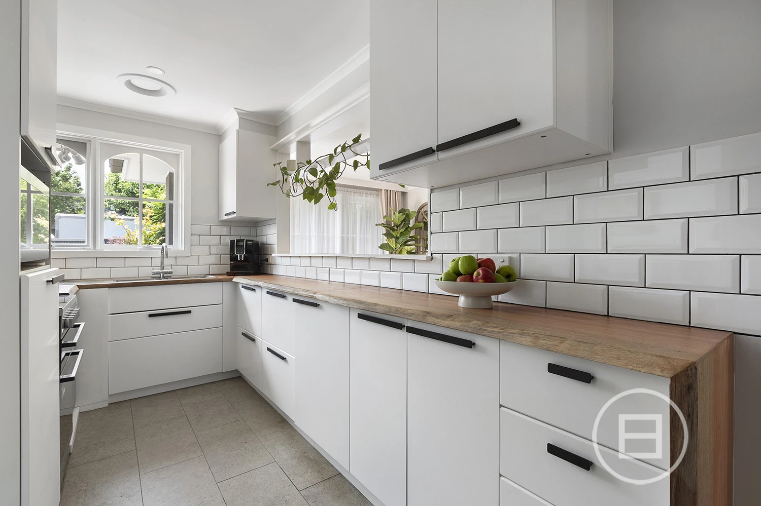 Light-filled and open-planned, it affords easy living with a large living/dining domain, wrapping around to the stylishly appointed kitchen and out into the afternoon sun in a private and secure rear courtyard. The kitchen, the heart of this inviting home, boasts raw-edge solid timber benchtops, quality appliances, and bespoke storage solutions that effortlessly combine style with functionality, creating a space perfect for the home chef and for entertaining with a servery to the living zone.