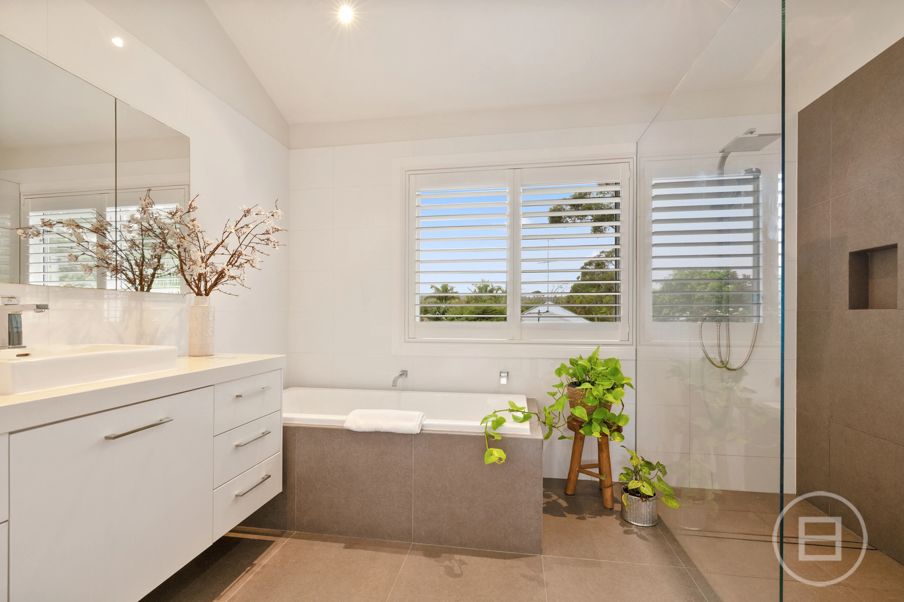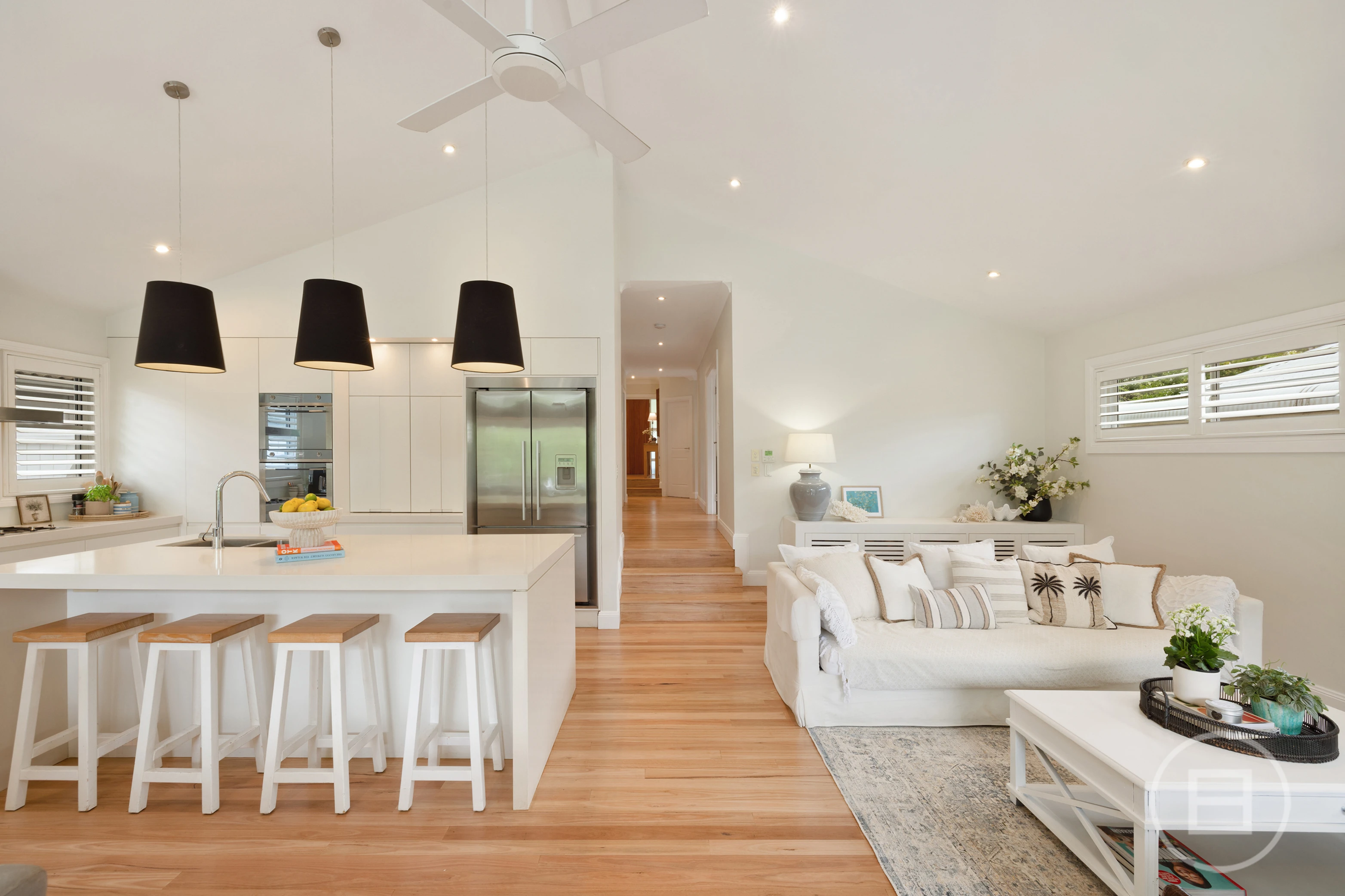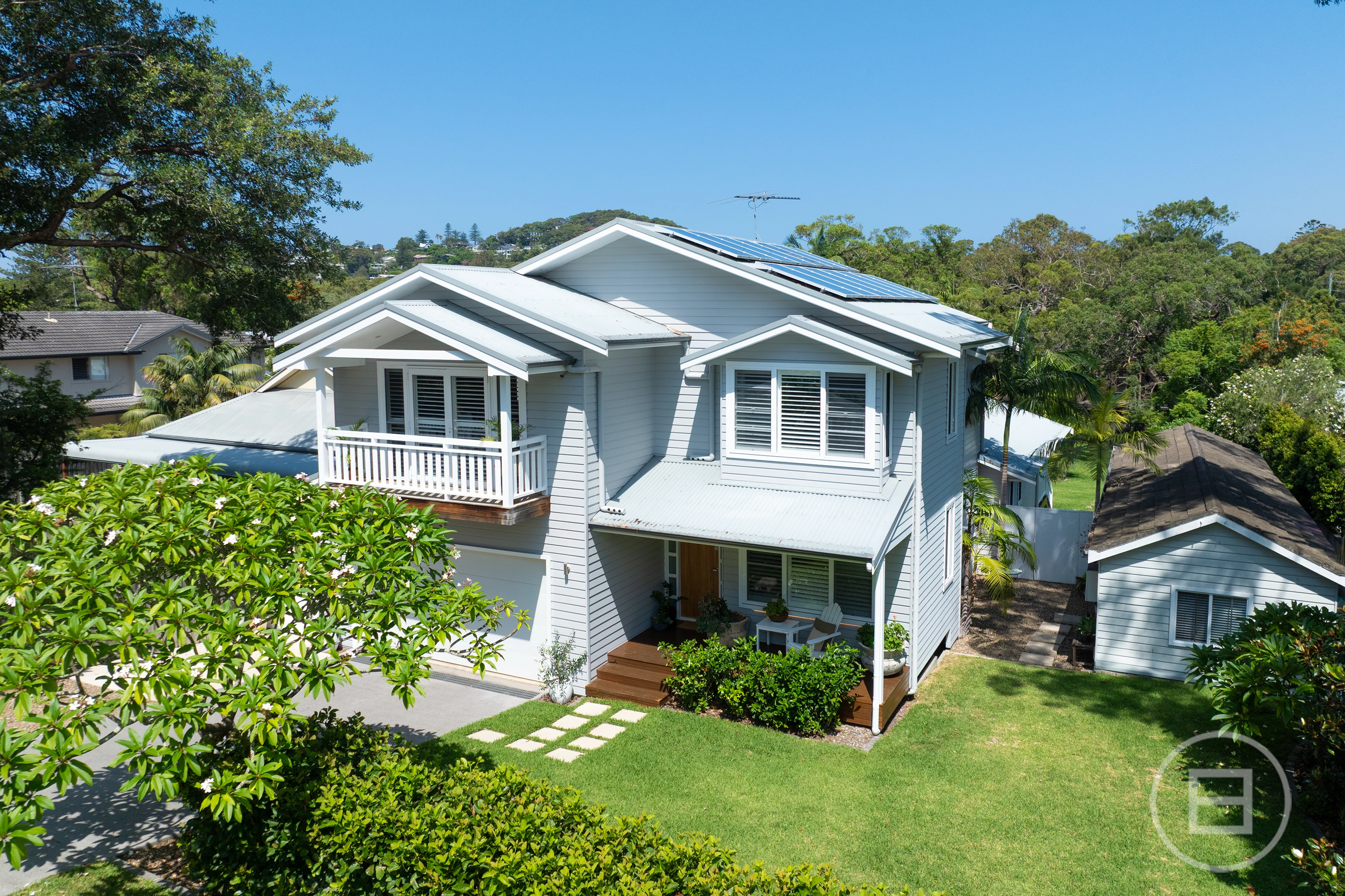 Spacious bedrooms are appointed with built-ins, while the palatial main suite features a private ensuite, walk in robe, a leafy north-facing balcony and ample space for a sitting area or study. The ultra-modern bathrooms showcase heated flooring for added comfort. Soaring raked ceilings and expanses of glass enhance the sense of space, natural light and airflow. Blackbutt floorboards and plantation shutters underscore the relaxed coastal aesthetic, while solar roof panels, ducted air-conditioning and ceiling fans ensure year-round energy efficiency and climate control.