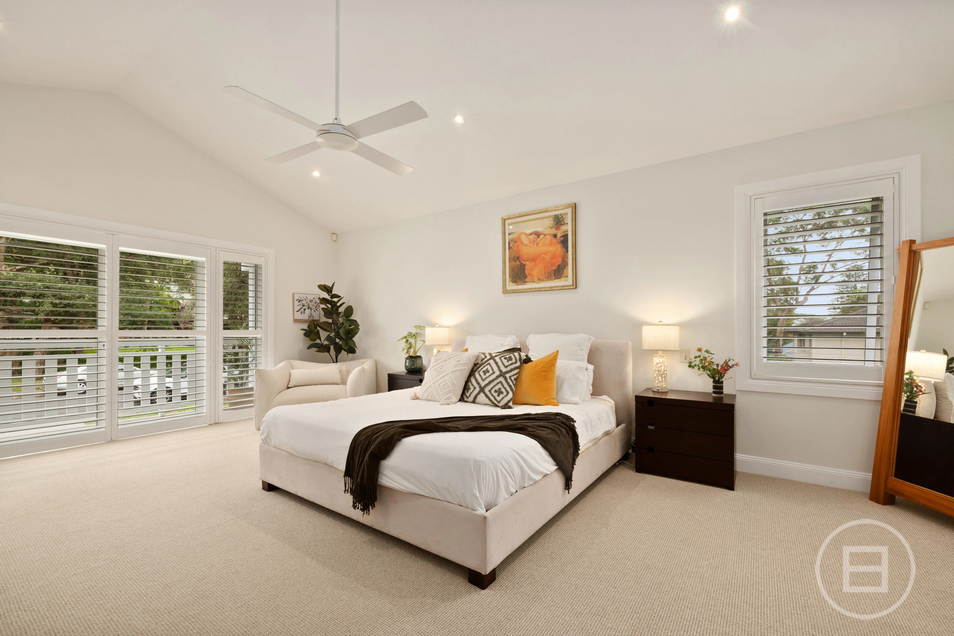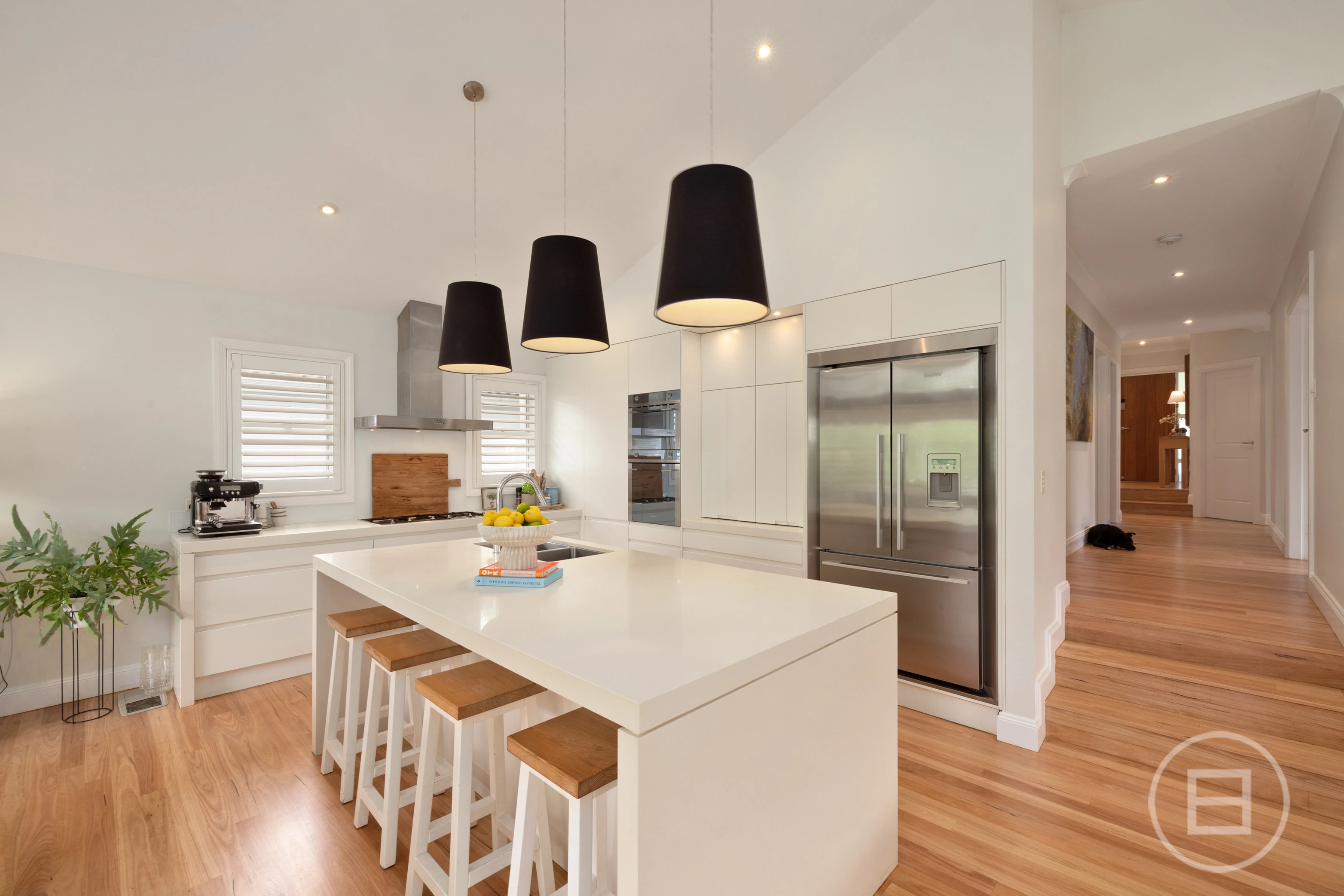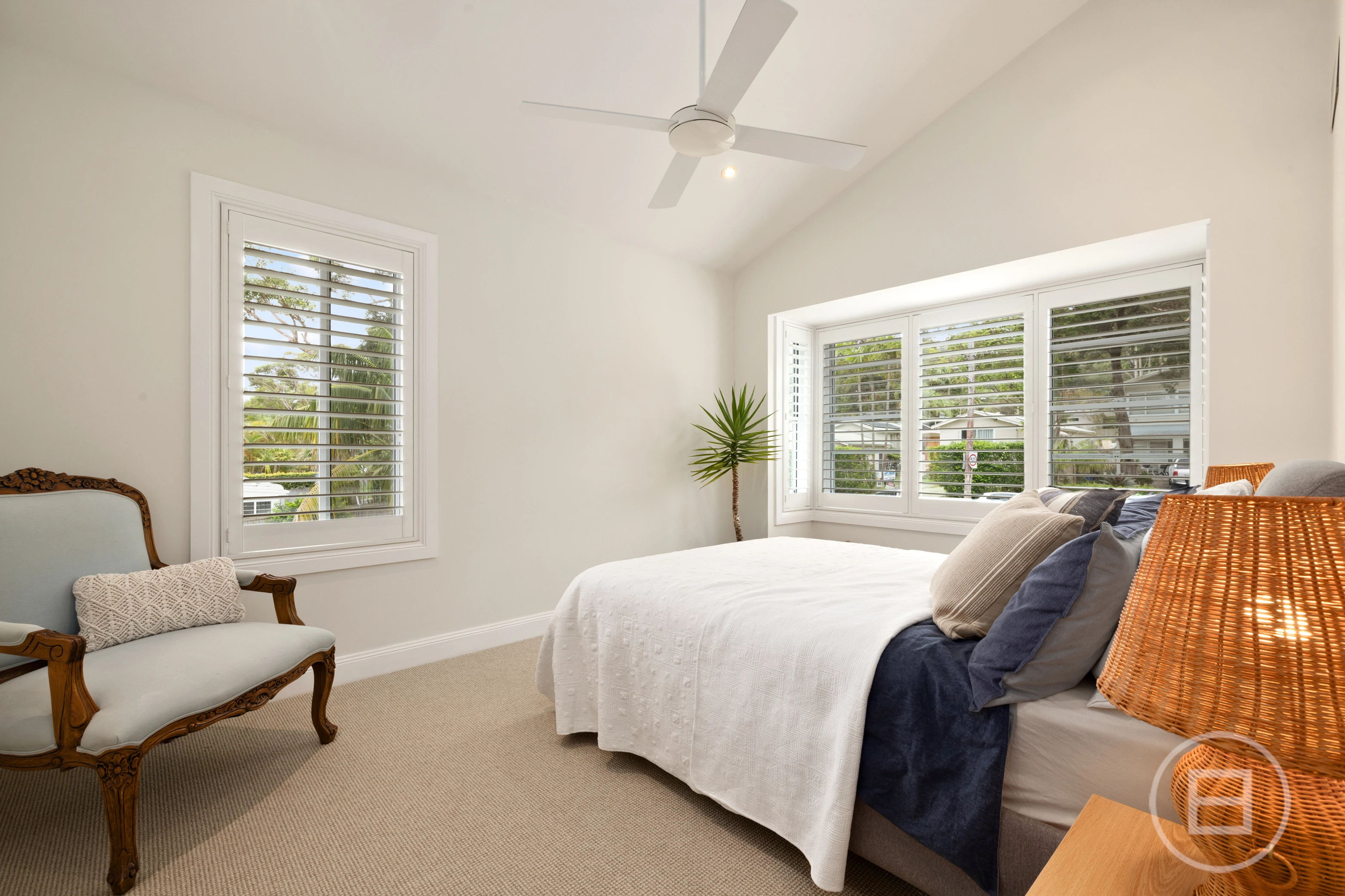 Spacious bedrooms are appointed with built-ins, while the palatial main suite features a private ensuite, walk in robe, a leafy north-facing balcony and ample space for a sitting area or study. The ultra-modern bathrooms showcase heated flooring for added comfort. Soaring raked ceilings and expanses of glass enhance the sense of space, natural light and airflow. Blackbutt floorboards and plantation shutters underscore the relaxed coastal aesthetic, while solar roof panels, ducted air-conditioning and ceiling fans ensure year-round energy efficiency and climate control.