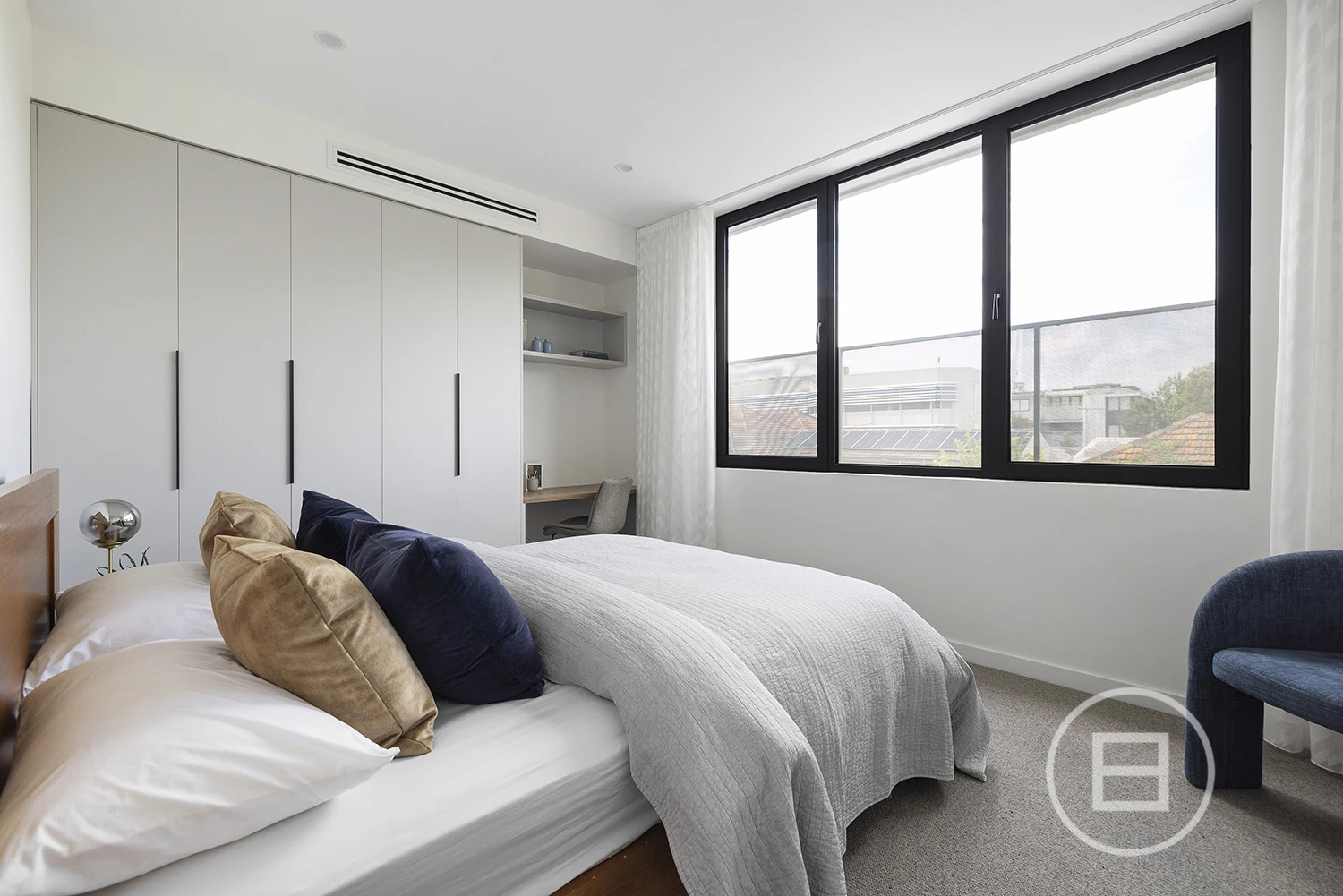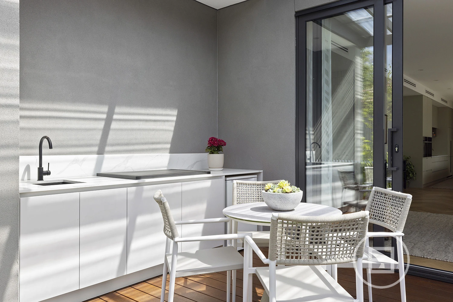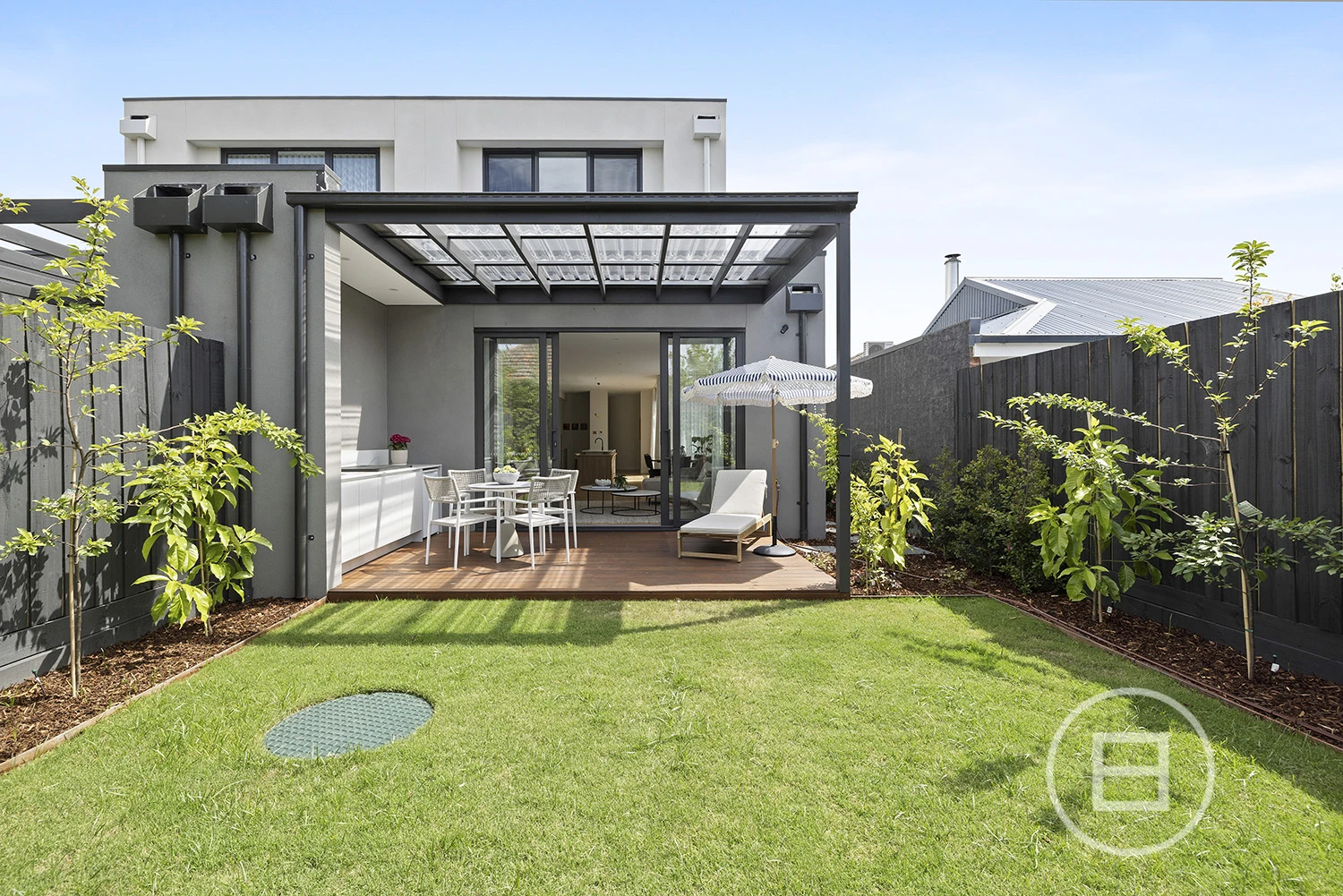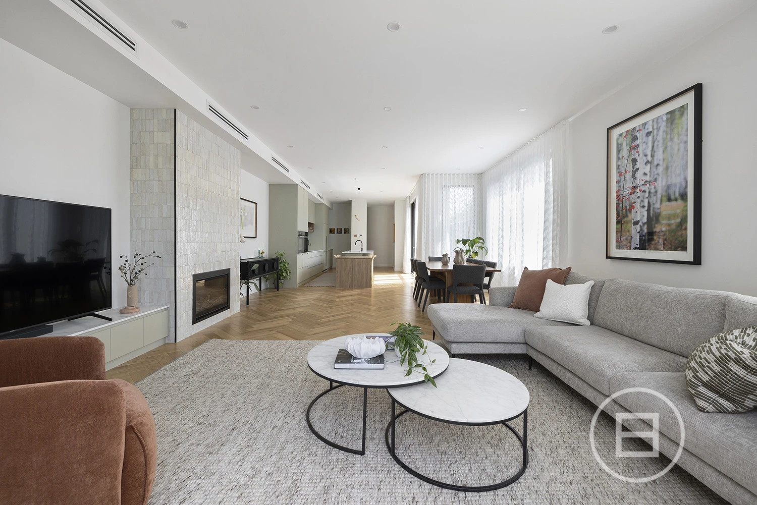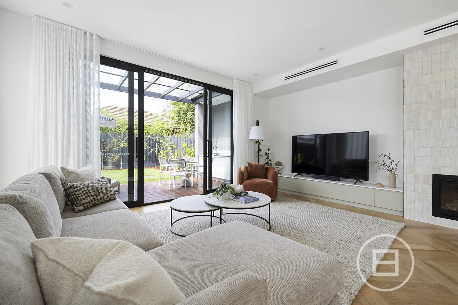 The expansive open-plan living and dining area features a gourmet kitchen with premium Miele appliances, an oversized butler’s pantry, and elegant stone finishes. With abundant natural light streaming through the north-facing orientation, the space is as functional as it is inviting, anchored by a Moroccan-tiled gas fireplace. Effortlessly transition to the covered alfresco, complete with an integrated BBQ—perfect for both relaxed mornings and sophisticated evenings.