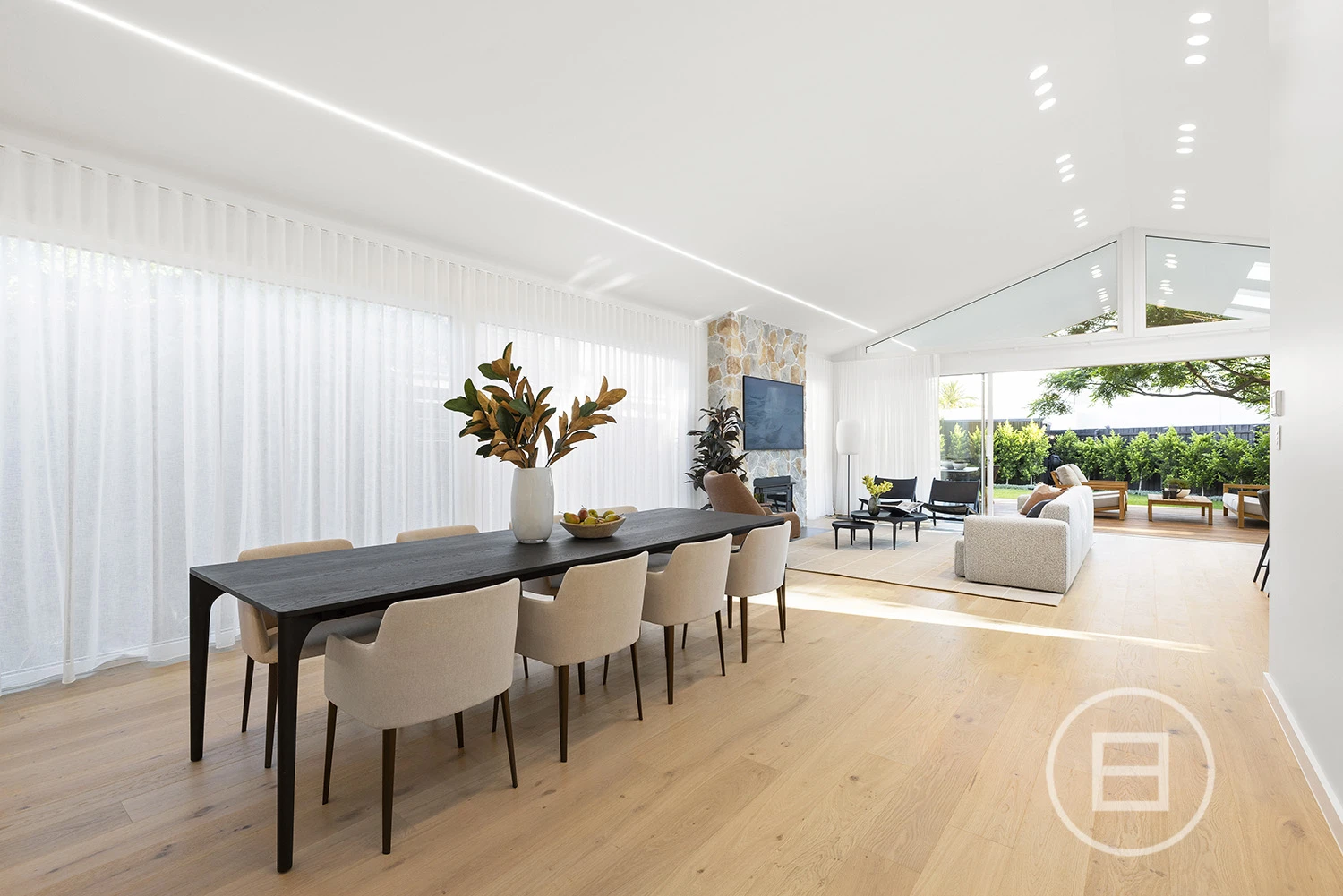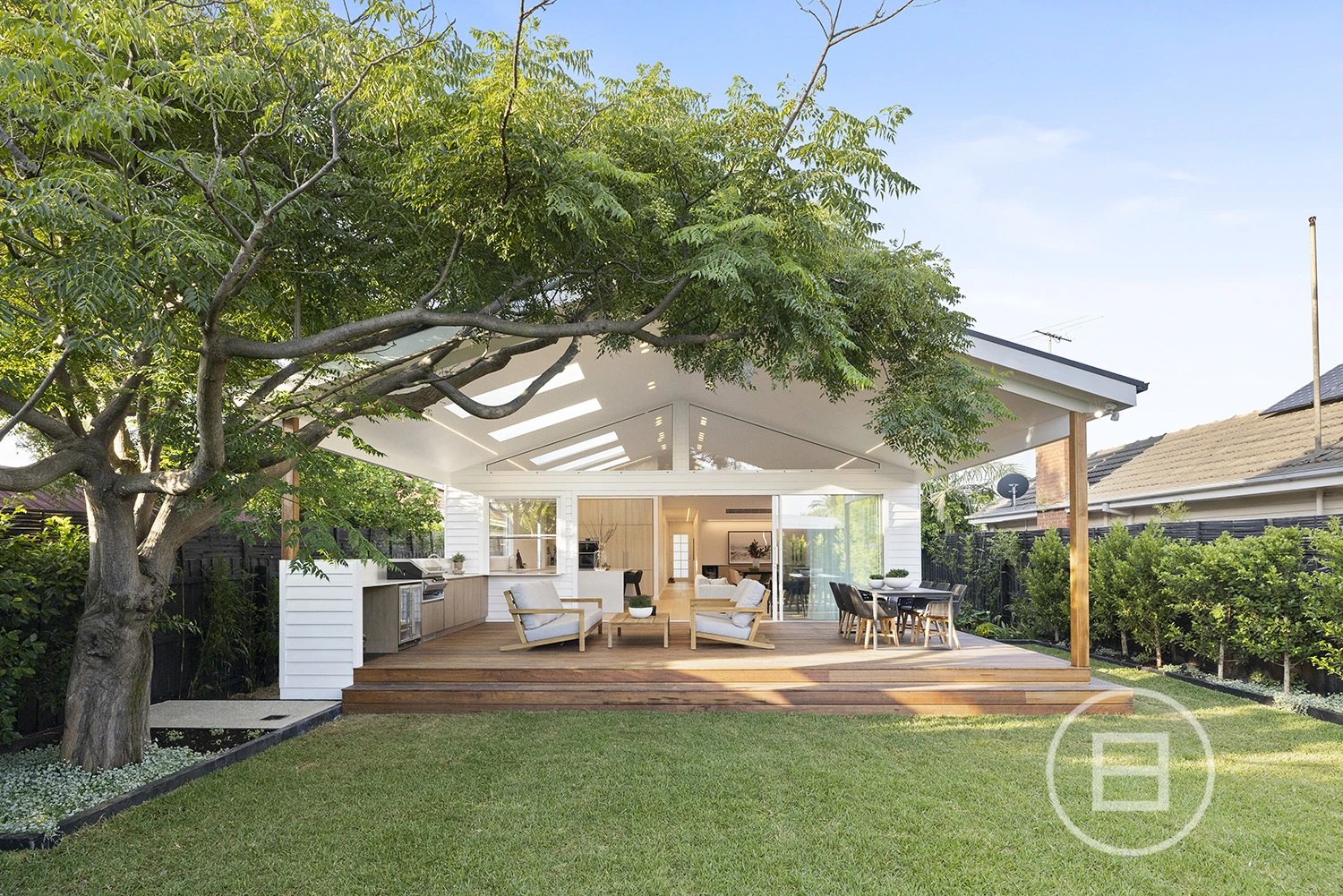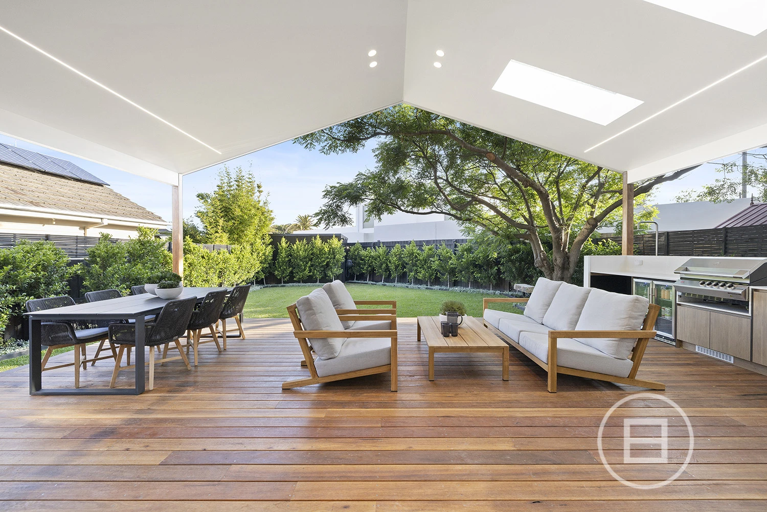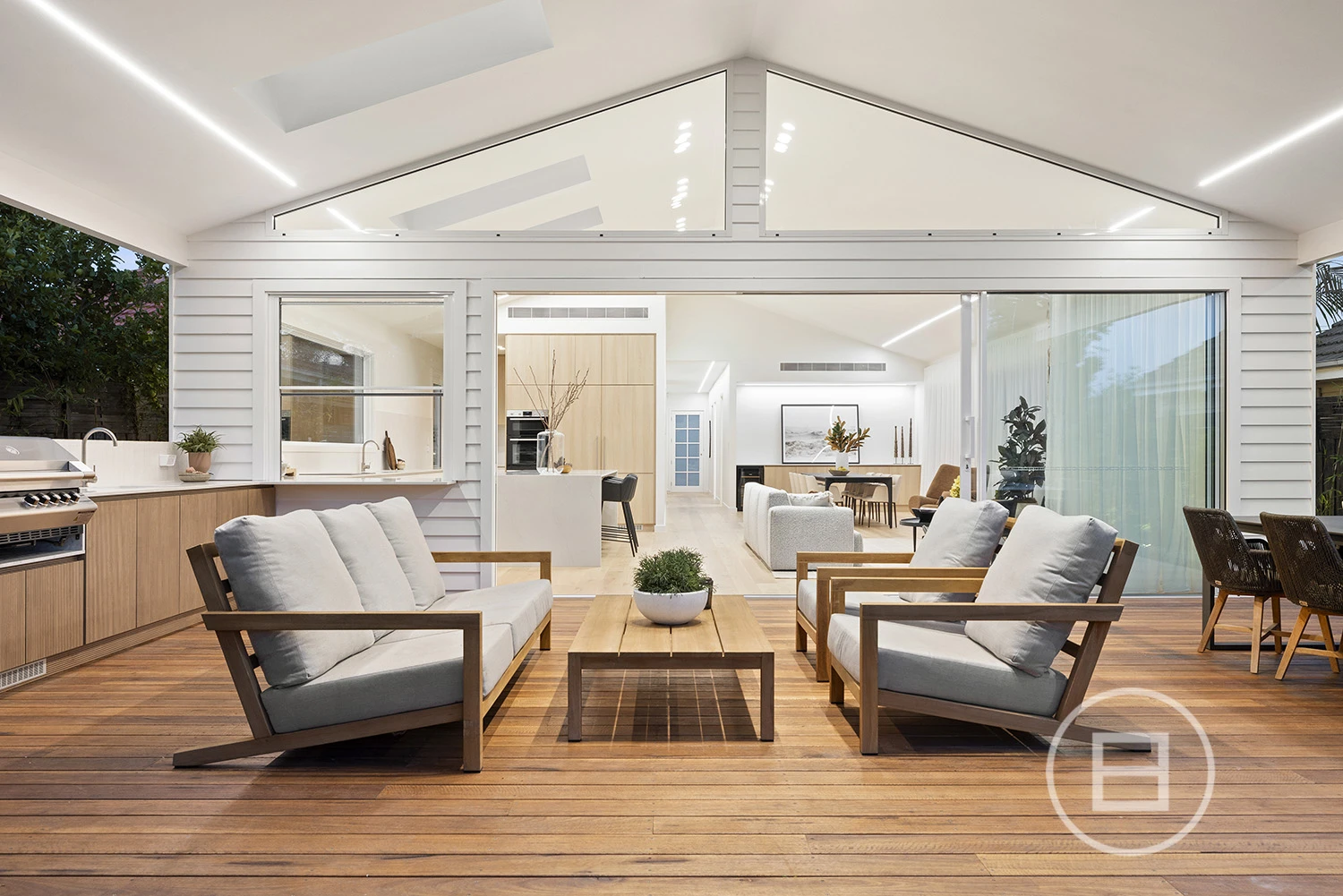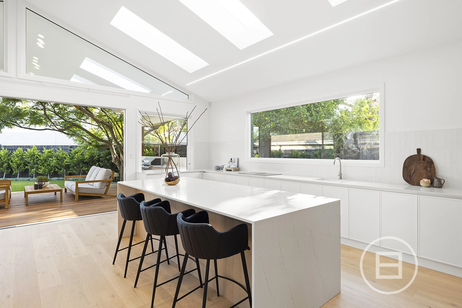 Architectural finishes and exceptional light steal the show once inside, with skylit-cathedral ceilings, engineered oak underfoot, and full-length sheers, adding softness to the bold, clean lines. Three distinct living areas, a fitted home office, and two ensuite bedrooms—including a luxe main upstairs with WIR and a ground-floor guest room with ensuite access—mean everyone has unique space. And when it’s time to turn it up a notch for entertaining, the open-plan living zone spills straight onto the deck and landscaped gardens, where long afternoons roll into balmy nights with a Zeigler & Brown plumbed-in gas BBQ taking centre stage in the outdoor kitchen.