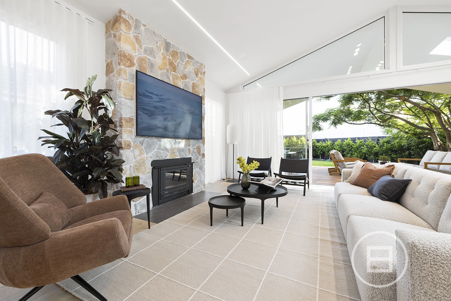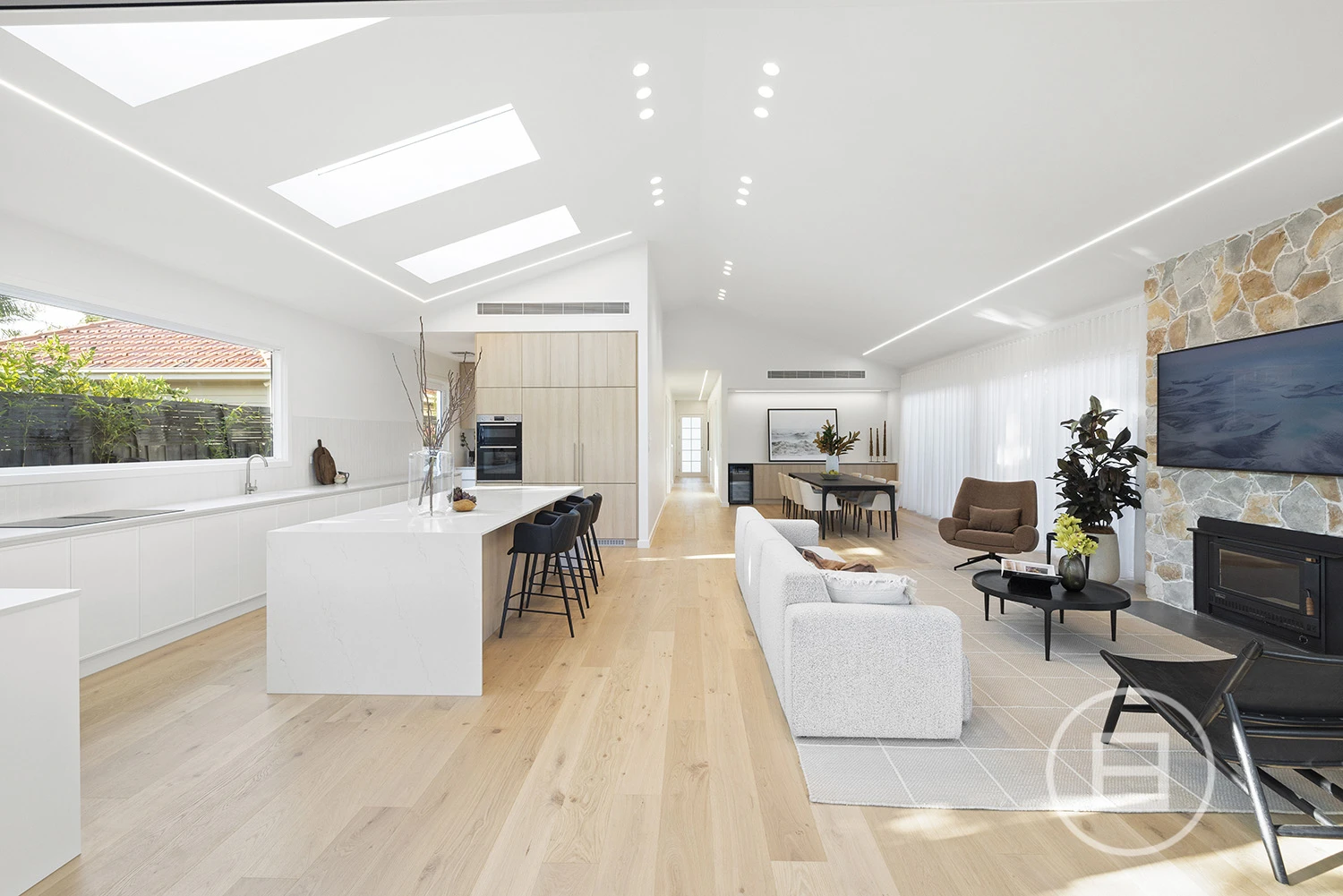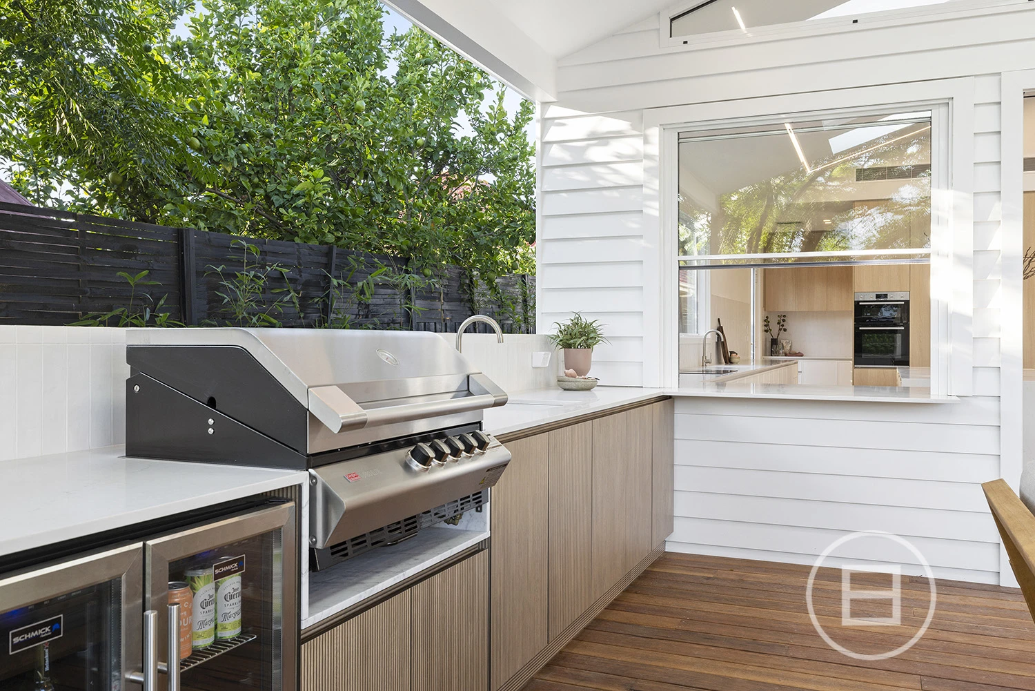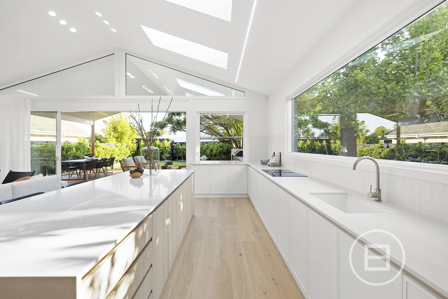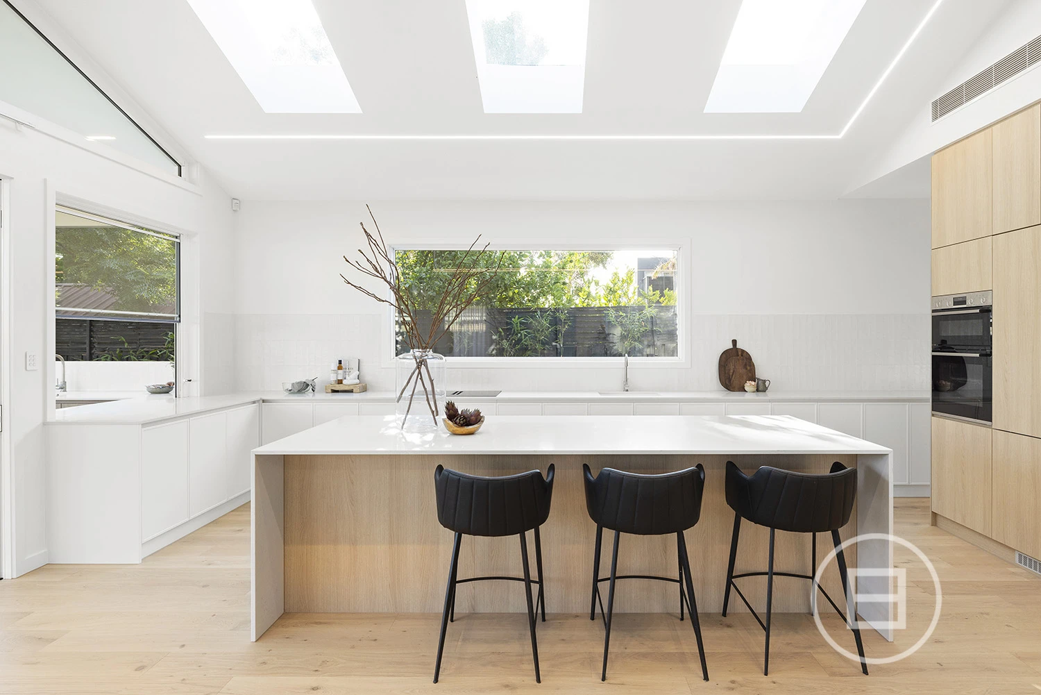 Architectural finishes and exceptional light steal the show once inside, with skylit-cathedral ceilings, engineered oak underfoot, and full-length sheers, adding softness to the bold, clean lines. Three distinct living areas, a fitted home office, and two ensuite bedrooms—including a luxe main upstairs with WIR and a ground-floor guest room with ensuite access—mean everyone has unique space. And when it’s time to turn it up a notch for entertaining, the open-plan living zone spills straight onto the deck and landscaped gardens, where long afternoons roll into balmy nights with a Zeigler & Brown plumbed-in gas BBQ taking centre stage in the outdoor kitchen.