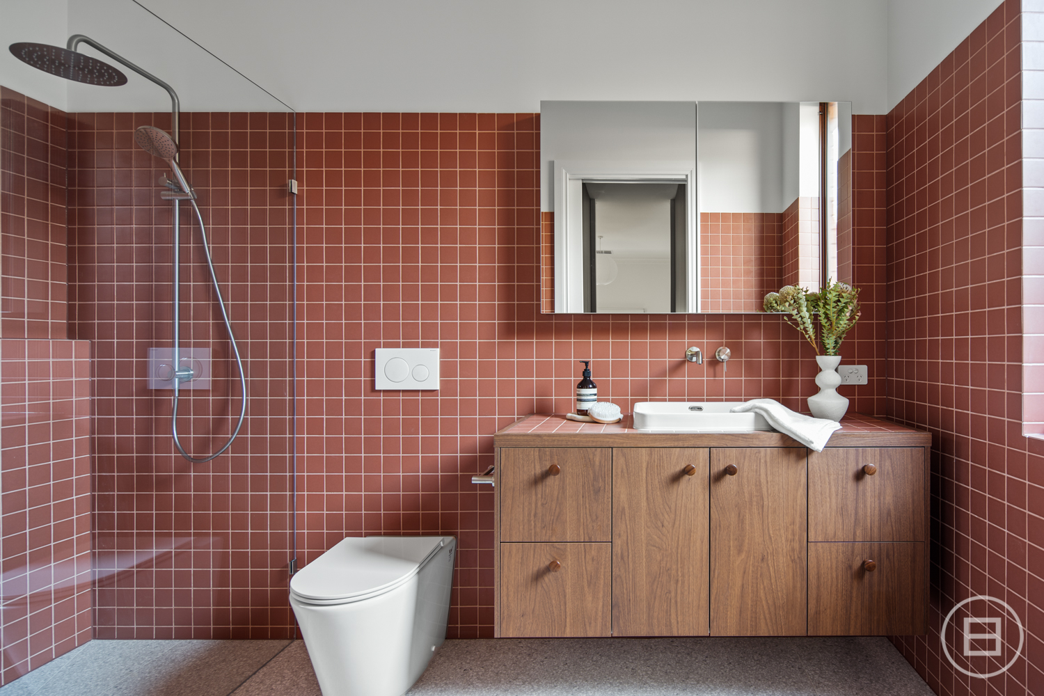 Deep reds and pale blue-greys across bathrooms and laundry. Calacatta Viola in kitchen and entrance. Rich browns of bespoke joinery. Each tone deliberate and distinctive. A magazine feature come to life.