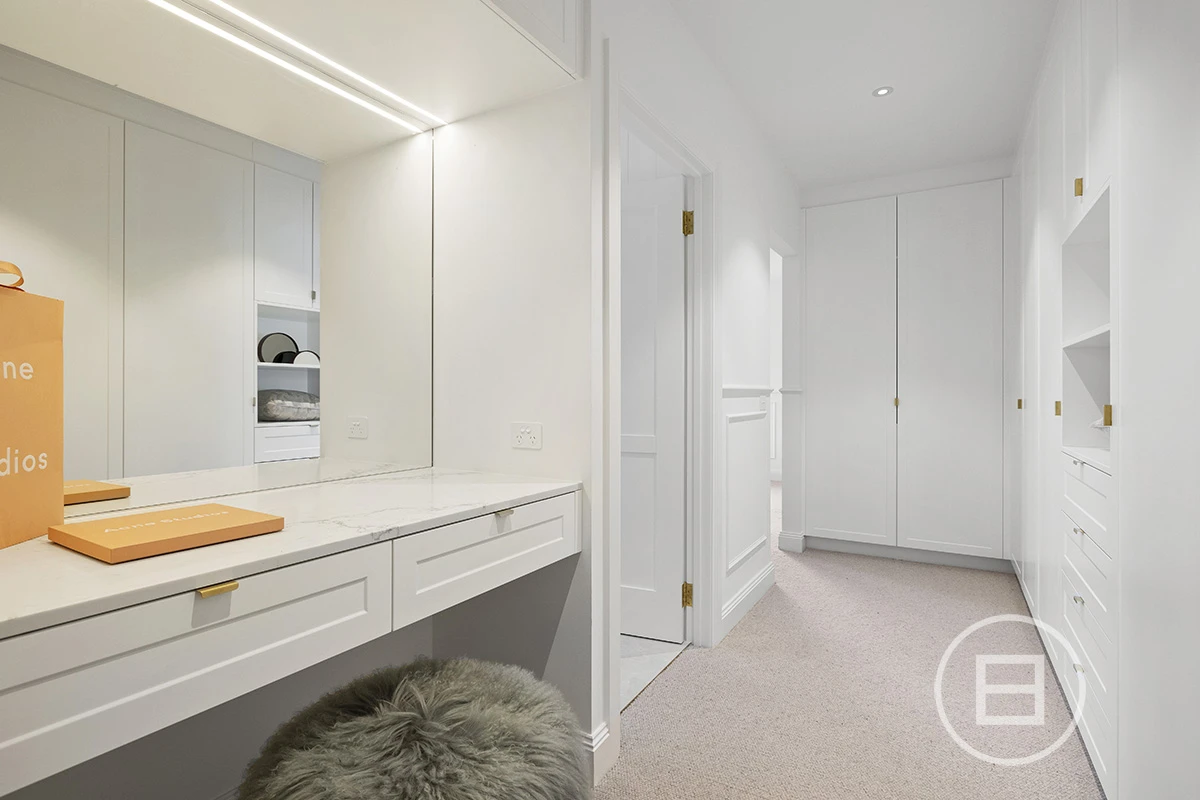 The private parent's retreat includes a decadent walk-in robe with a dressing table and a breathtaking ensuite, with a freestanding bath taking centre stage in the twin-shower wet room. Two additional robed bedrooms are located on the first level beside a second living room, whilst a guest suite downstairs offers easy access to the entry-level bathroom and separate powder room.