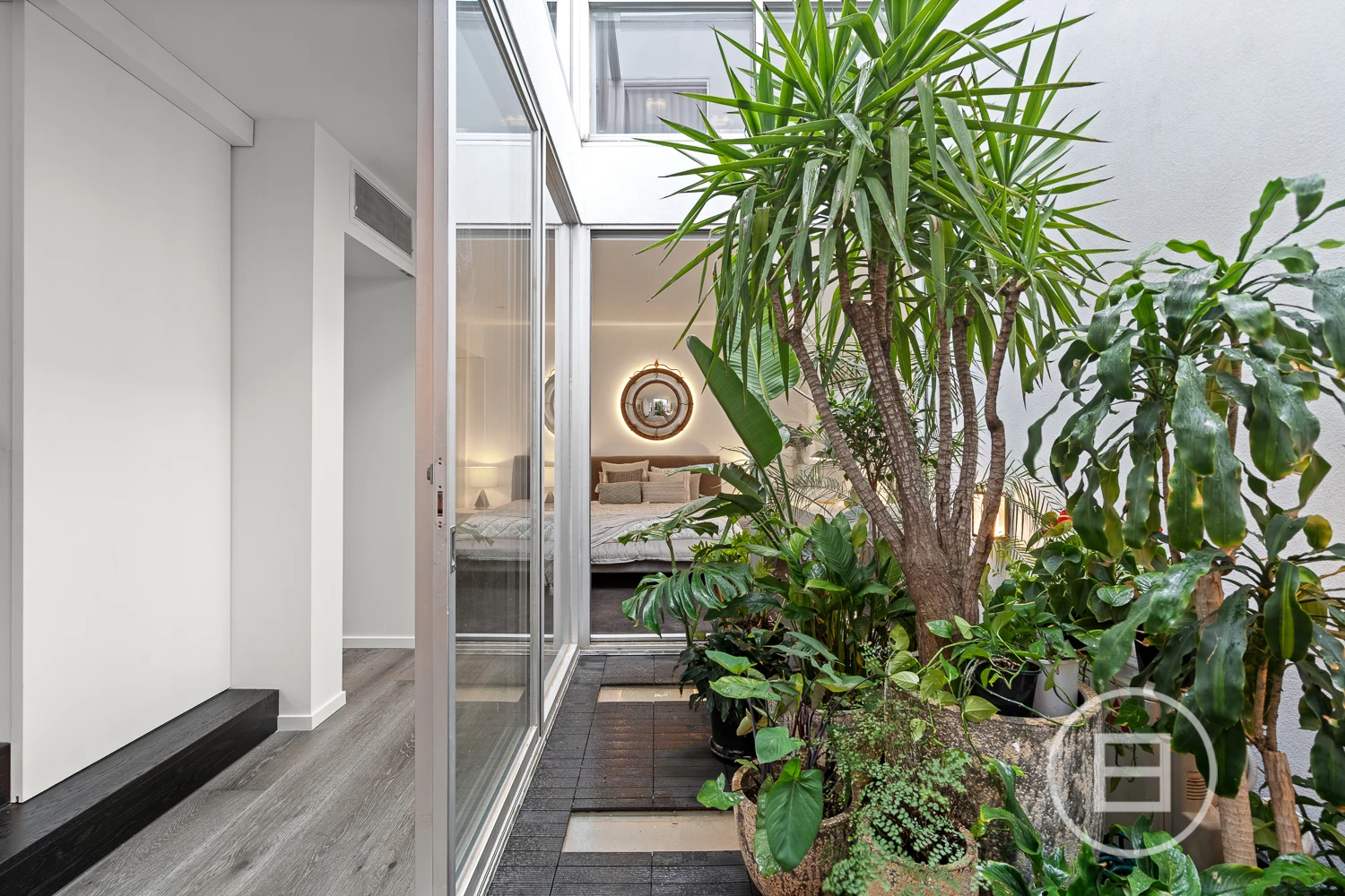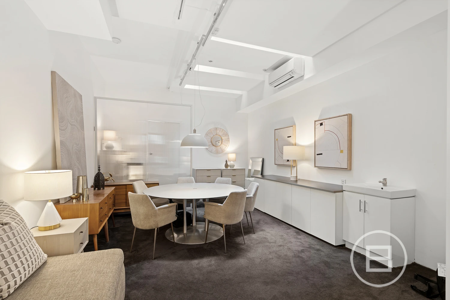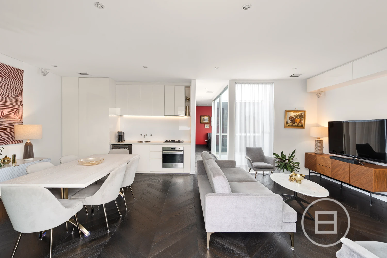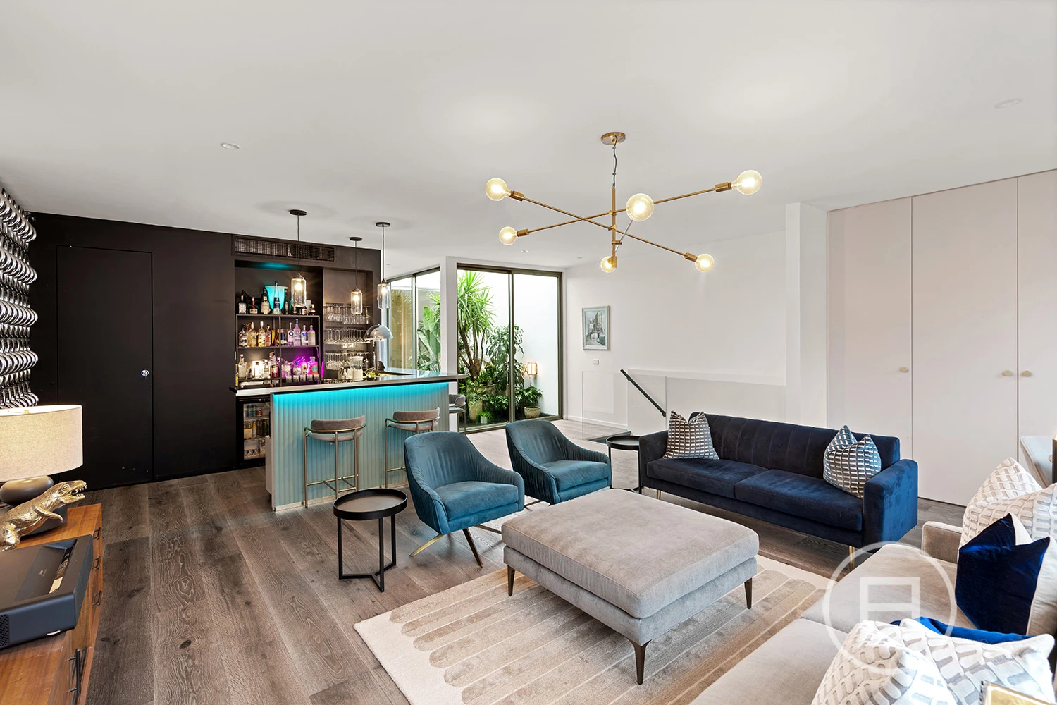 A flexible floor plan rises from a ground-level tandem garage and expansive retail/office/bedroom area with easy scope to rework for any pursuit. Above, a separately lettable office is currently home to a bar and entertainment space brilliant for marquee events, joined on the sunlit second storey by a kitchenette, powder room, garden atrium, and entirely separate guest bedroom with an ensuite and walk-in robe. Effectively its own apartment, a clever third level’s living/dining area, Smeg/Miele kitchen, and mains-gas barbecue terrace combine to be a joy for nights by the fire, morning coffees, and evening cocktails, while extensive storage and a chic ensuite accompany a sumptuous master.
